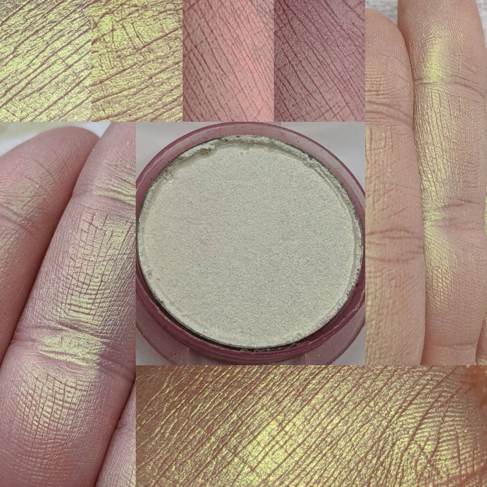 Áine is a transparent multichrome that appears a green tinted white in the pan but bursts into colors once you swipe it onto your skin. That makes this a perfect highlight for the face and eyes, or use it on top of other colors to add some dimension! This shade shifts from Gold, Green, and then to some rose/orange tones. Each pan is magnetic and comes in 26mm size. This is a pressed product, making it easy to apply with your favorite brush or even your finger.