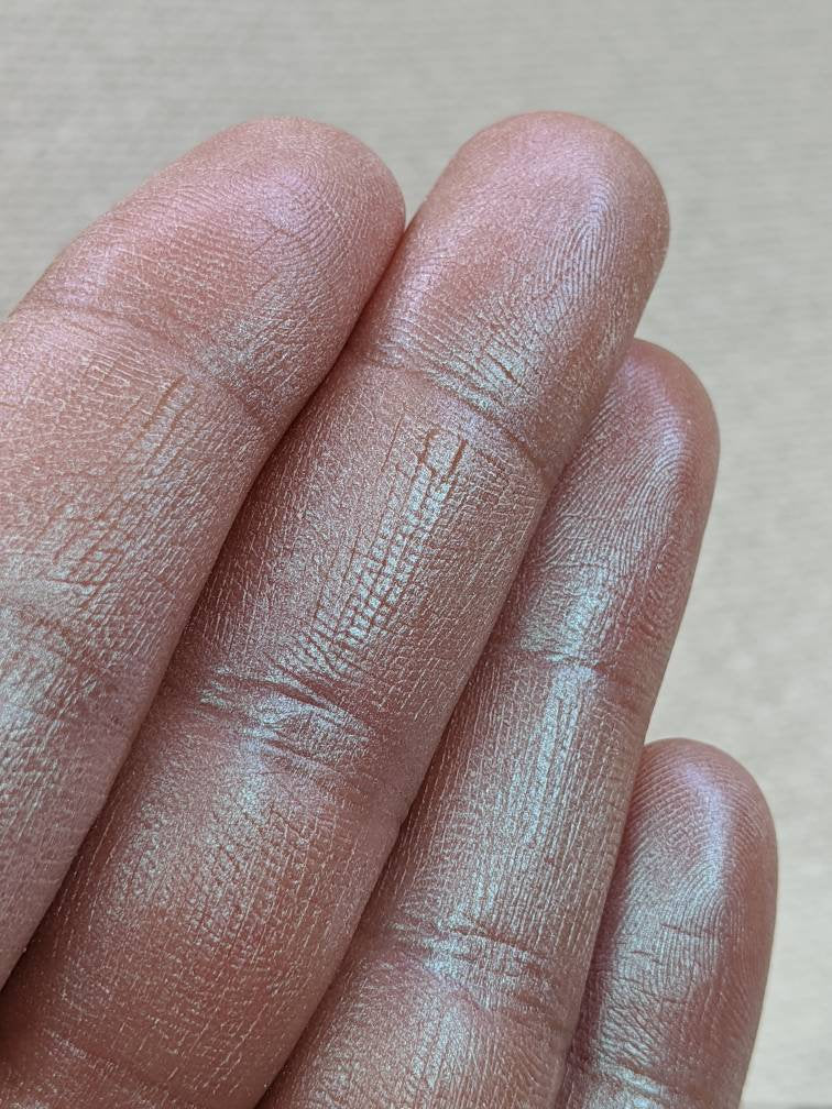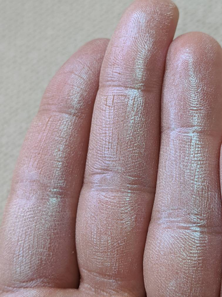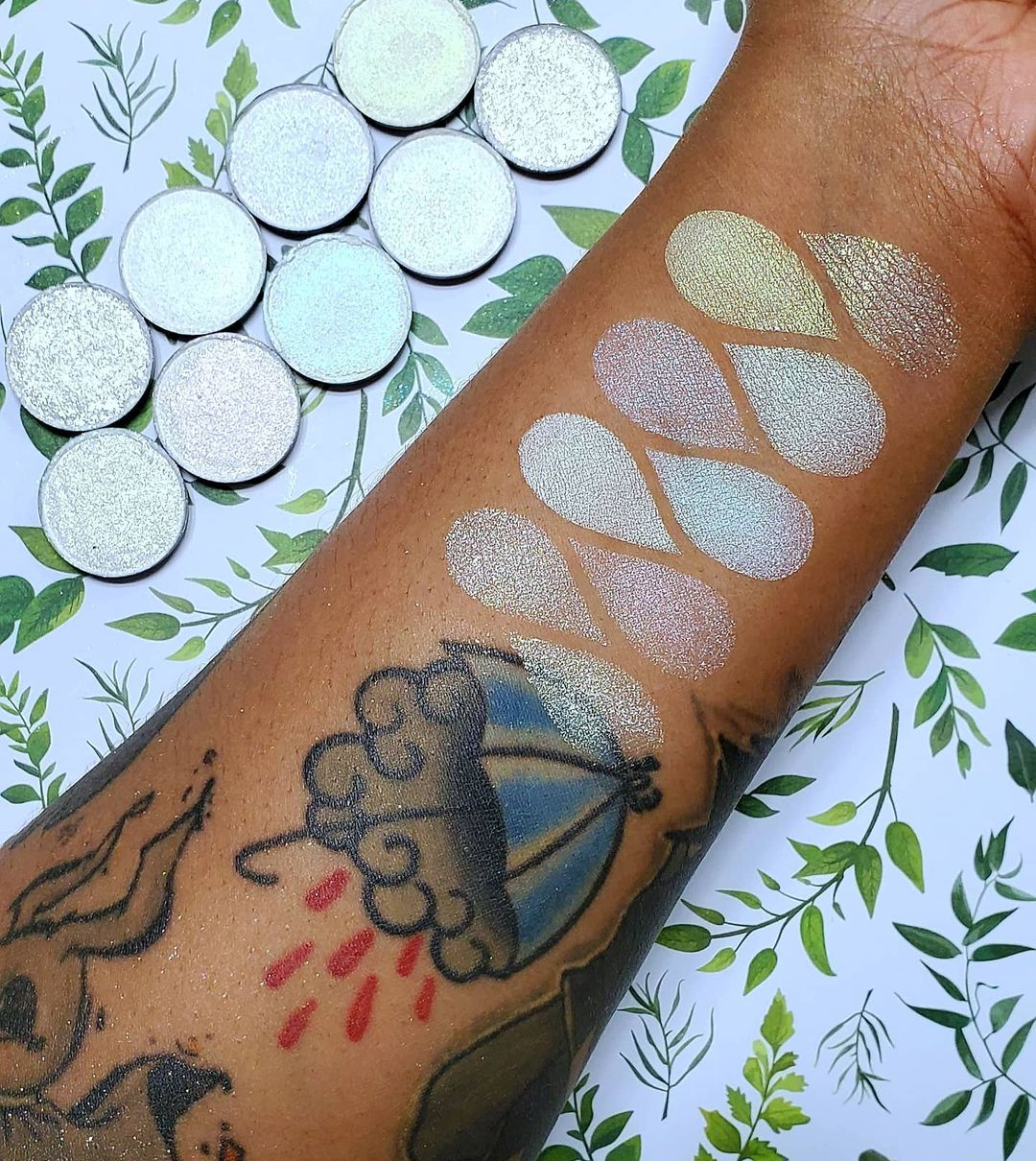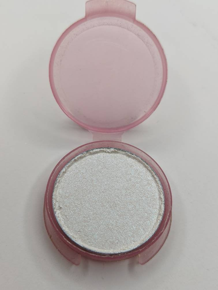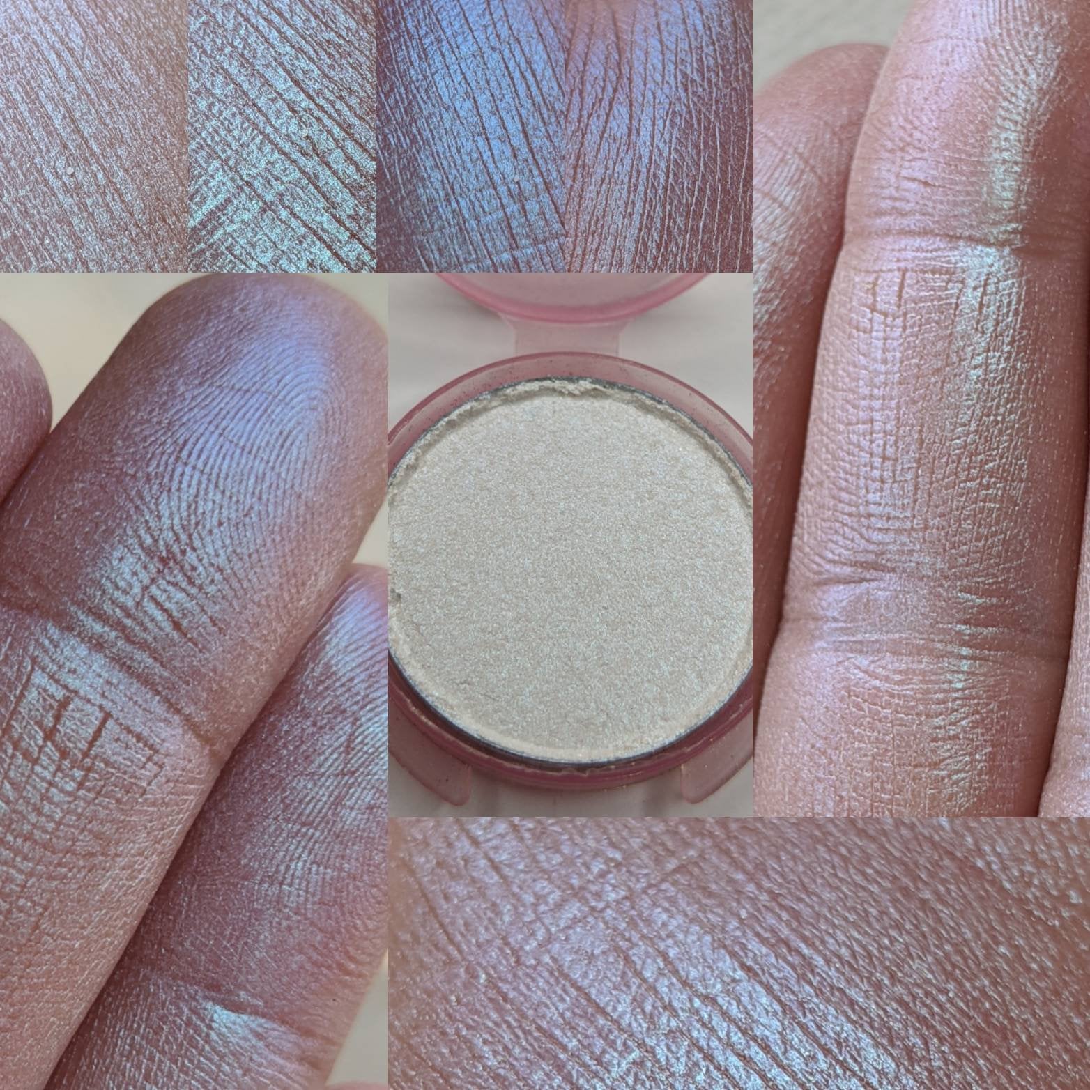 Amphitrite is a transparent multichrome that appears a blue tinted white in the pan but bursts into colors once you swipe it onto your skin. That makes this a perfect highlight for the face and eyes, or even use it ontop of other colors to add some dimension! This shade shifts from green into various shades of blue and violet. Each pan is magnetic and comes in 26mm size. This is a pressed product, making it easy to apply with your favorite brush or even your finger.
