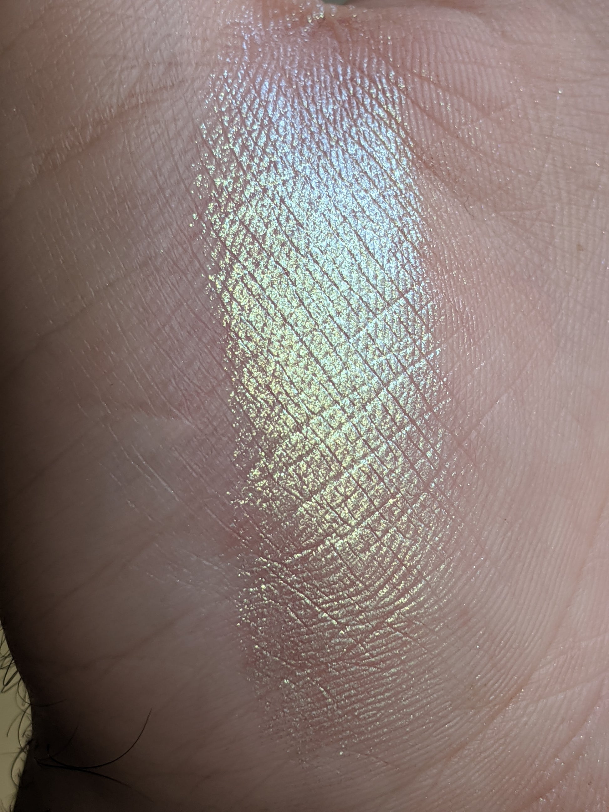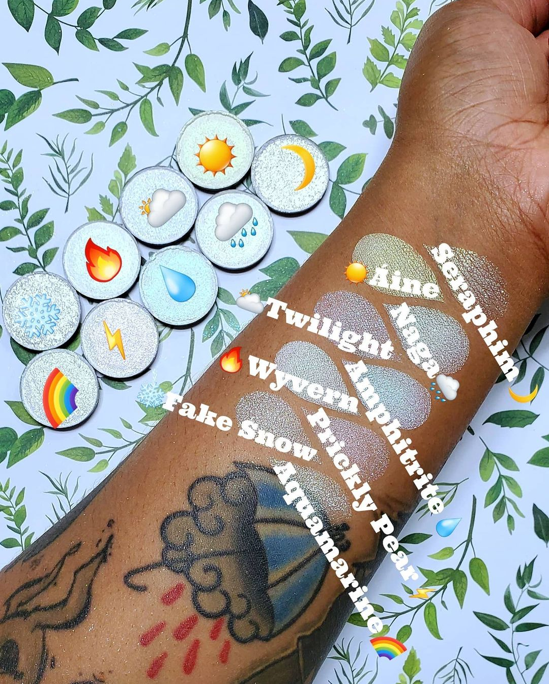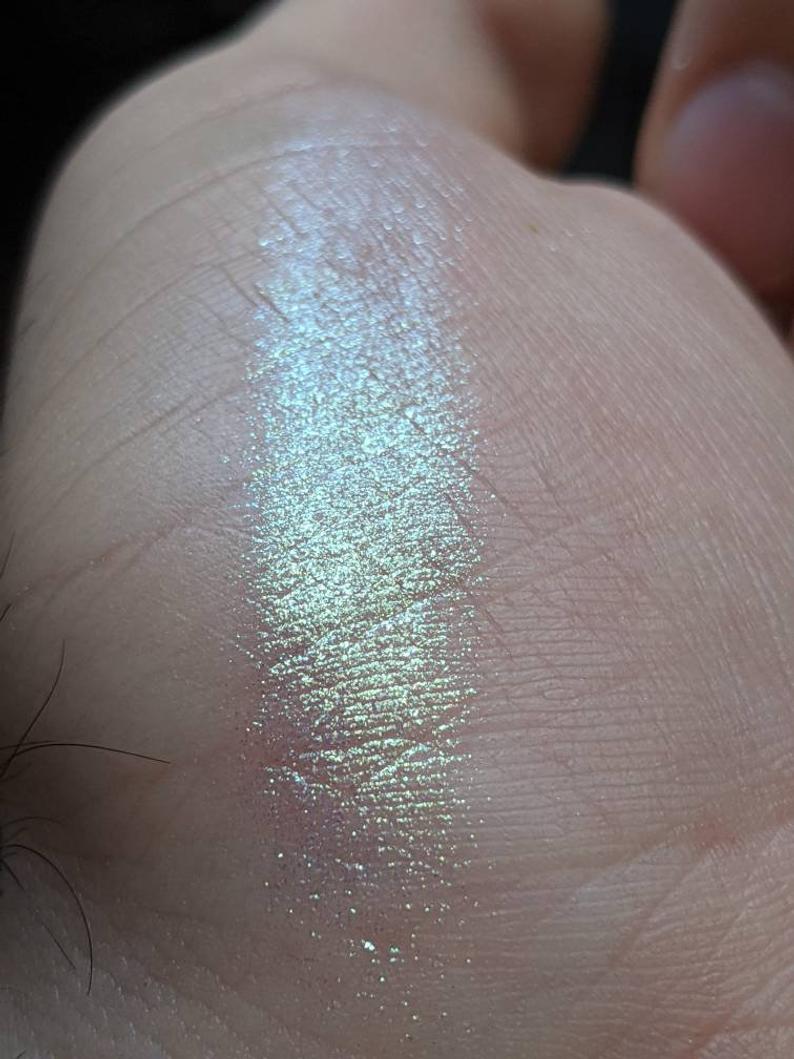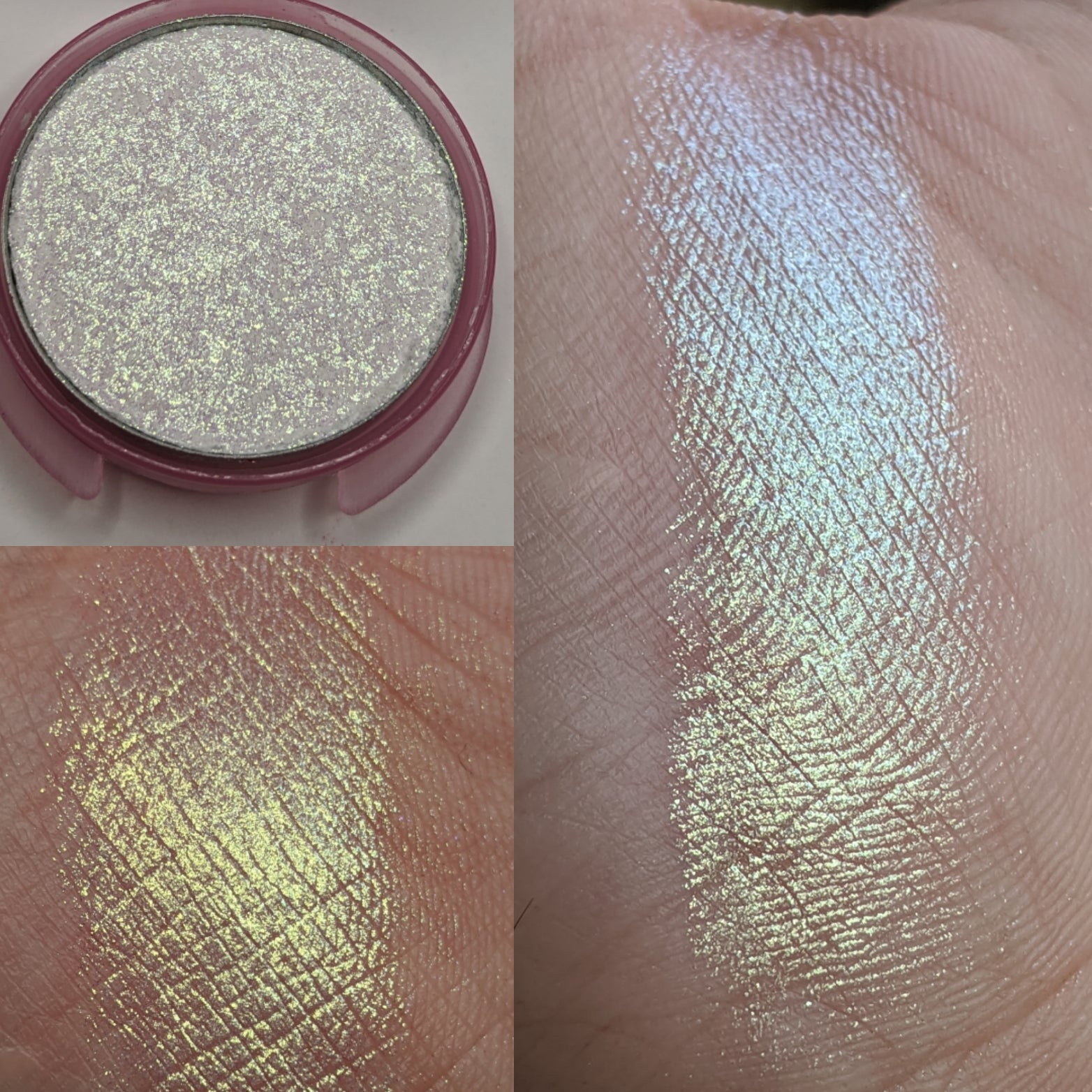 Aquamarine is a gorgeous and sparkly multichrome that shifts between shades of blue, green, cyan, and gold! Seraphims younger sibling but with a smaller particle size and a brighter blue shift. The pigment used in this shade is composed of highly transparent flake crystals coated with Titanium Dioxide. Because of the transparency this shade can work as an eyeshadow topper, or even an eye catching highlighter! Each pan is magnetic and comes in 26mm size. This is a pressed product, making it easy to apply with your favorite brush or even your finger, tho I recommend a finger application to help maintain the sparkles.