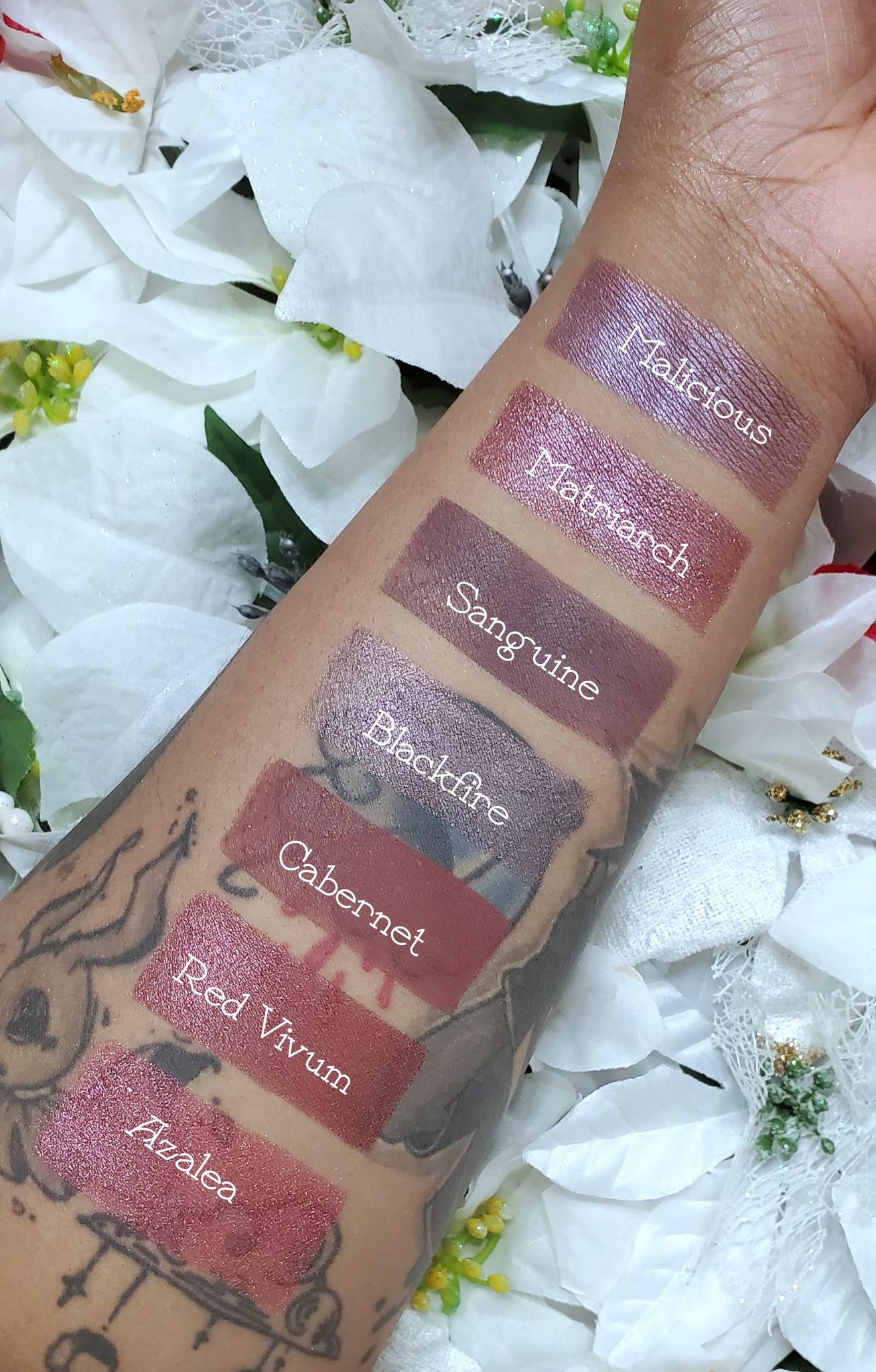 Azalea is a gorgeous deep red color that appears mostly red, but shines with a a slight darker-pink tone. Each eyeshadow pan is magnetic and comes in 26mm, the size of a quarter. This is a pressed product, making it easy to apply with your favorite brush or even your finger.
