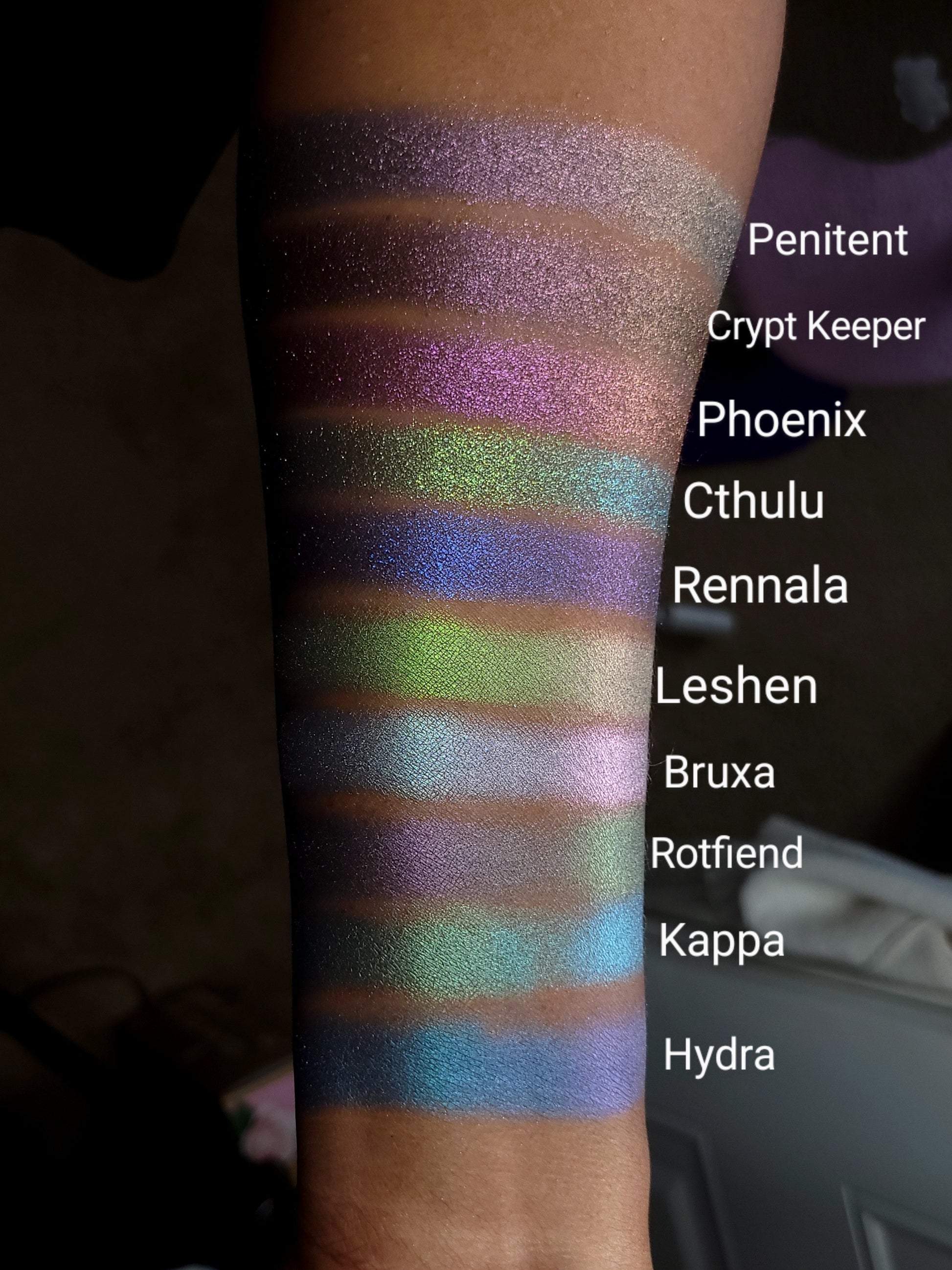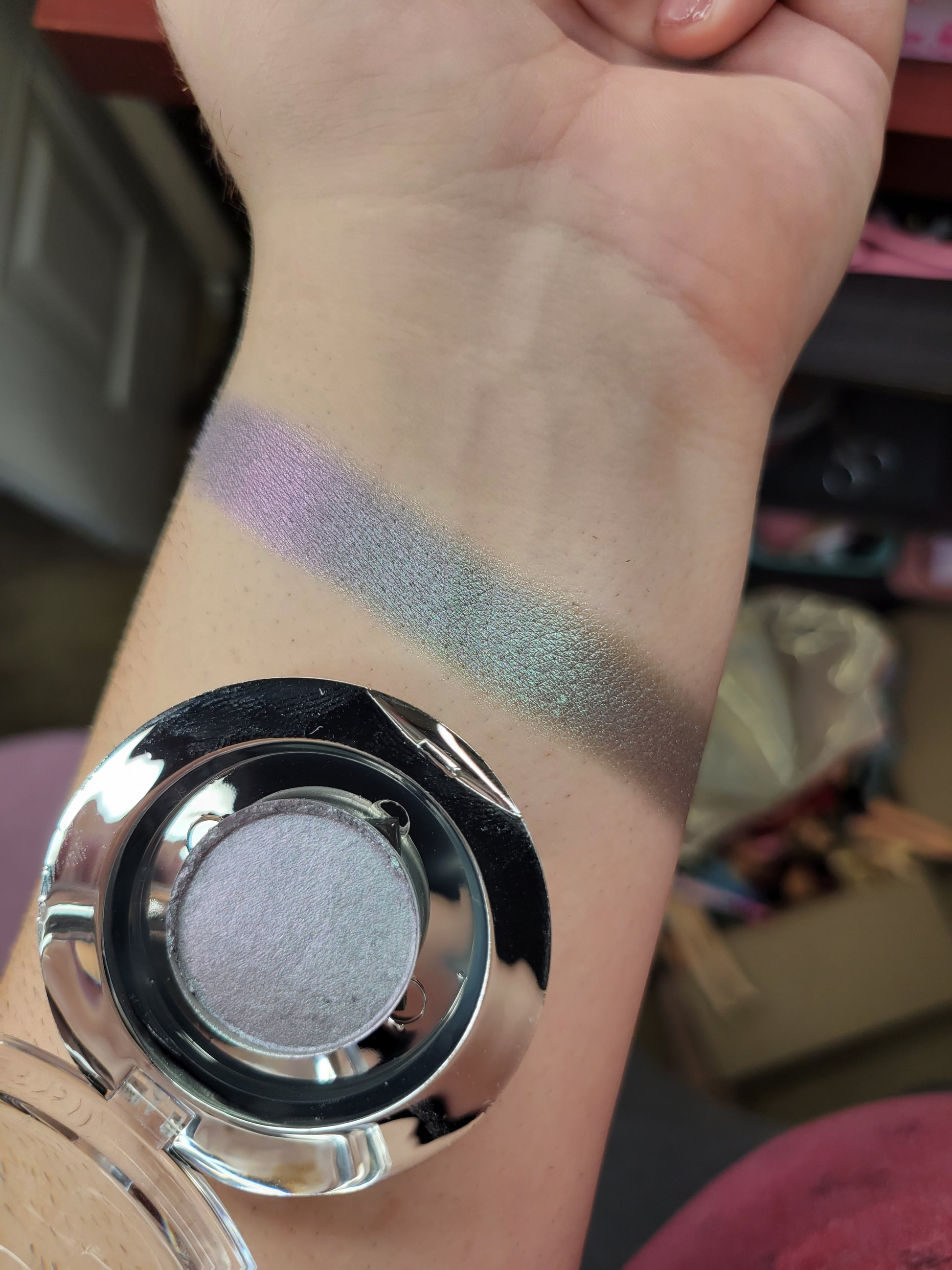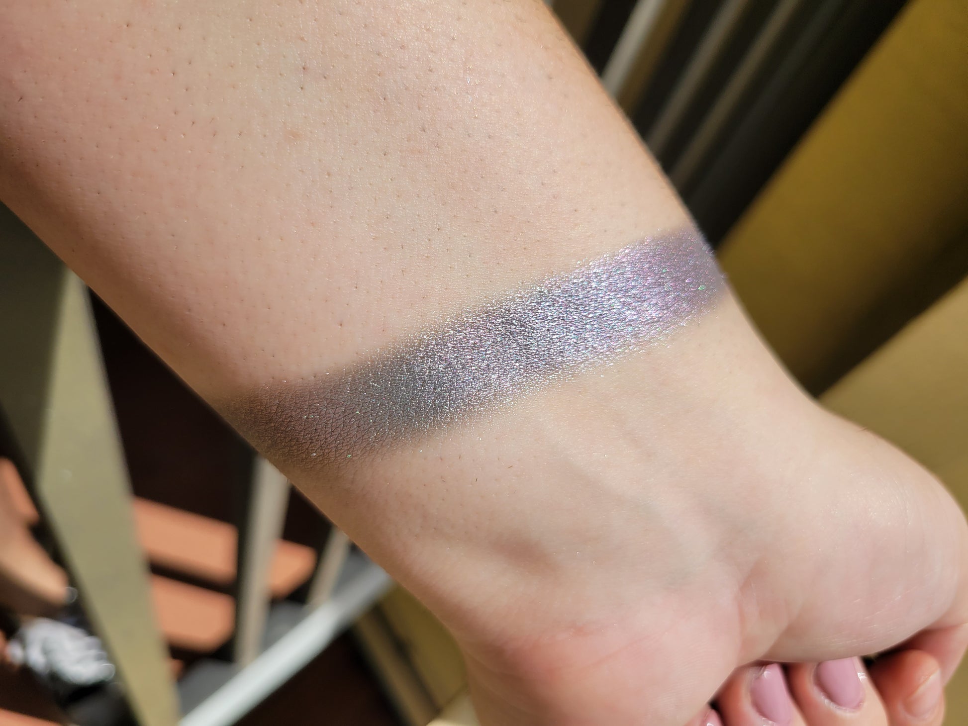Bruxa is a satin multichrome with a blackened base that shifts from a green, silver, and a pinkish red. Each pan is magnetic and comes in 26mm size. This is a pressed product, making it easy to apply with your favorite brush or even your finger.