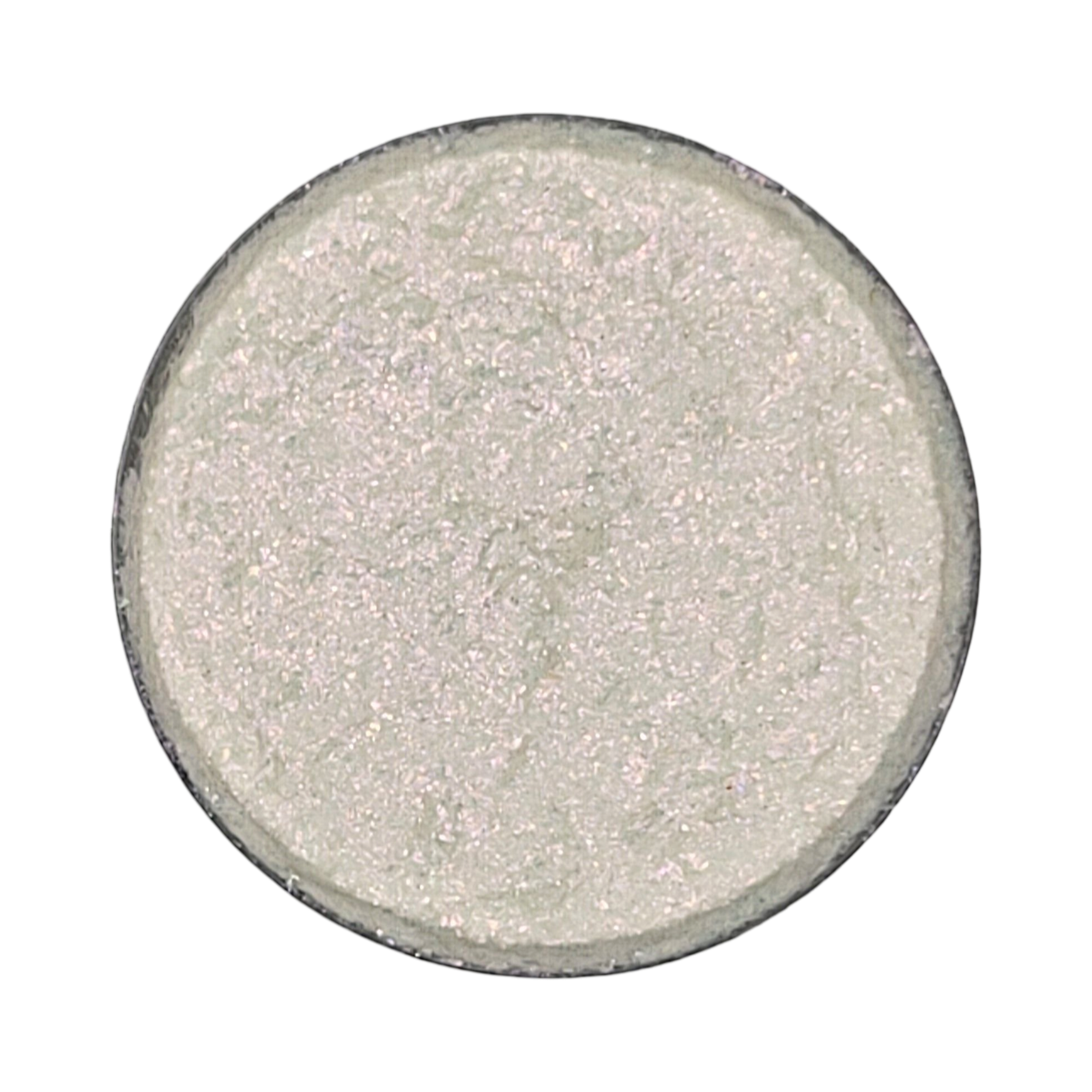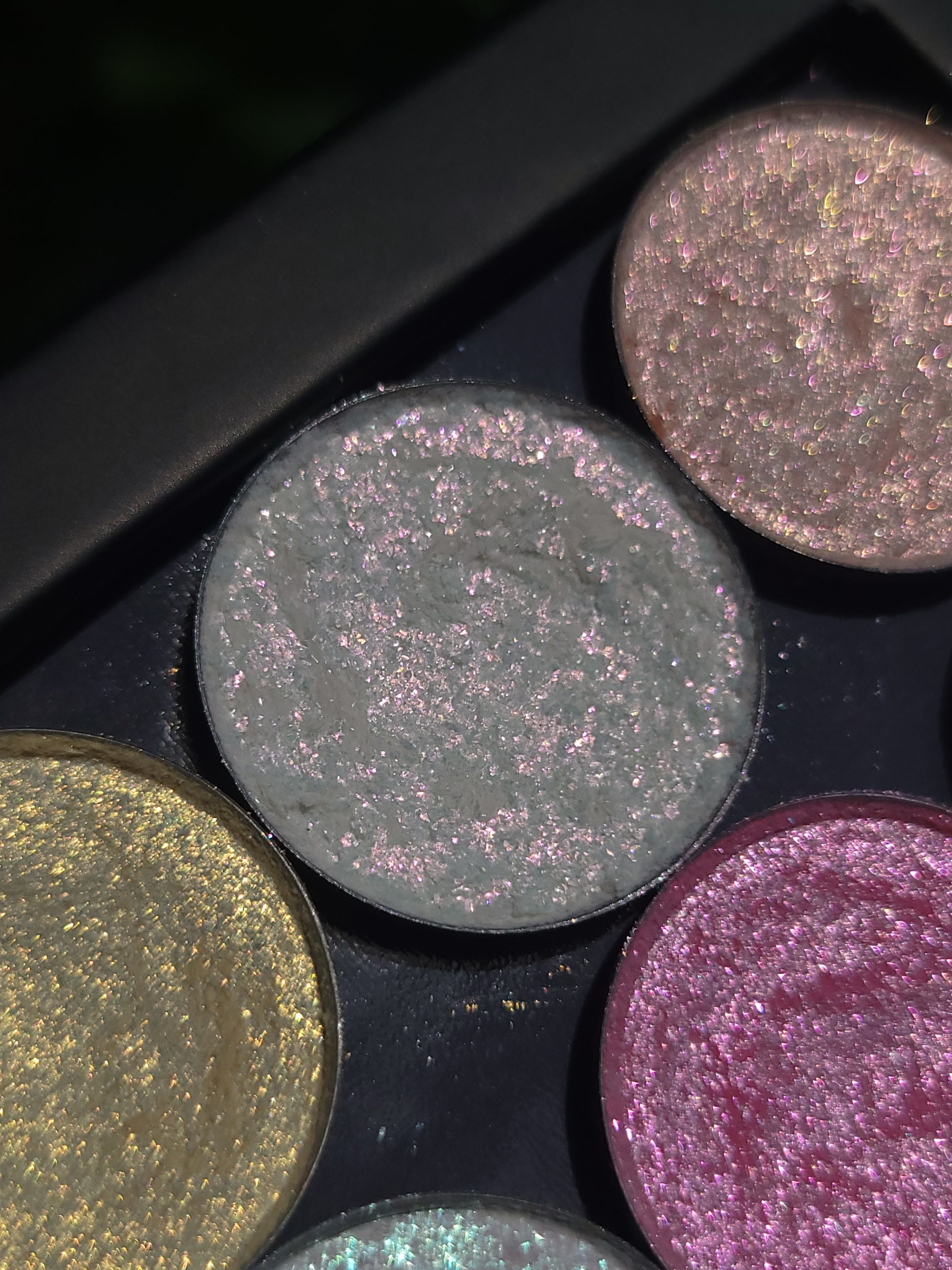 These shimmers are larger in particle size then your typical shimmers and have some texture to them, but smooth onto the skin beautifully. A primer/base is always recommended when using eyeshadows with a larger particle size such as these (Frosted Blueberry, Powdered Sugar, That's Rad, iM sO rAnDoM, Doom Doom Doom, ZOMG). Due to the larger particle size, please use caution when using around the eye area as you would a pressed glitter. But please note these eyeshadows do not contain any glitter and use both natural and synthetic mineral based pigments to achieve that sparkly effect. :)