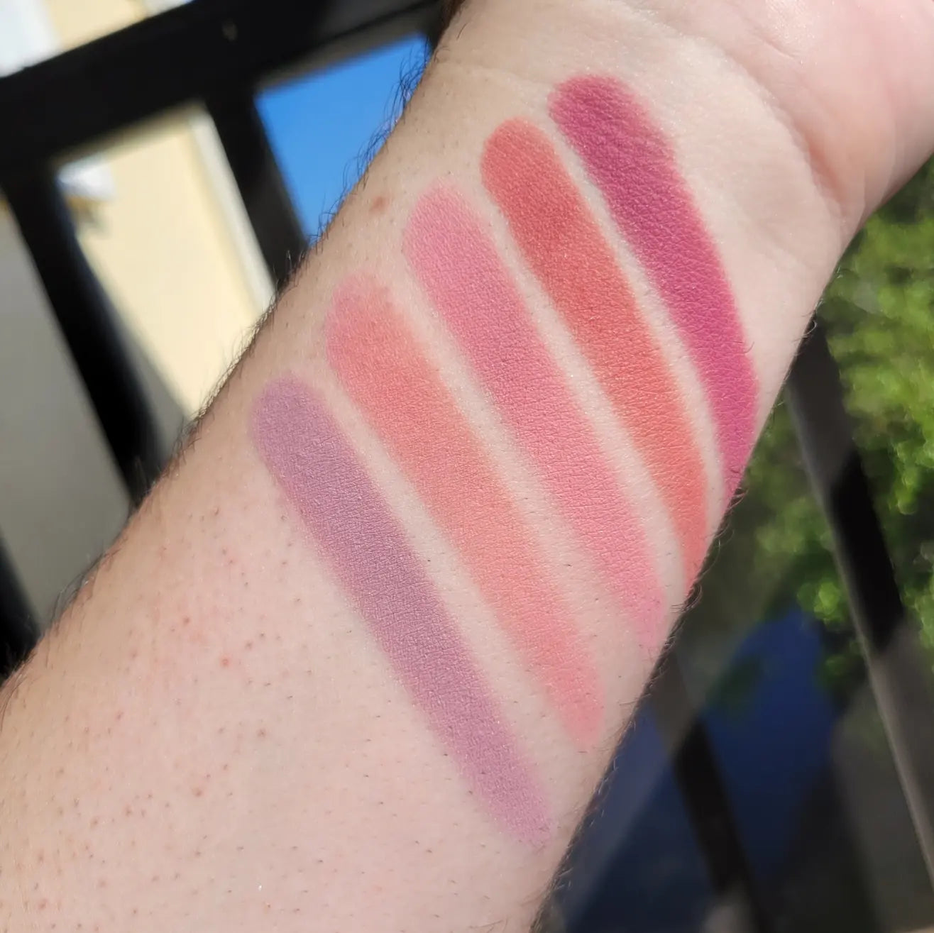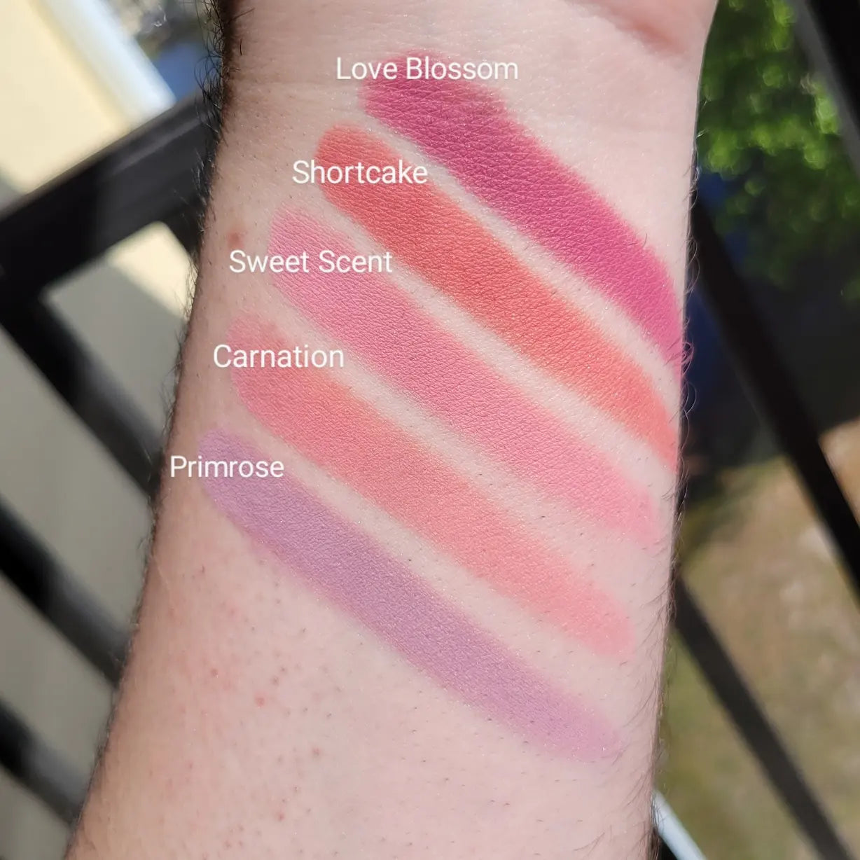 Ingredients: Sericite Mica, Carnauba Wax, Zinc Stearate, Silica Microspheres, Magnesium Myristate, Isopropyl Myristate, Dimethicone, Dimethicone Copolymer, Red40, Ultramarines