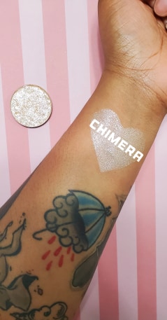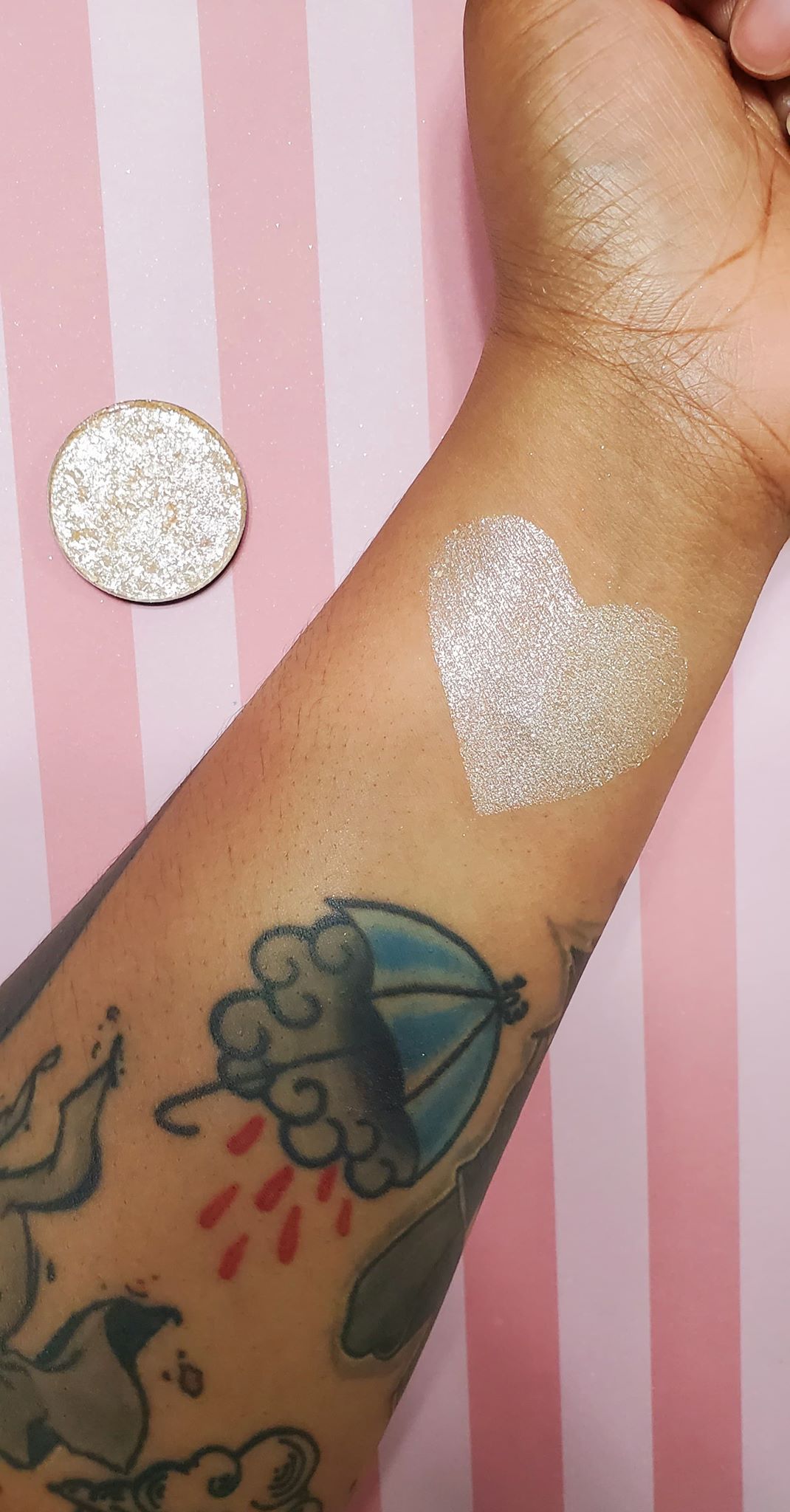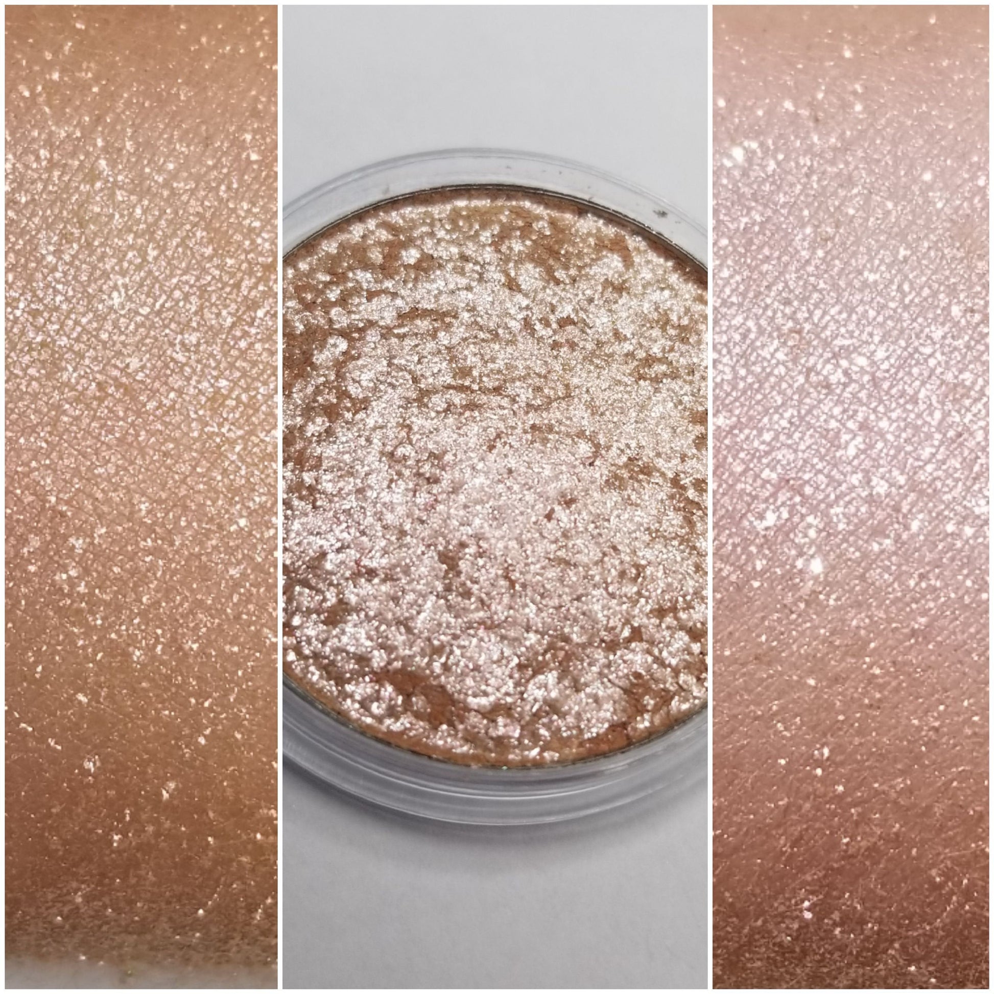 Chimera is a stunning sparkly champagne highlighter with tints of red when shifted at certain angles. Also has plenty of pigment and glow to double as an eye shadow! These highlighters have the look and feel of a flakey type glitter, but without the plastic and much softer! Because of how sparkly these are, I recommend using your finger to apply and then blending out with a brush, however a brush by itself will still work just fine!