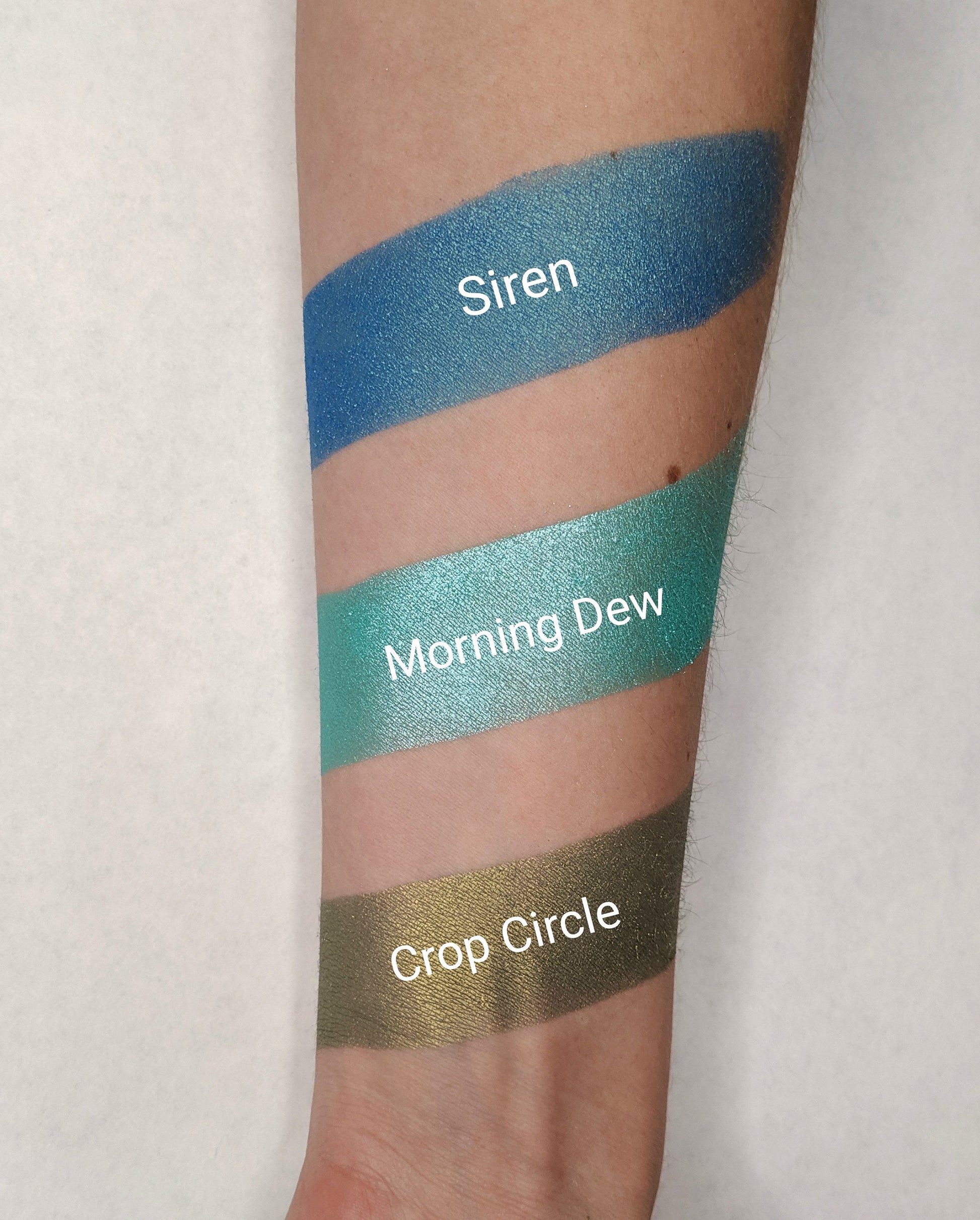 Crop circle is a beautiful green duochrome with a bright gold reflection! Each eyeshadow pan is magnetic and comes in 26mm, the size of a quarter. This is a pressed product, making it easy to apply with your favorite brush or even your finger.