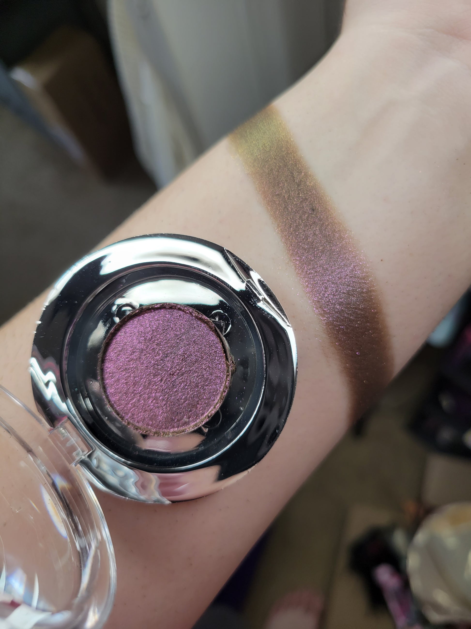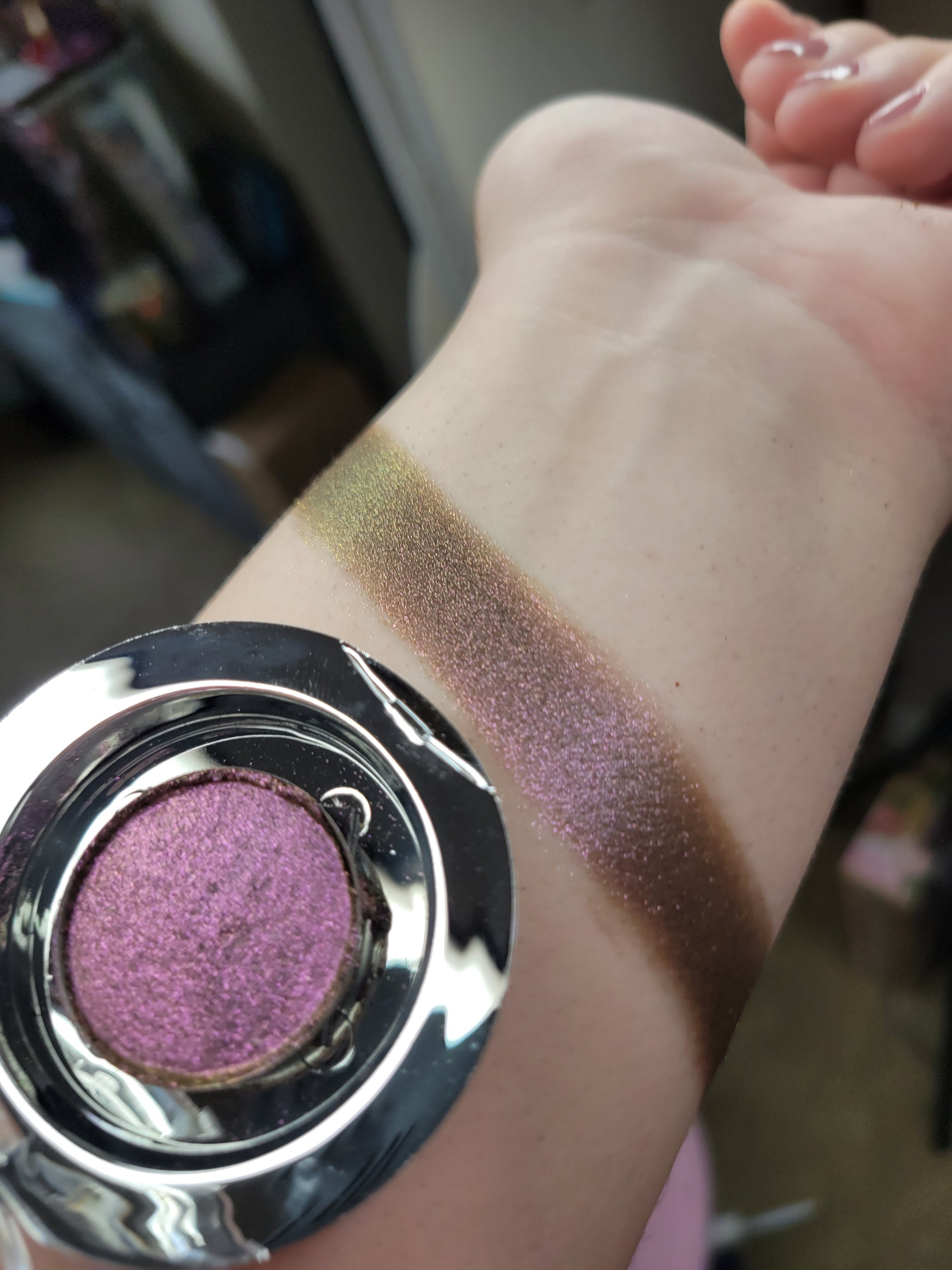 Crypt Keeper is a sparkly multichrome with a blackened base that shifts from a Violety red, brown, and green. Each pan is magnetic and comes in 26mm size. This is a pressed product, making it easy to apply with your favorite brush or even your finger.