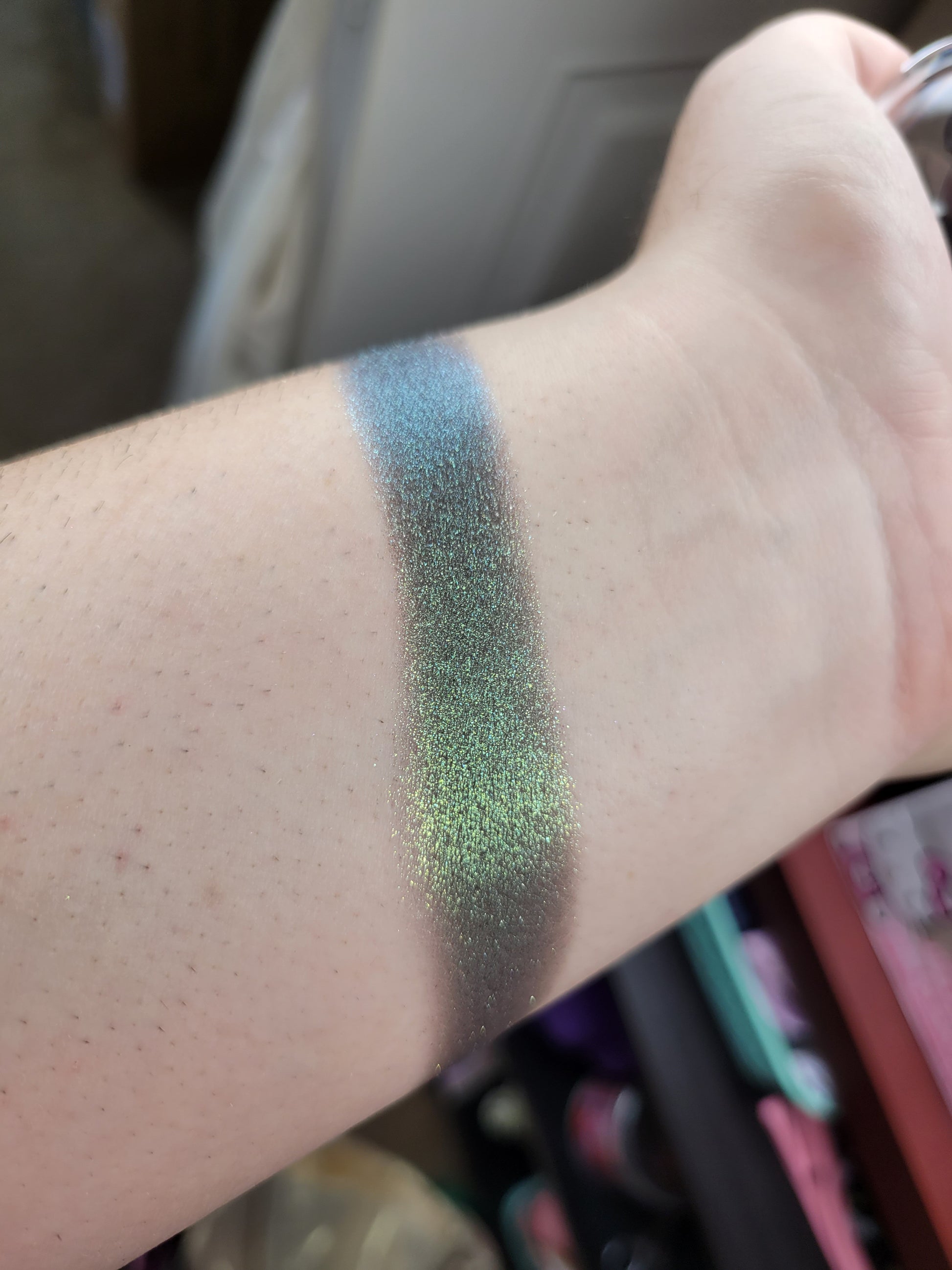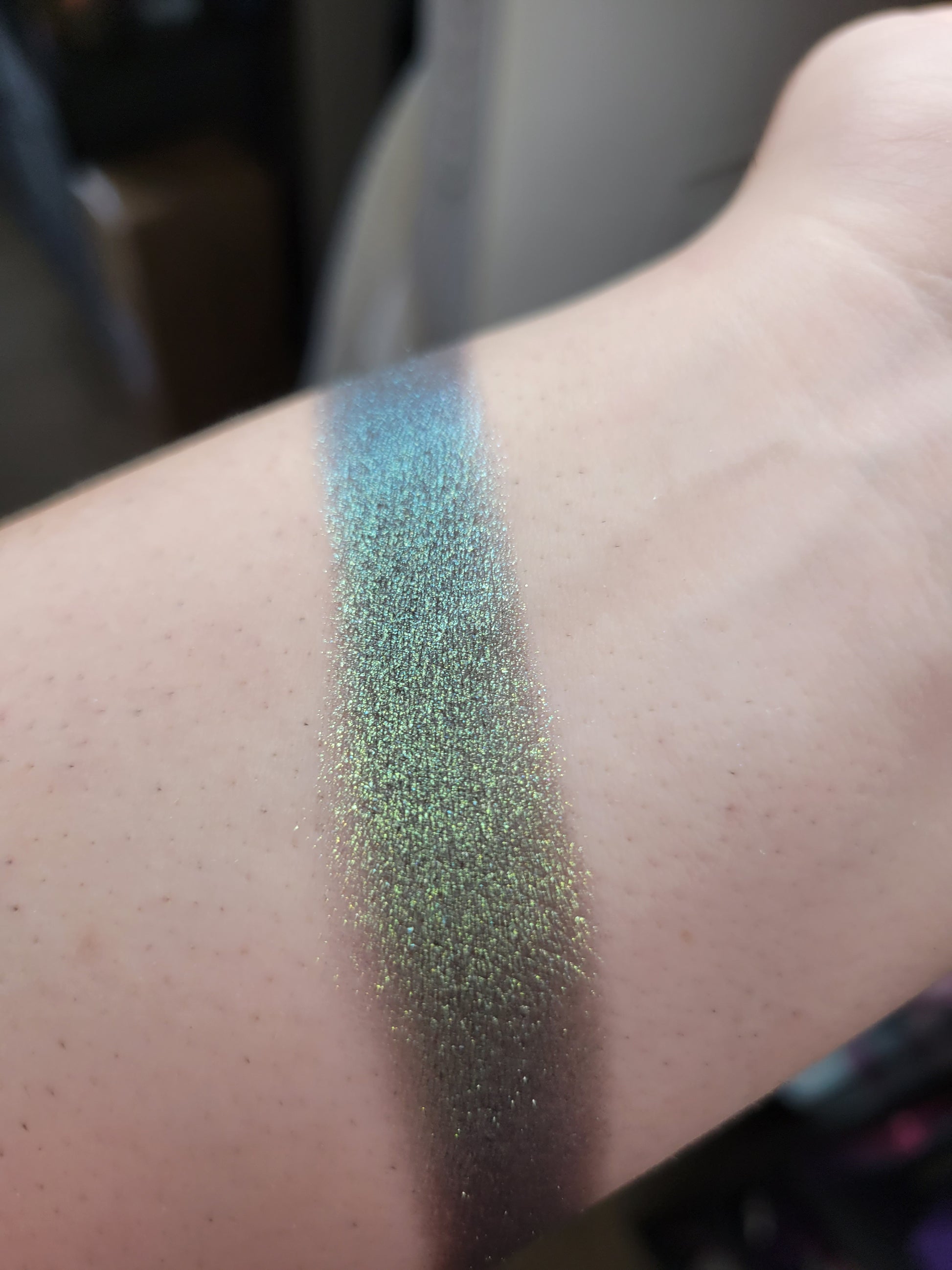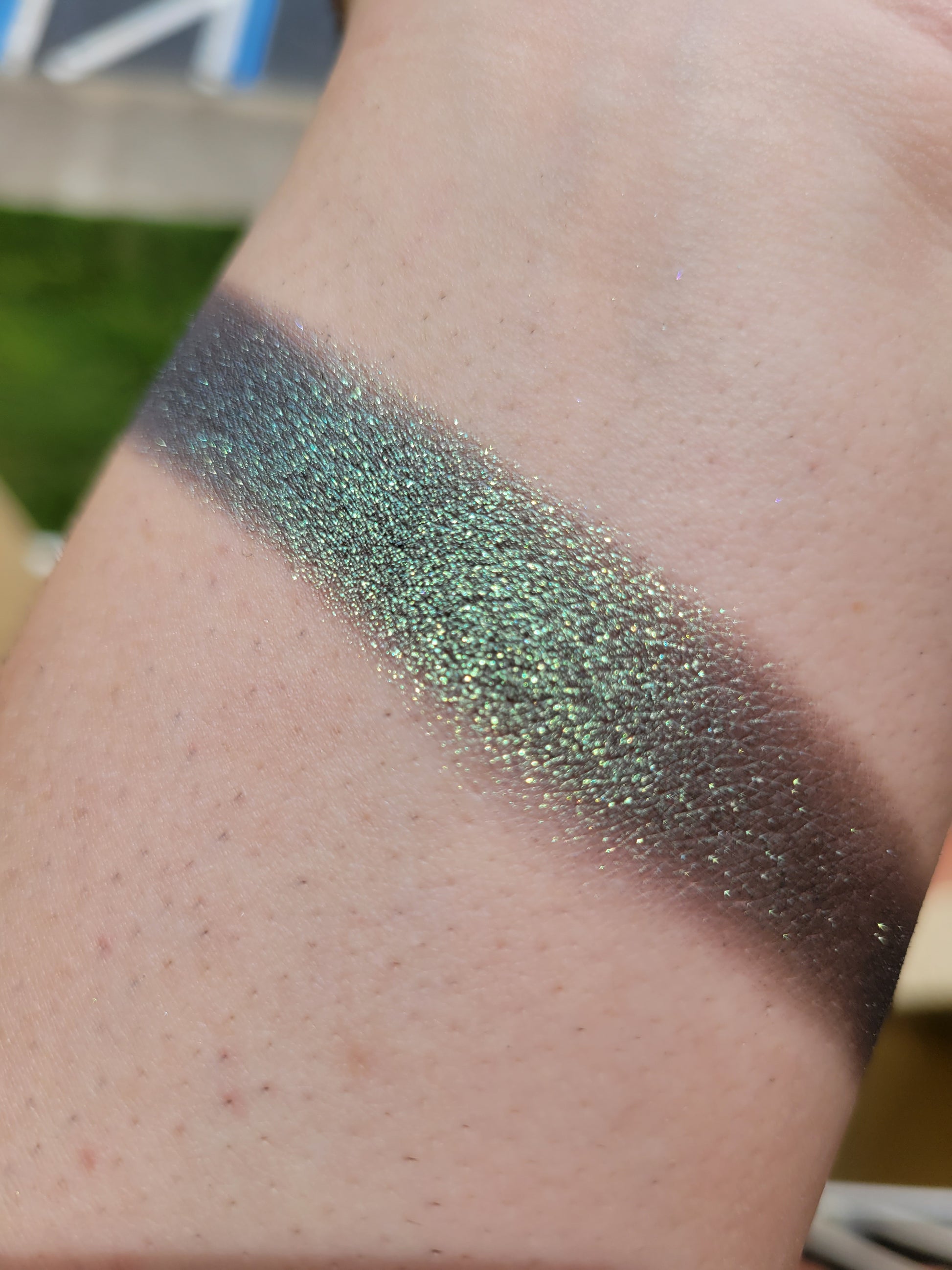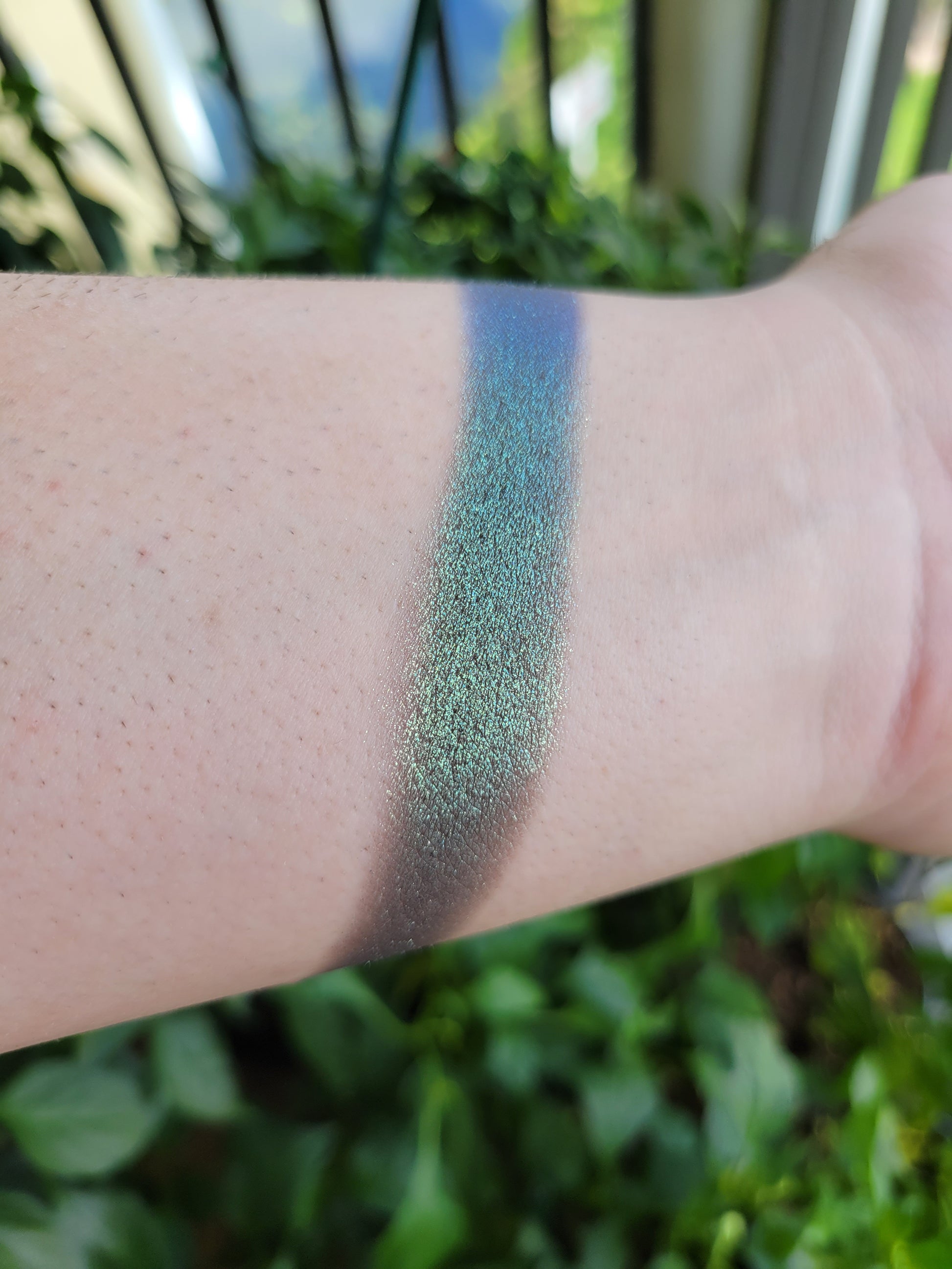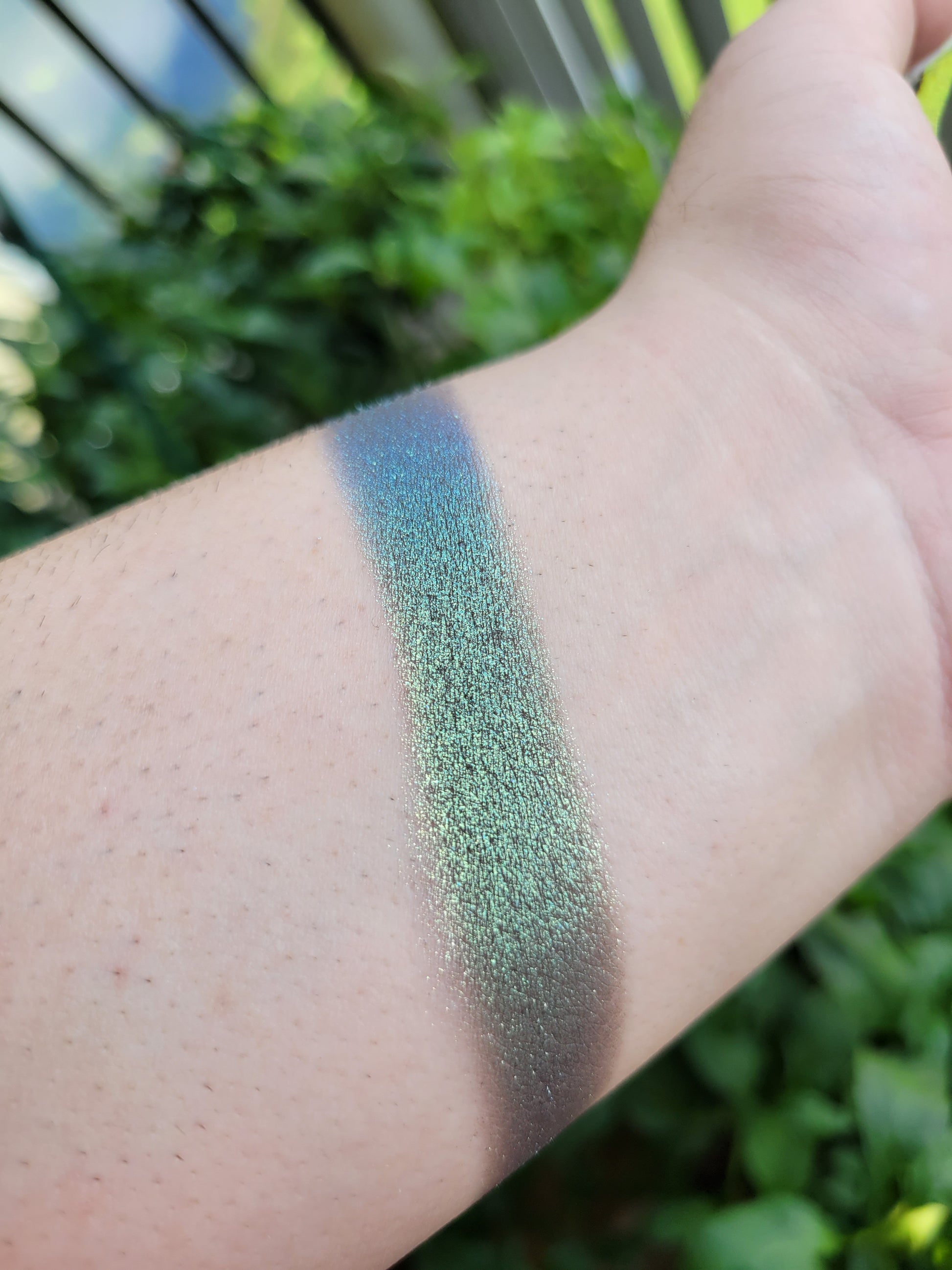 Cthulhu is a sparkly multichrome with a blackened base that shifts from a Gold, Green, and Blue/cyan. Each pan is magnetic and comes in 26mm size. This is a pressed product, making it easy to apply with your favorite brush or even your finger.
