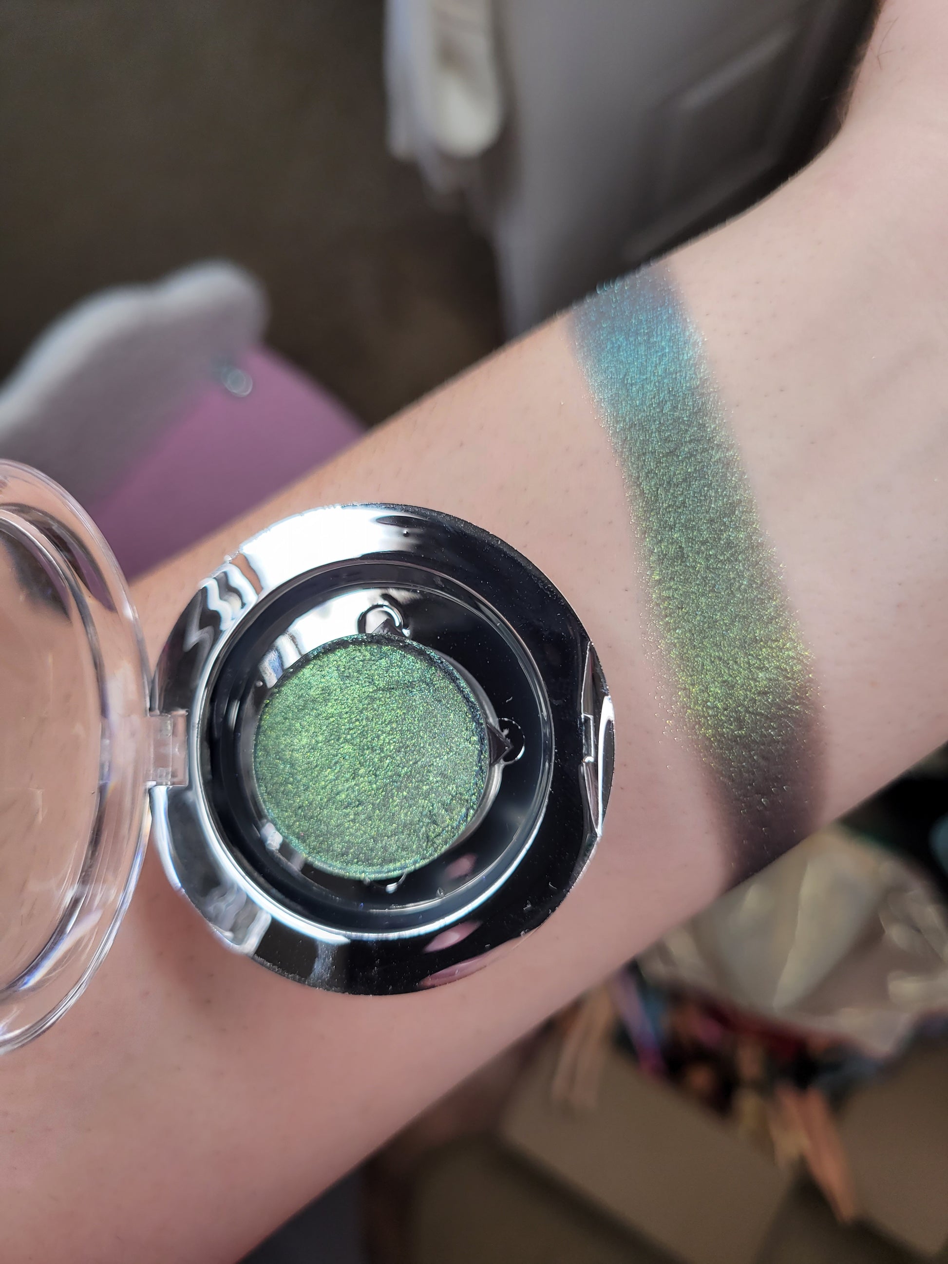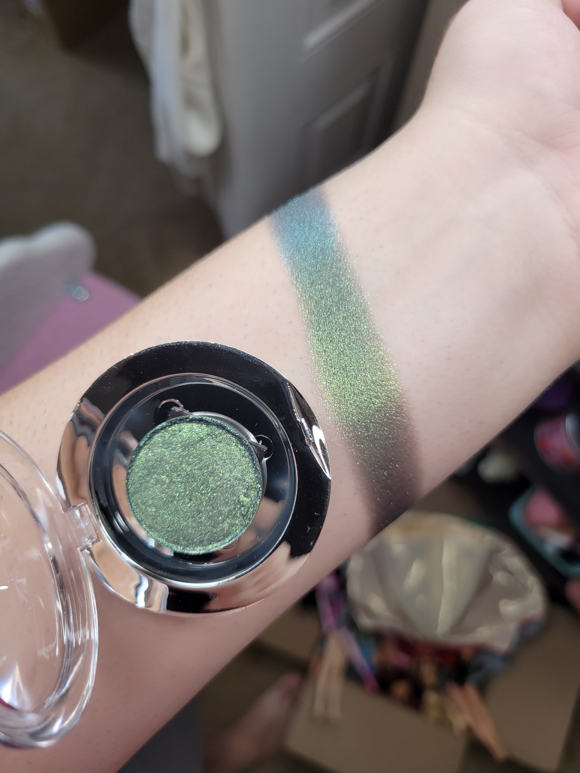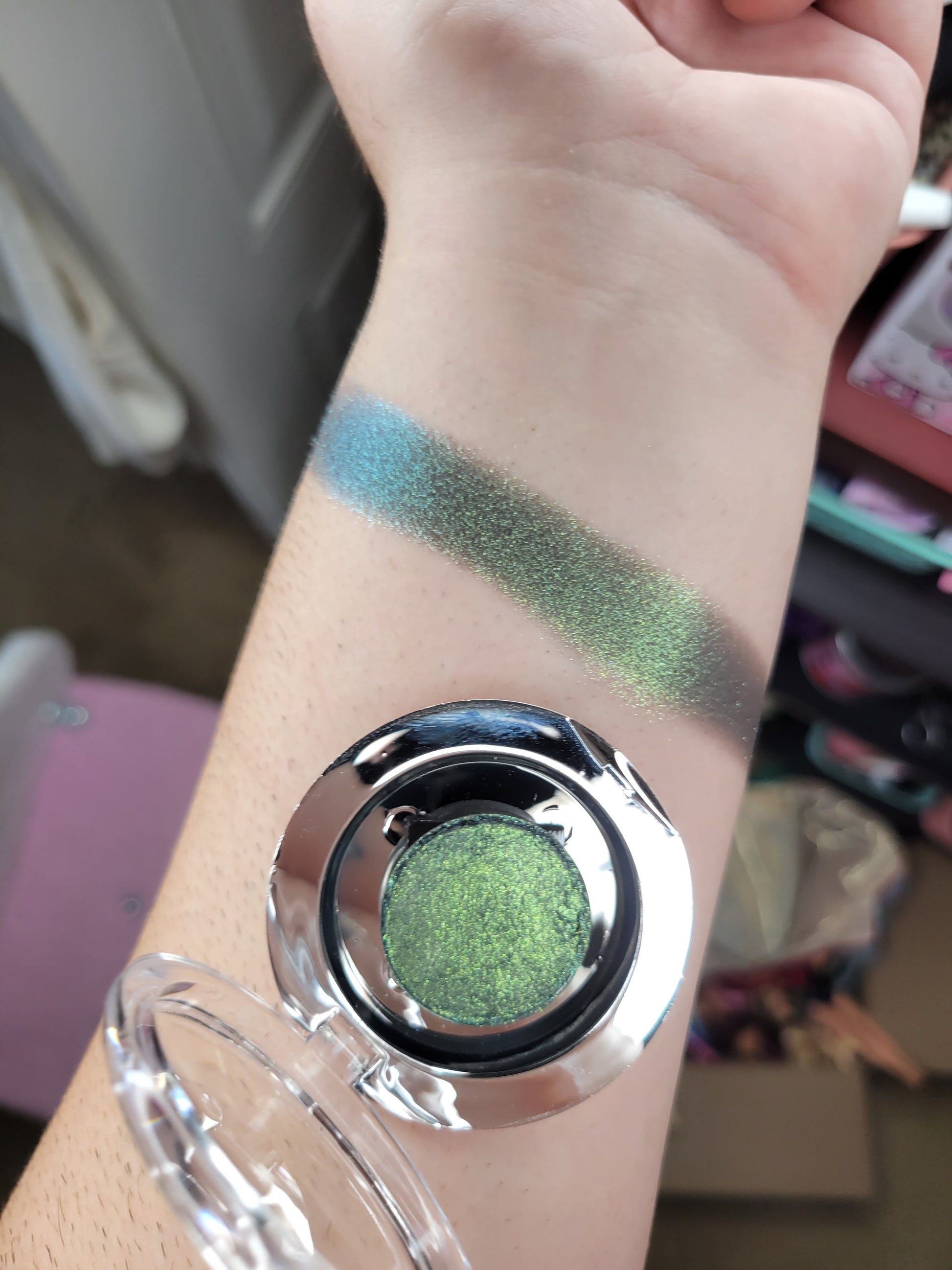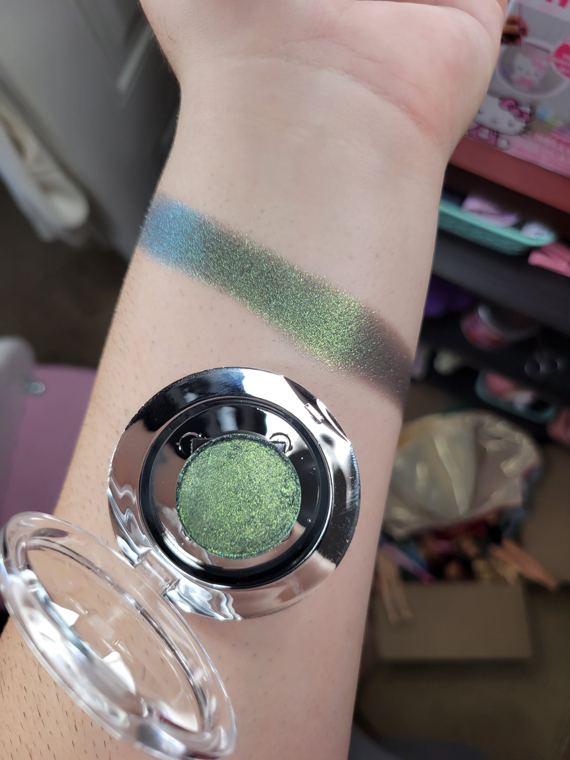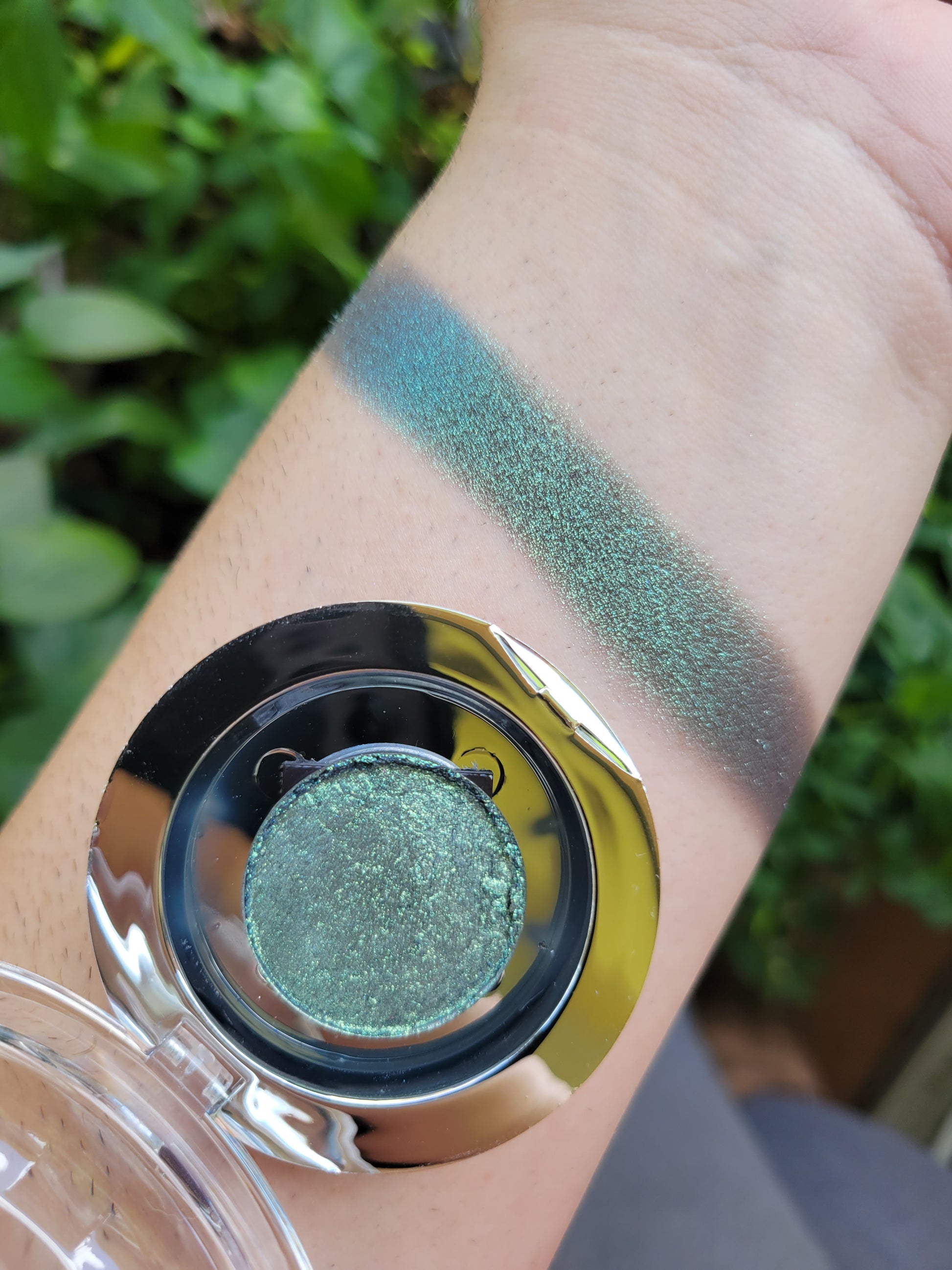 Cthulhu is a sparkly multichrome with a blackened base that shifts from a Gold, Green, and Blue/cyan. Each pan is magnetic and comes in 26mm size. This is a pressed product, making it easy to apply with your favorite brush or even your finger.