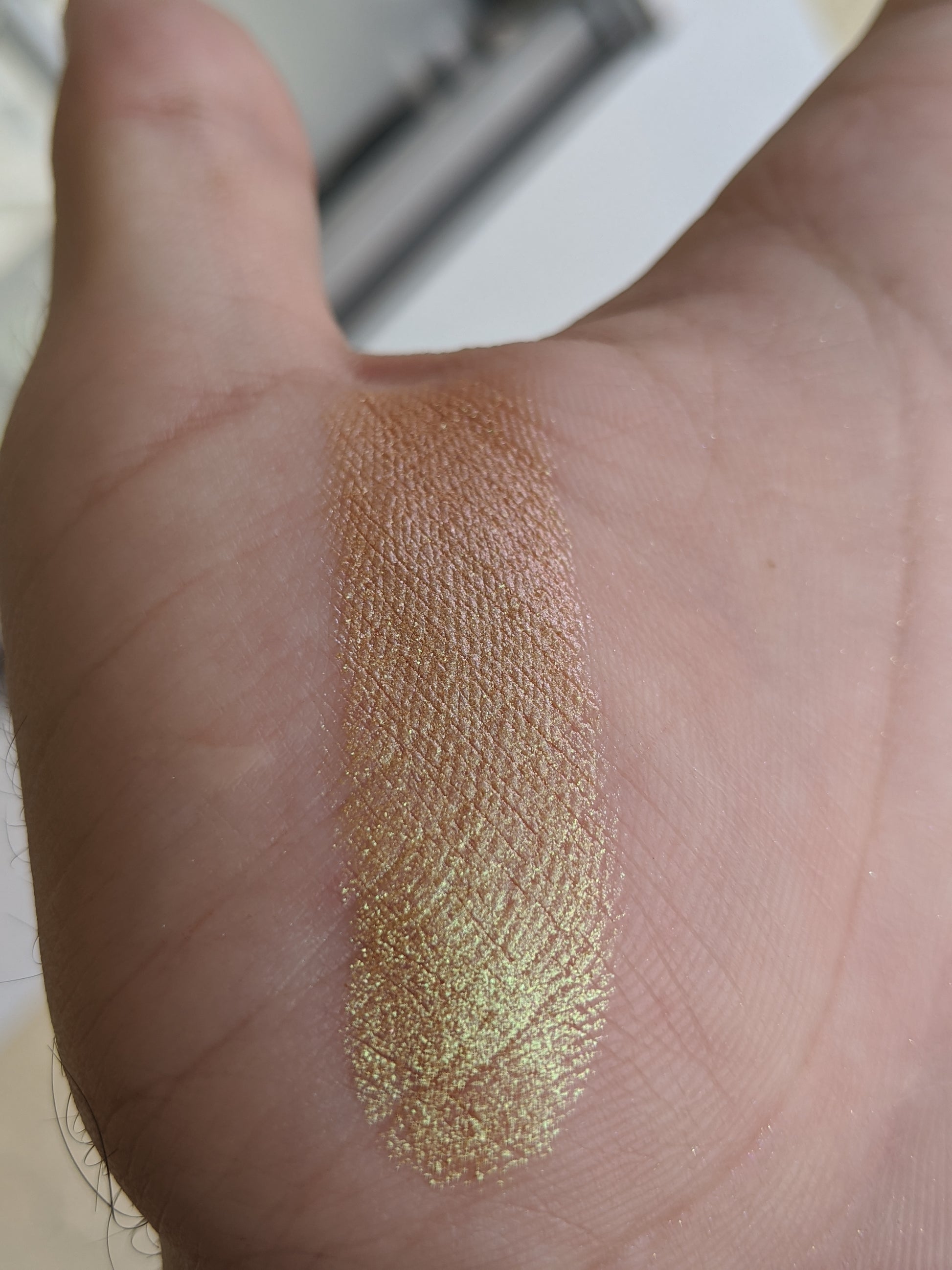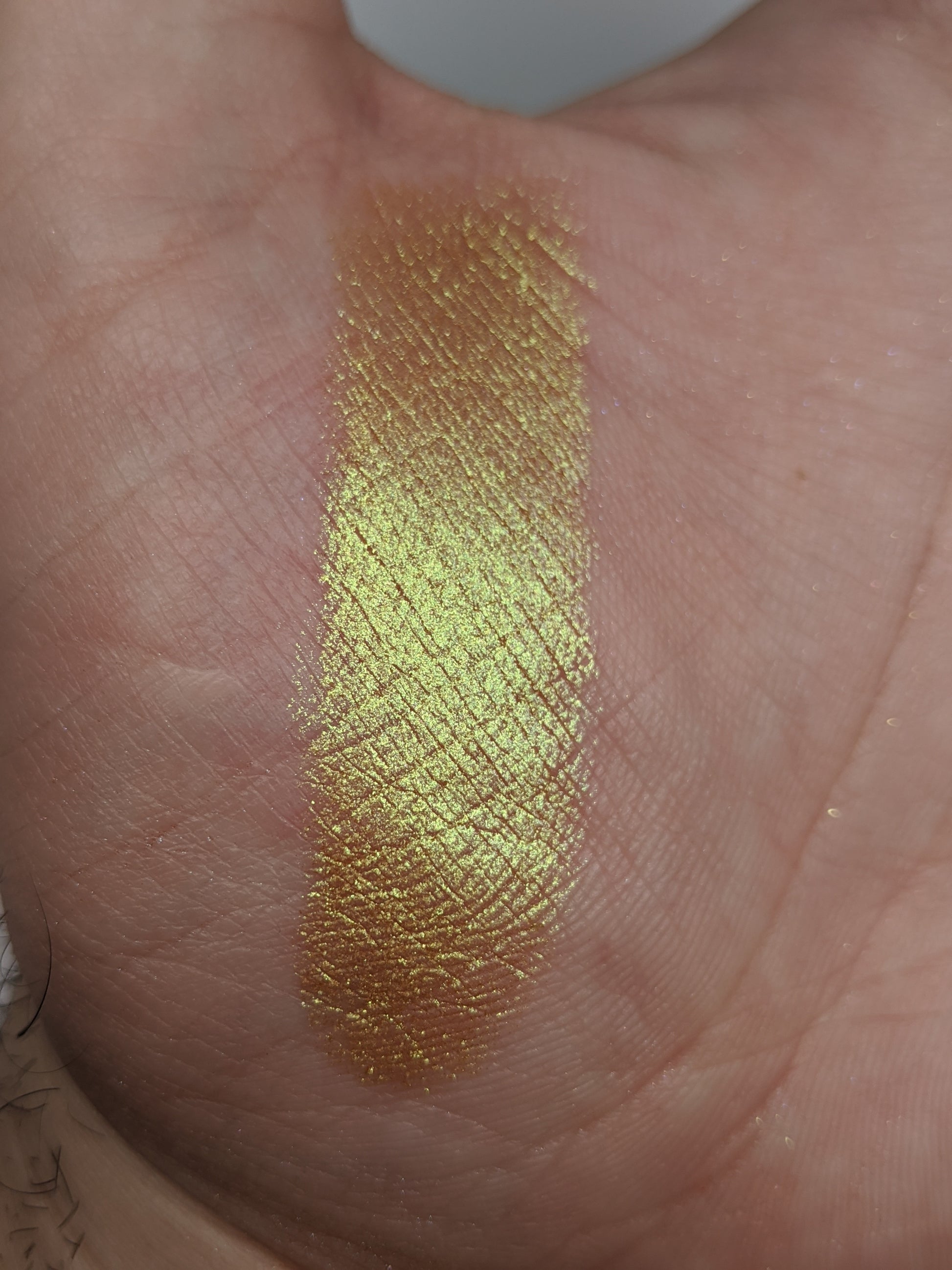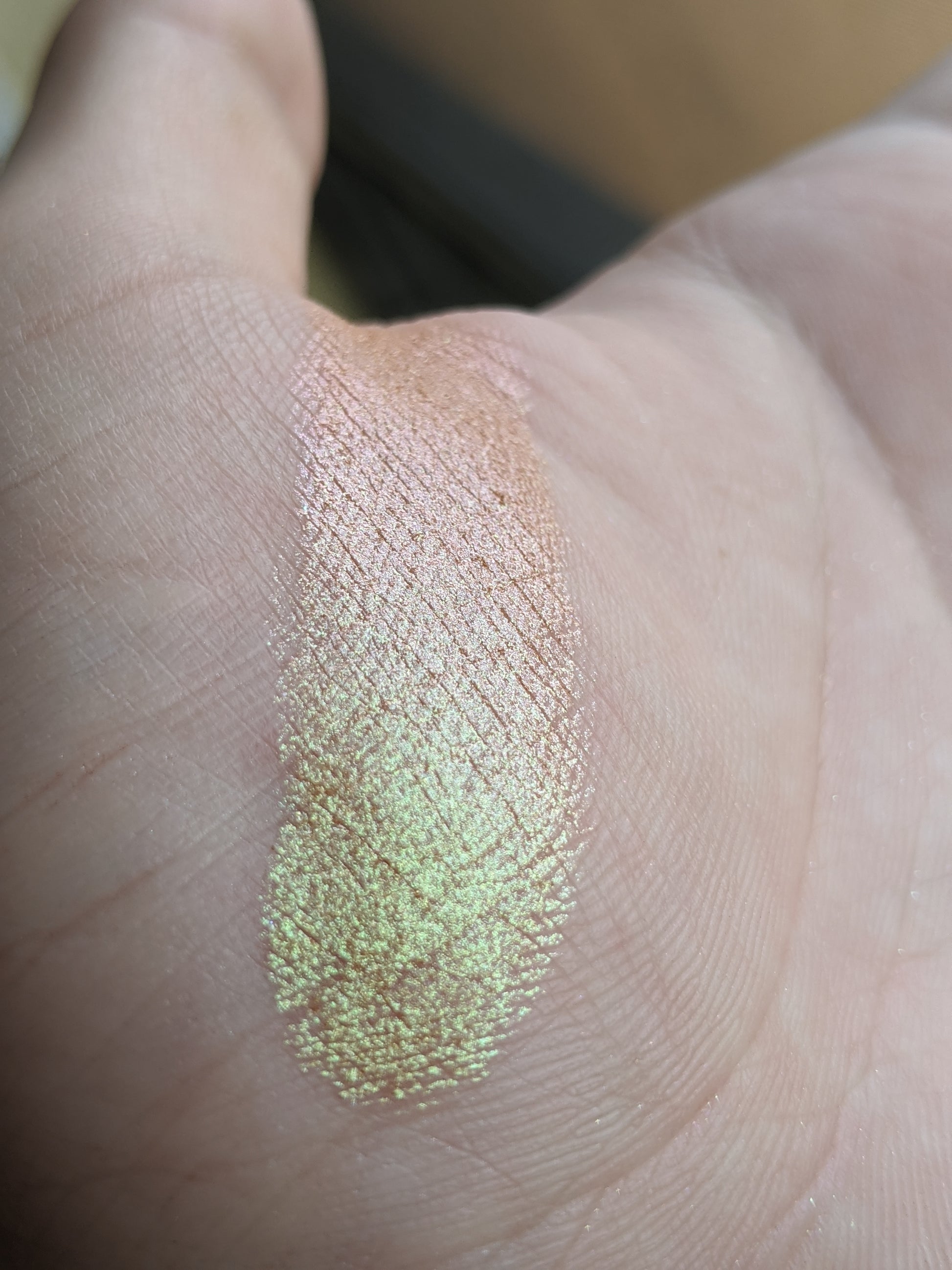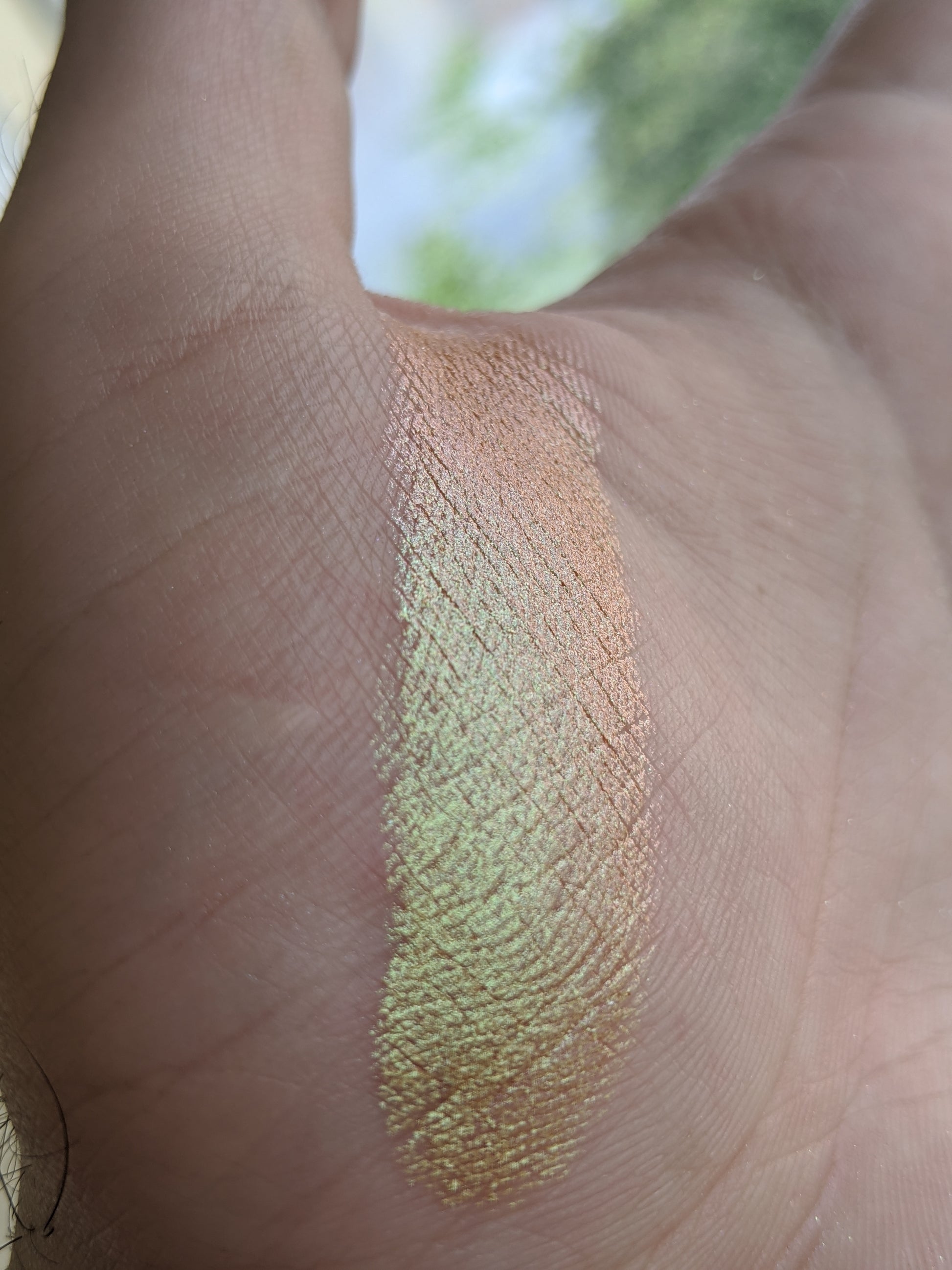 Dahlia is such a pretty shadow. It’s not as yellow as the swatch in the photos, but the brand’s description is spot on! Right now, in regular sorta cloudy daylight, it looks like a light peachy gold with pink shimmer, but when I shine the flash of my phone on it, it turns into a green-gold shimmer. It looks so beautiful on its own or layered on a color base, but it really shines when used with the Fyrinnae Pixie Epoxy!