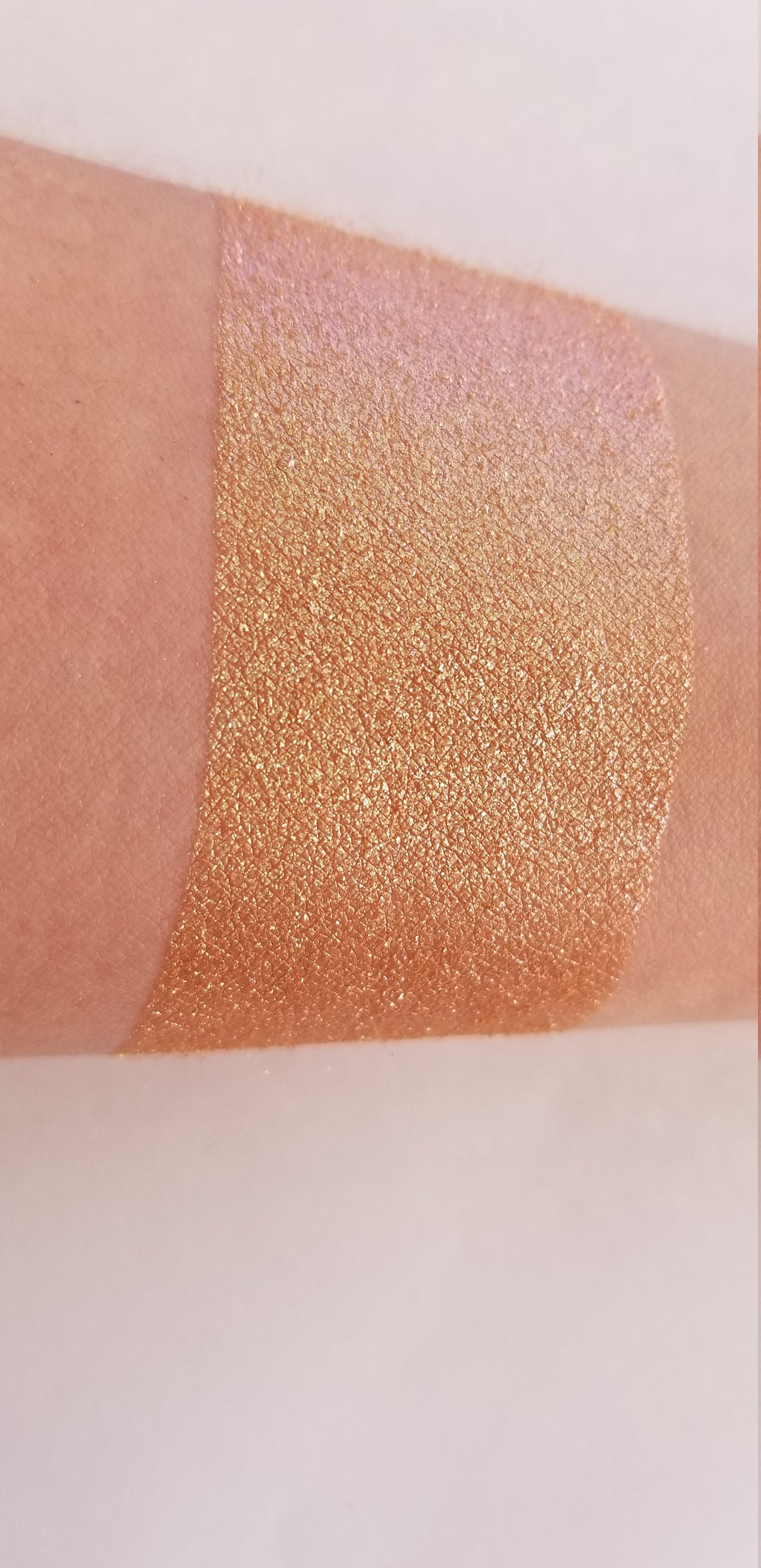 Dahlia is a gorgeous and one of my most popular multi-chrome eye shadow. Looking straight at it gives a strong green glow, which shifts between shades of gold, peach, and pink, simply stunning! This shade has more of a sheer base that helps when layering this color over another, or use it alone for a beautiful sparkly glow! Each pan is magnetic and comes in 26mm size. This is a pressed product, making it easy to apply with your favorite brush or even your finger.