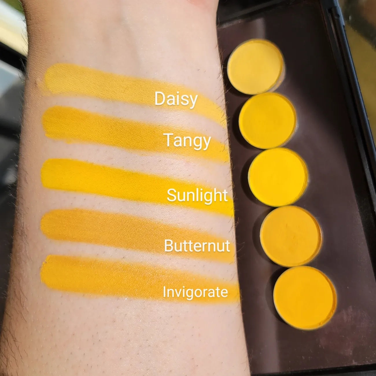 Daisy is a light yellow matte eye shadow! Very soft and blend-able for an easy application! Use your favorite primer to make these mattes POP!Each eyeshadow pan is magnetic and comes in 26mm, the size of a quarter. This is a pressed eyeshadow, making it easy to apply with your favorite brush or even your finger. My mattes are formulated to have a bit of kickup but are very pigmented, a little goes a long way!