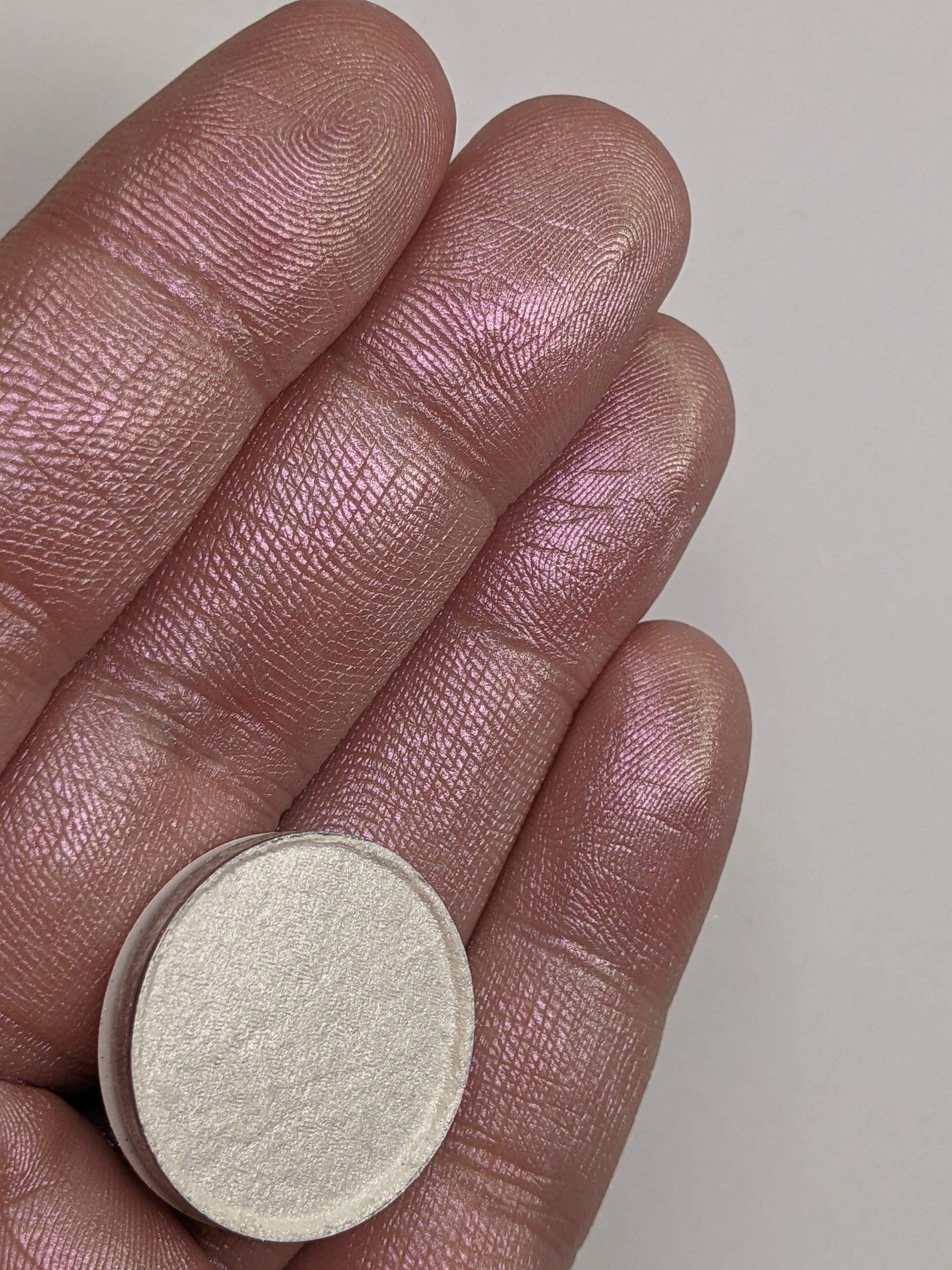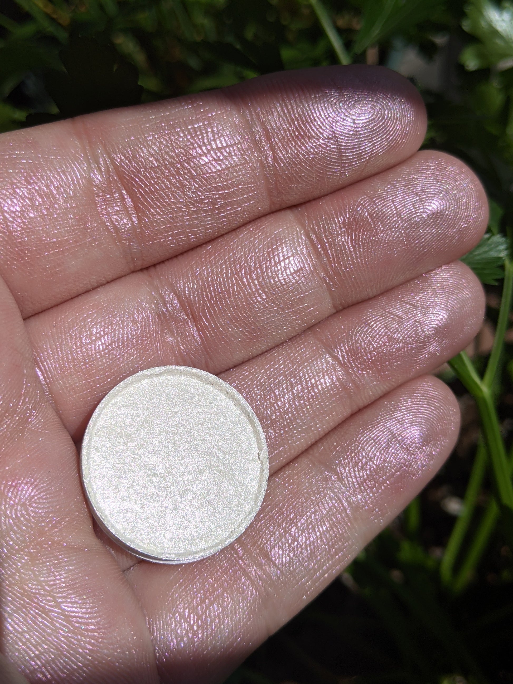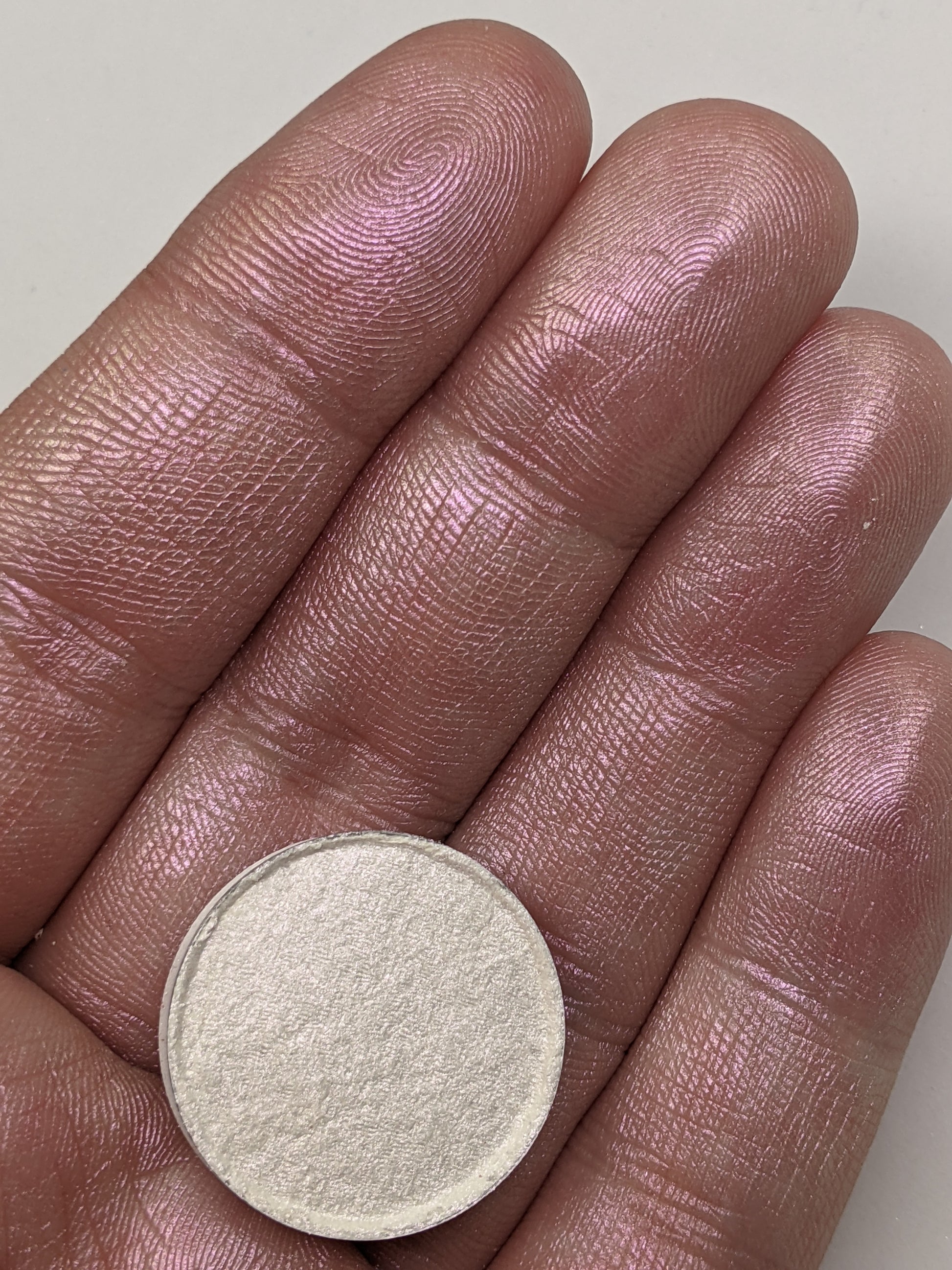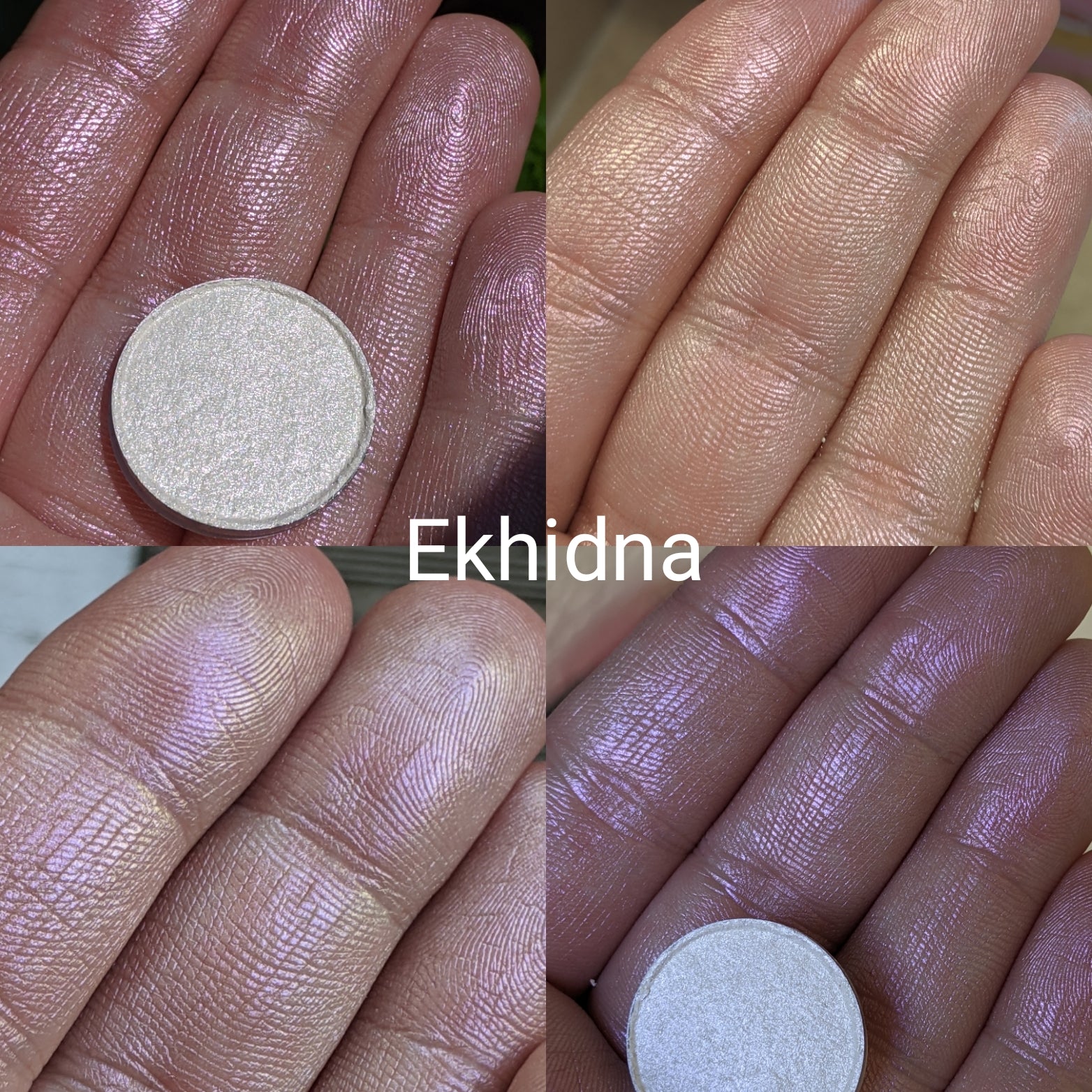Ekhidna is a transparent multichrome that appears white in the pan but bursts into colors once you swipe it onto your skin. That makes this a perfect highlight for the face and eyes, or use it on top of other colors to add some dimension! Ekhidna shifts between a purplish pink, silver, and then to a pastel green blue. Each eyeshadow pan is magnetic and comes in 26mm, the size of a quarter. This is a pressed product, making it easy to apply with your favorite brush or even your finger.