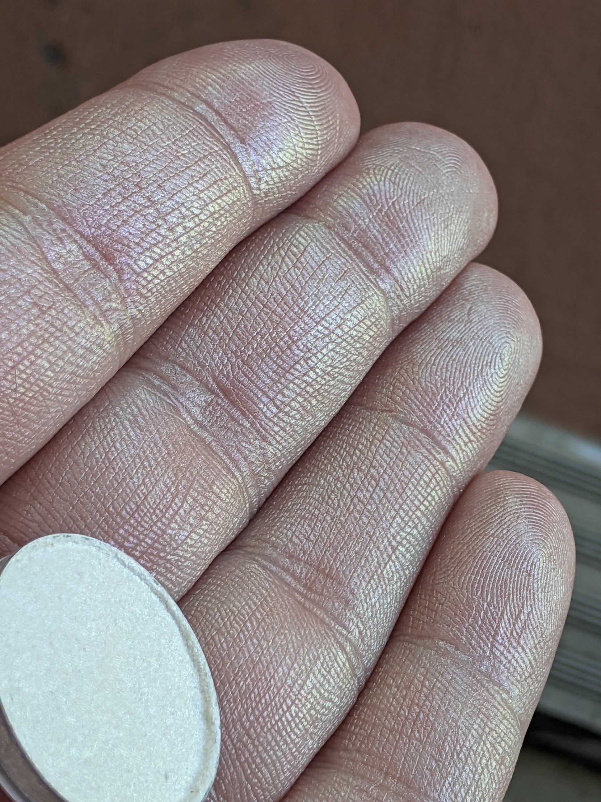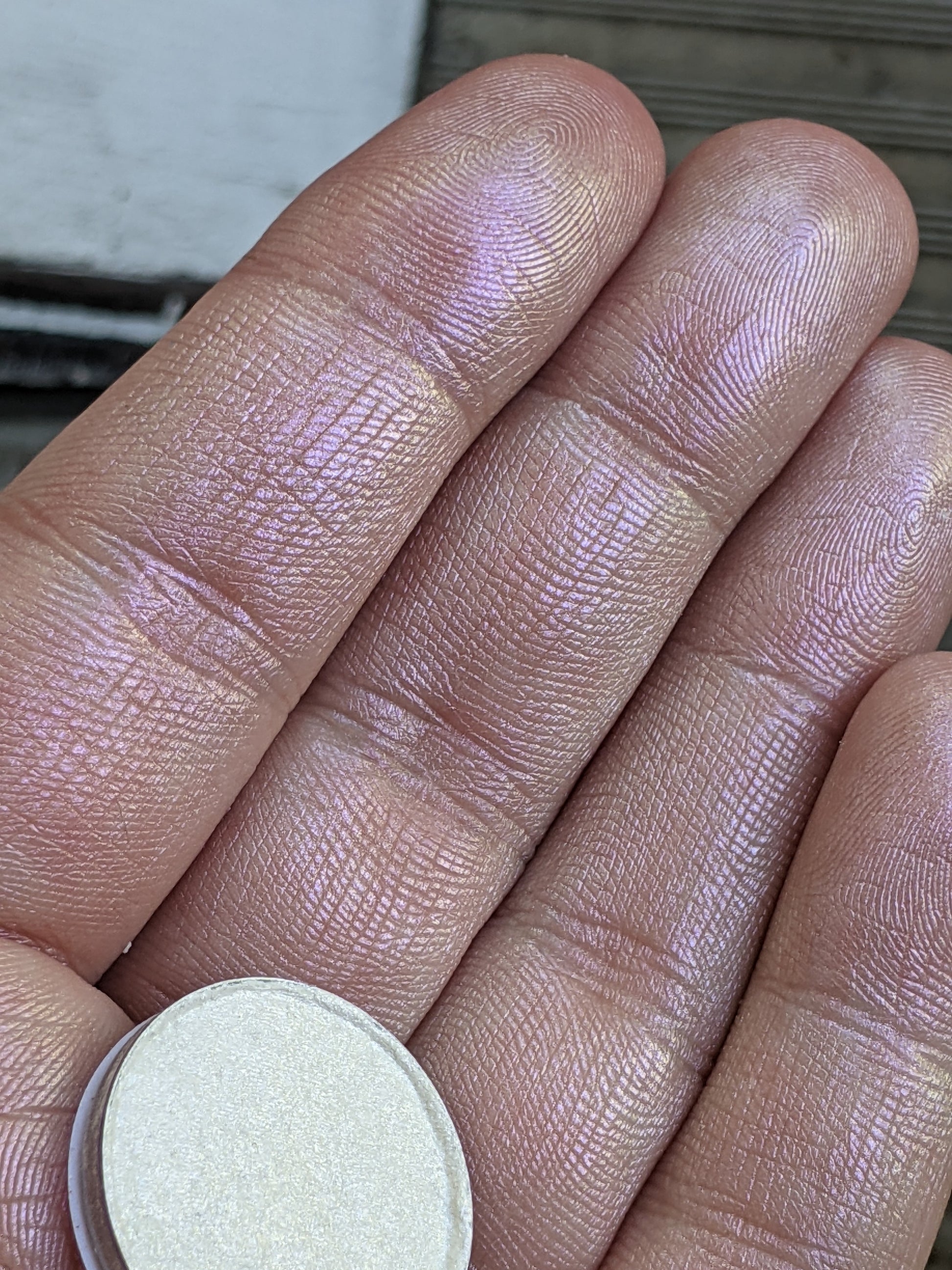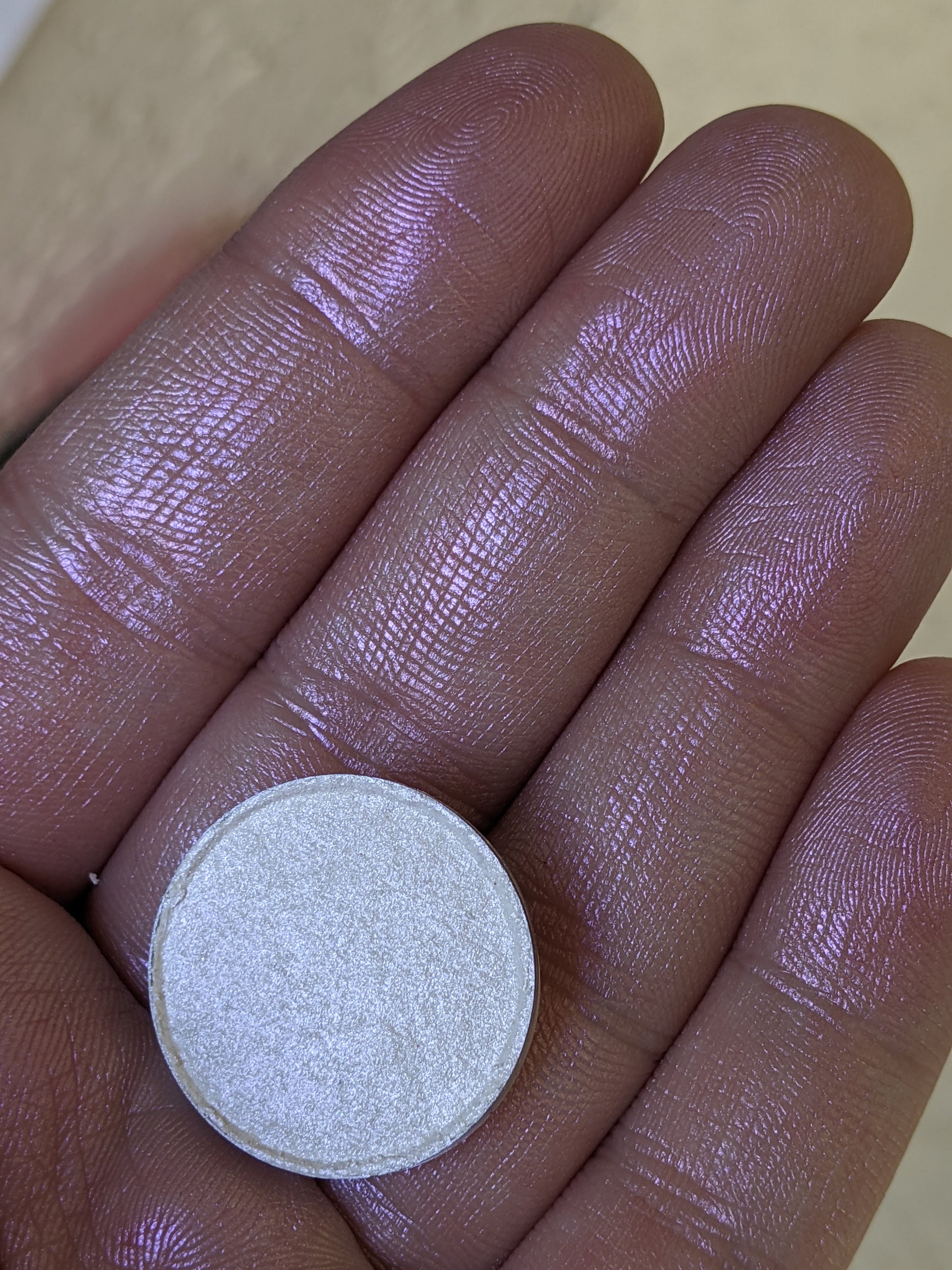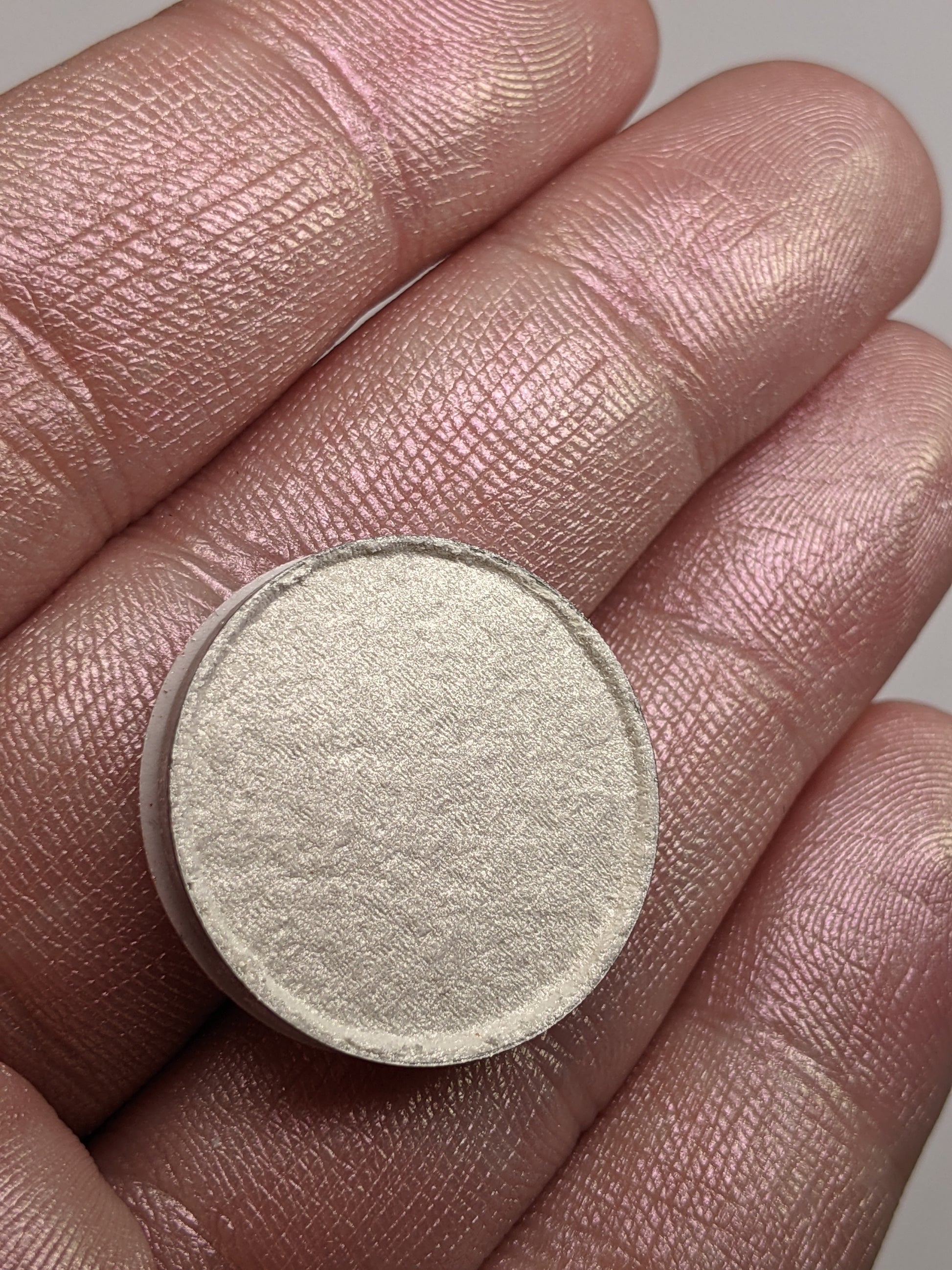 Ekhidna is a transparent multichrome that appears white in the pan but bursts into colors once you swipe it onto your skin. That makes this a perfect highlight for the face and eyes, or use it on top of other colors to add some dimension! Ekhidna shifts between a purplish pink, silver, and then to a pastel green blue. Each eyeshadow pan is magnetic and comes in 26mm, the size of a quarter. This is a pressed product, making it easy to apply with your favorite brush or even your finger.