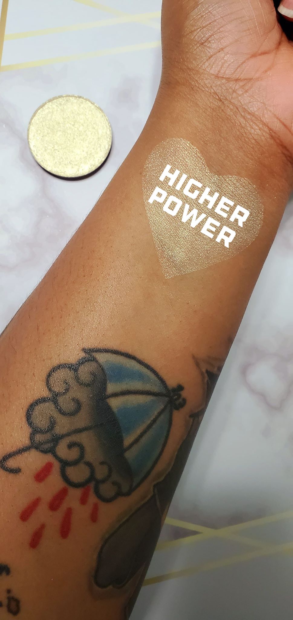 Higher Power is a light gold highlighter filled with sparkles. Each pan is magnetic and comes in 36mm size. This is a pressed product, making it easy to apply with your favorite brush or even your finger.