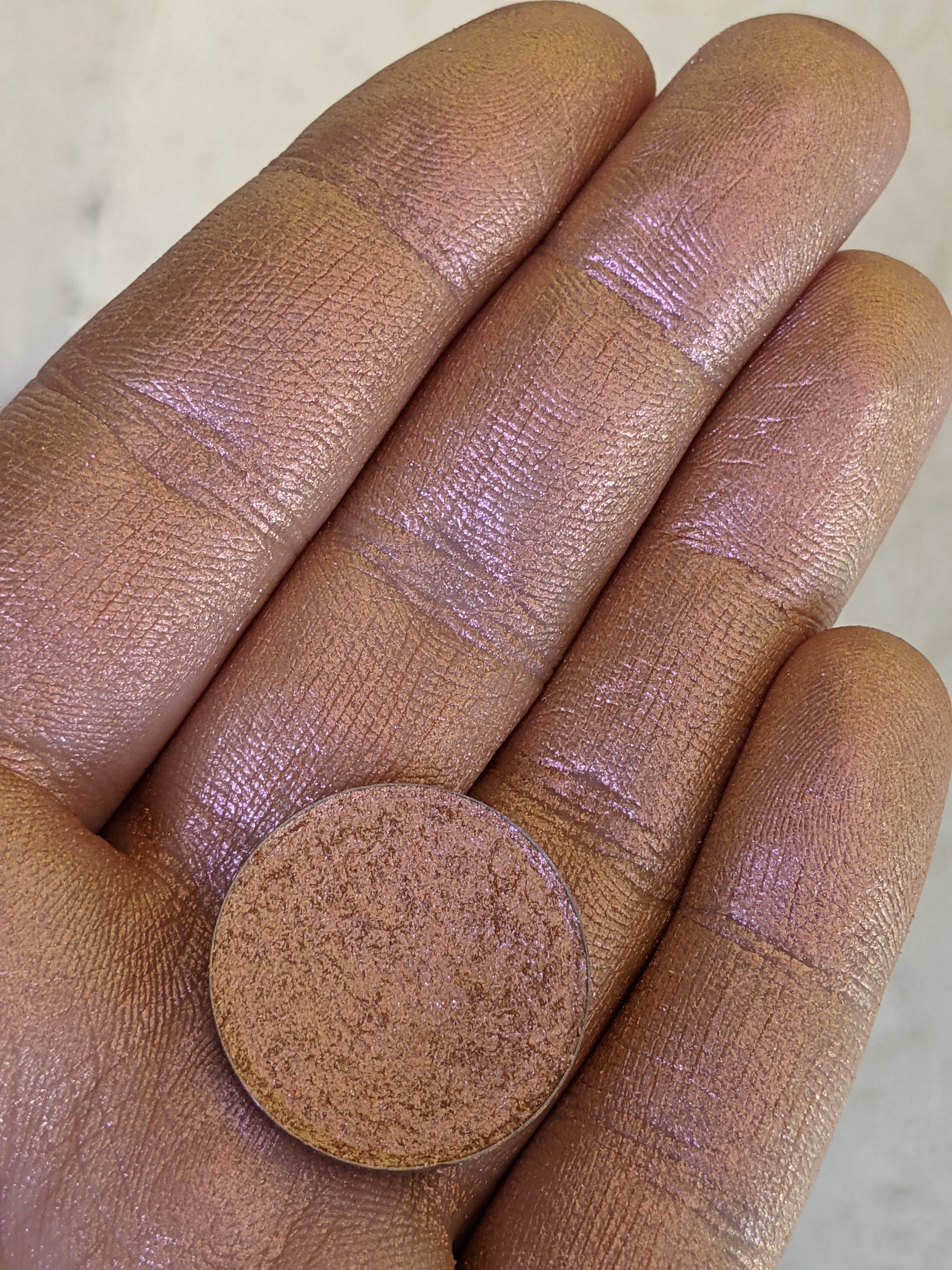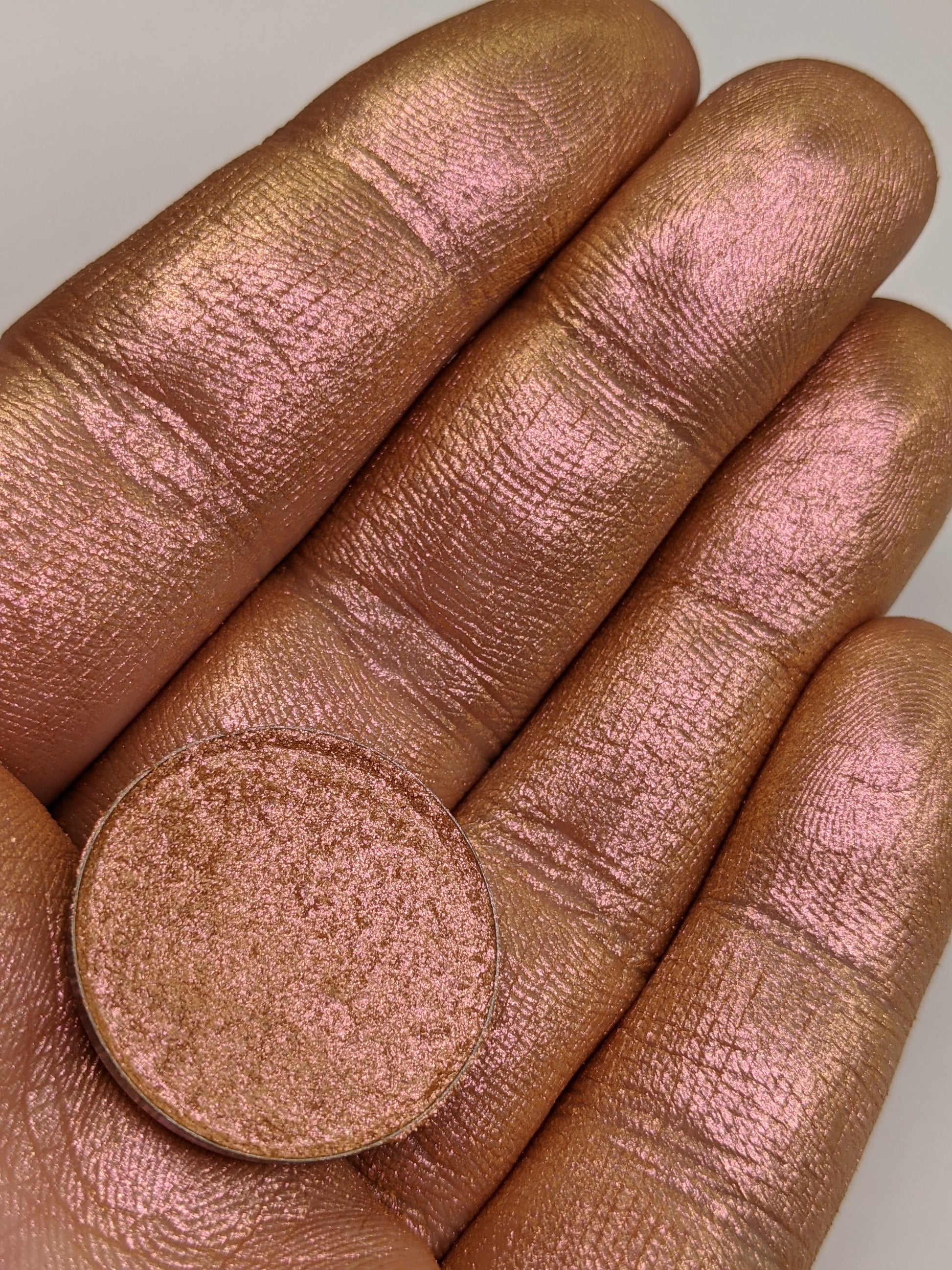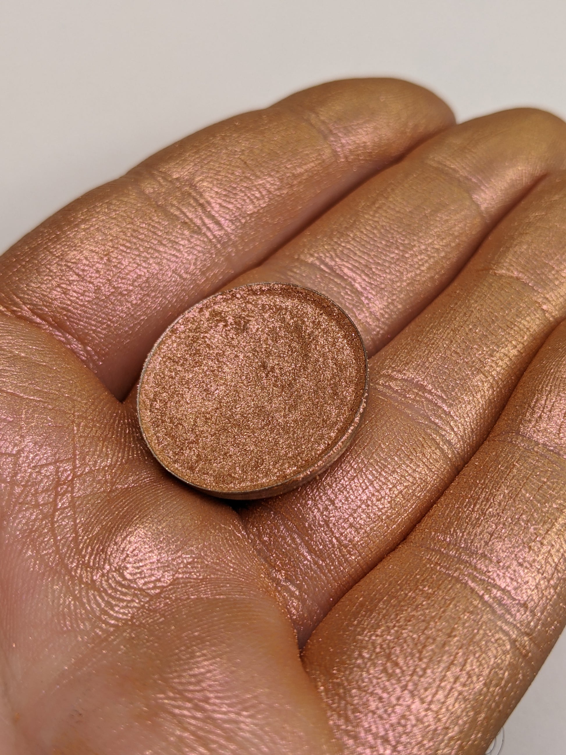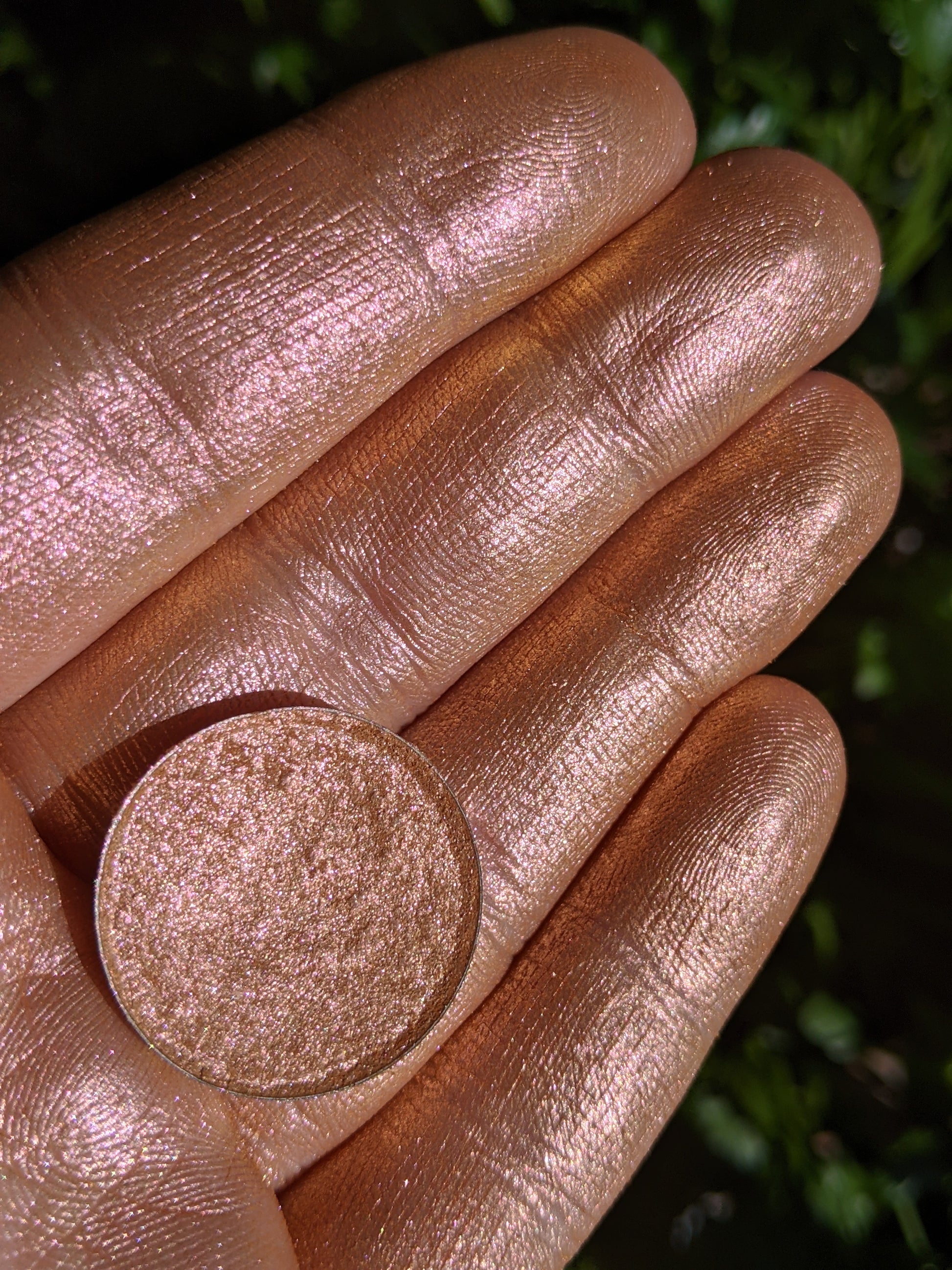 The Huntsman of the Princes; Hircine is a sparkle-based multichrome that shifts between shades of gold, peachy- champagne, and red. Similar in formula to Dahlia, but with different shifts. A primer is recommended to achieve the full multichrome effect. Each eyeshadow pan is magnetic and comes in 26mm, the size of a quarter. This is a pressed product, making it easy to apply with your favorite brush or even your finger.