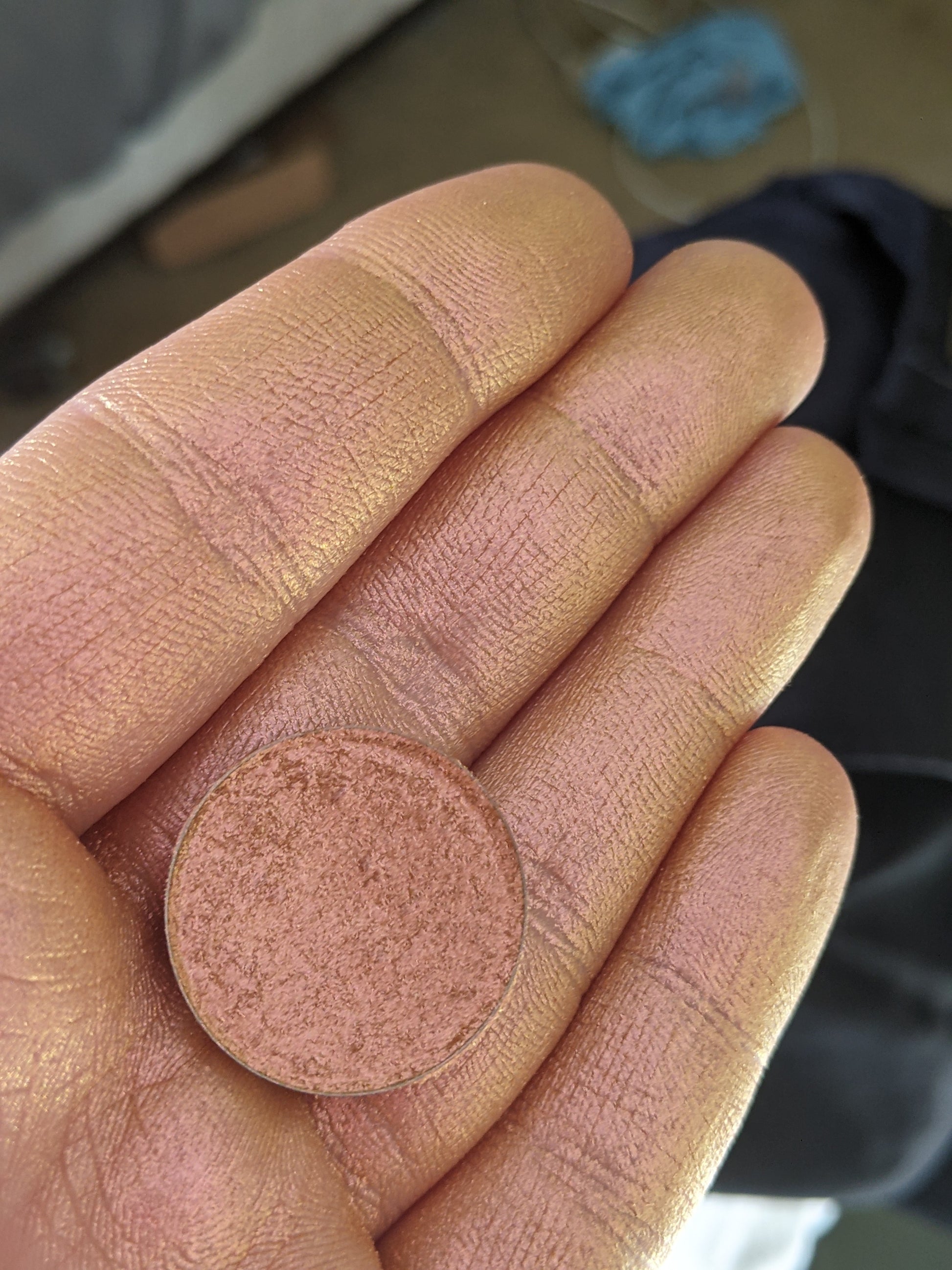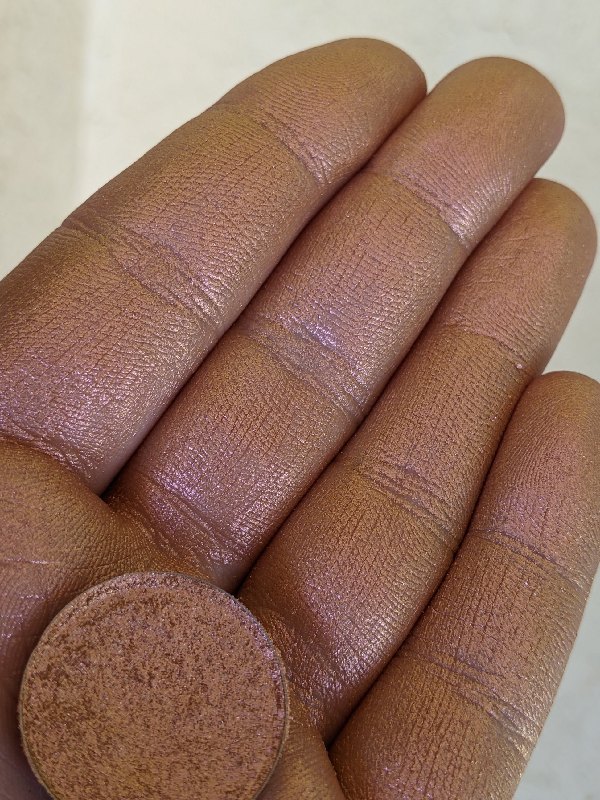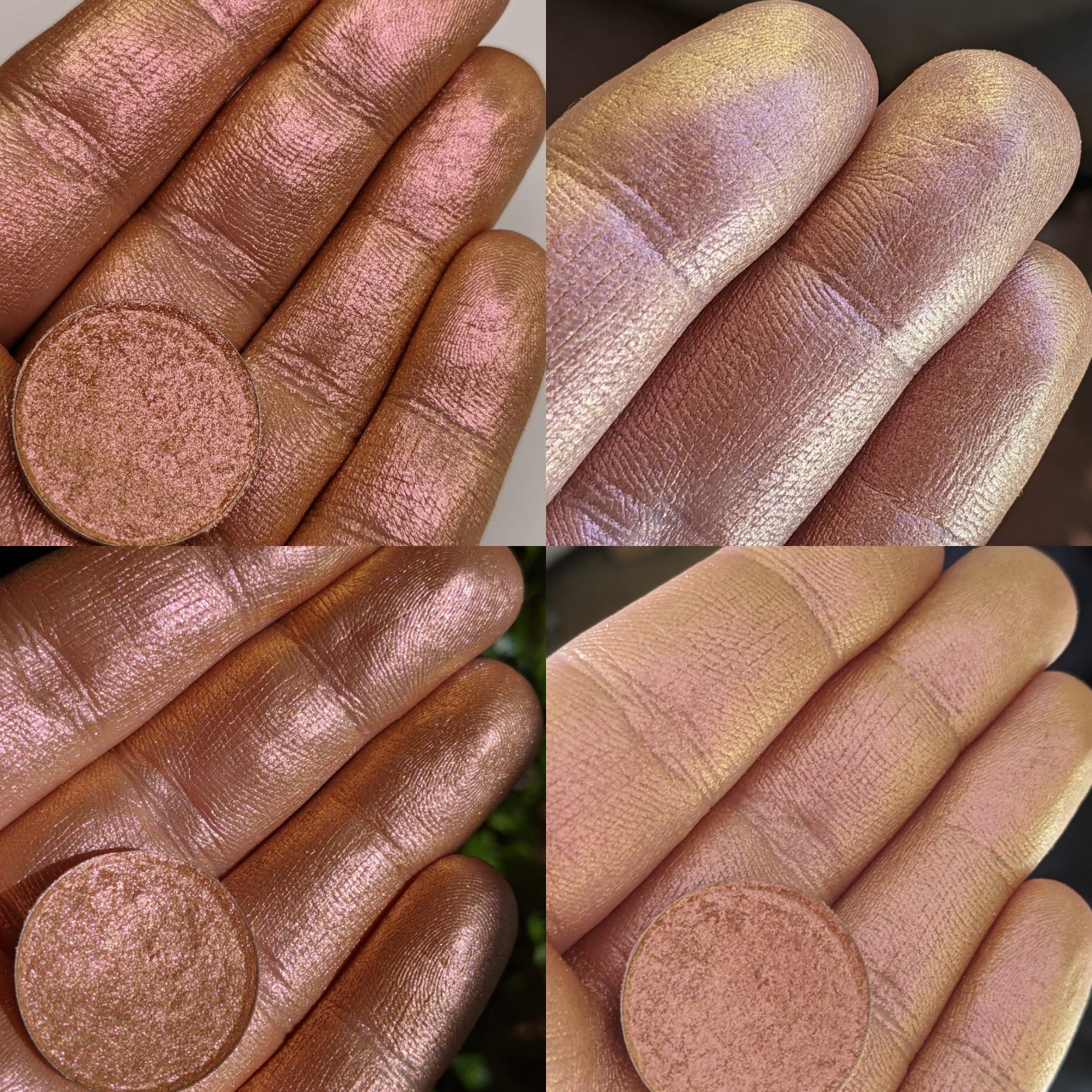 The Huntsman of the Princes; Hircine is a sparkle-based multichrome that shifts between shades of gold, peachy- champagne, and red. Similar in formula to Dahlia, but with different shifts. A primer is recommended to achieve the full multichrome effect. Each eyeshadow pan is magnetic and comes in 26mm, the size of a quarter. This is a pressed product, making it easy to apply with your favorite brush or even your finger.