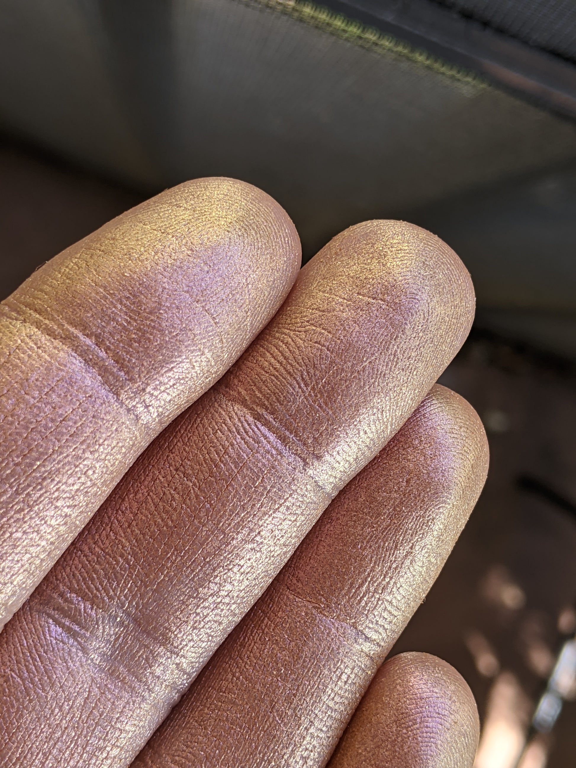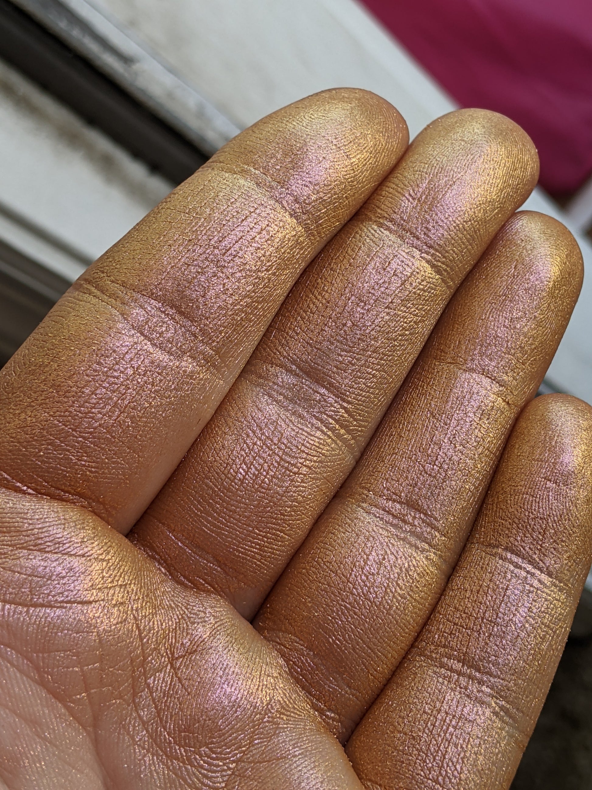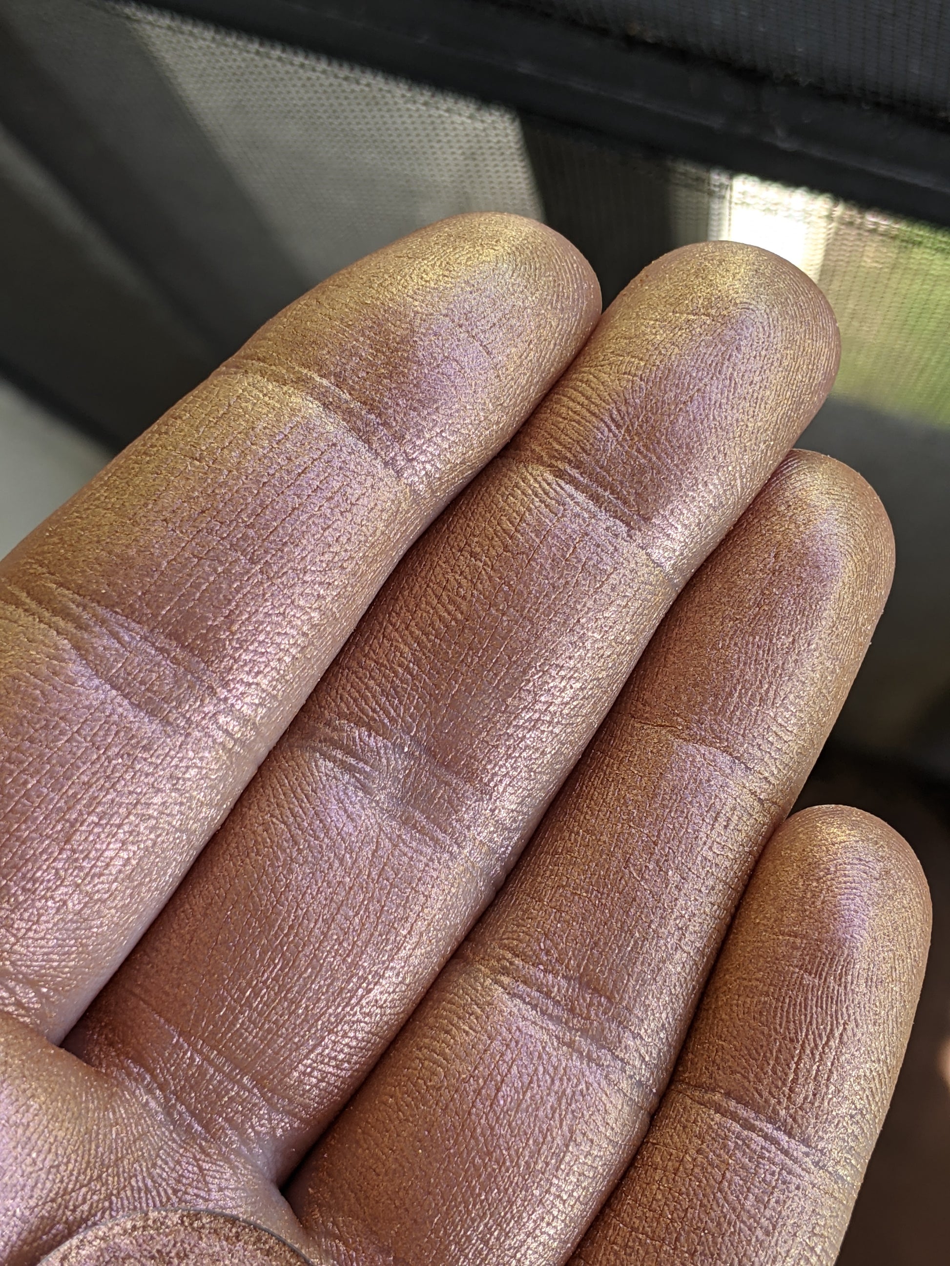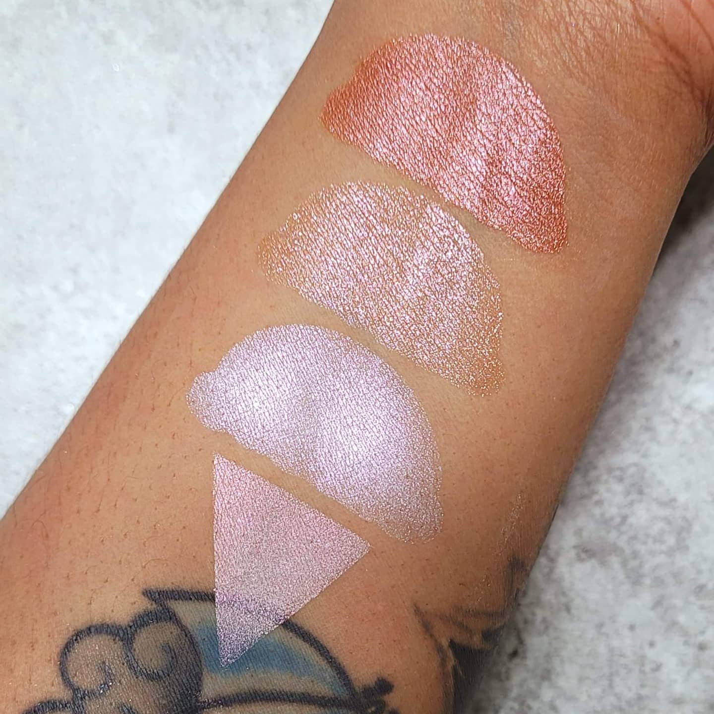 The Huntsman of the Princes; Hircine is a sparkle-based multichrome that shifts between shades of gold, peachy- champagne, and red. Similar in formula to Dahlia, but with different shifts. A primer is recommended to achieve the full multichrome effect. Each eyeshadow pan is magnetic and comes in 26mm, the size of a quarter. This is a pressed product, making it easy to apply with your favorite brush or even your finger.