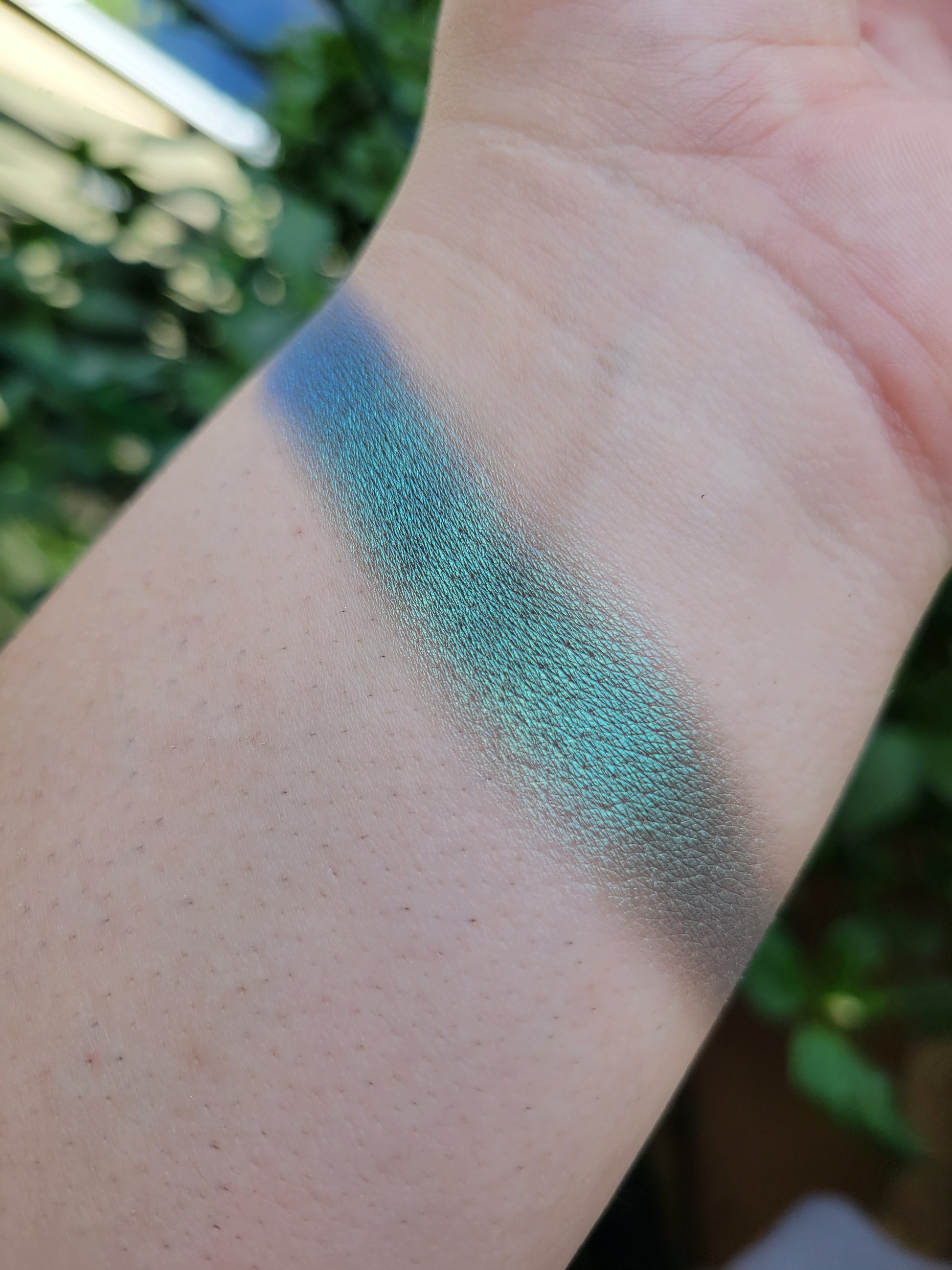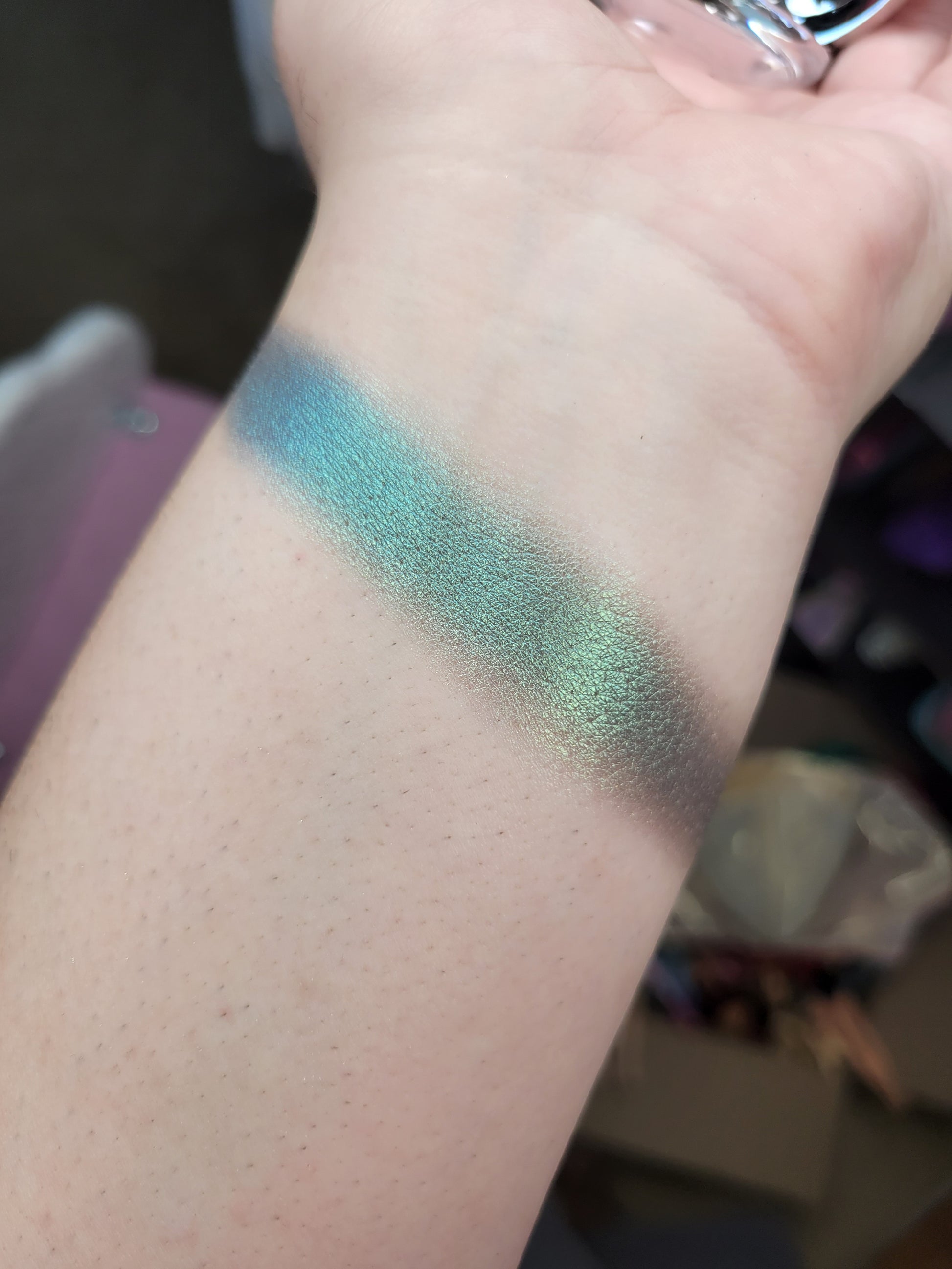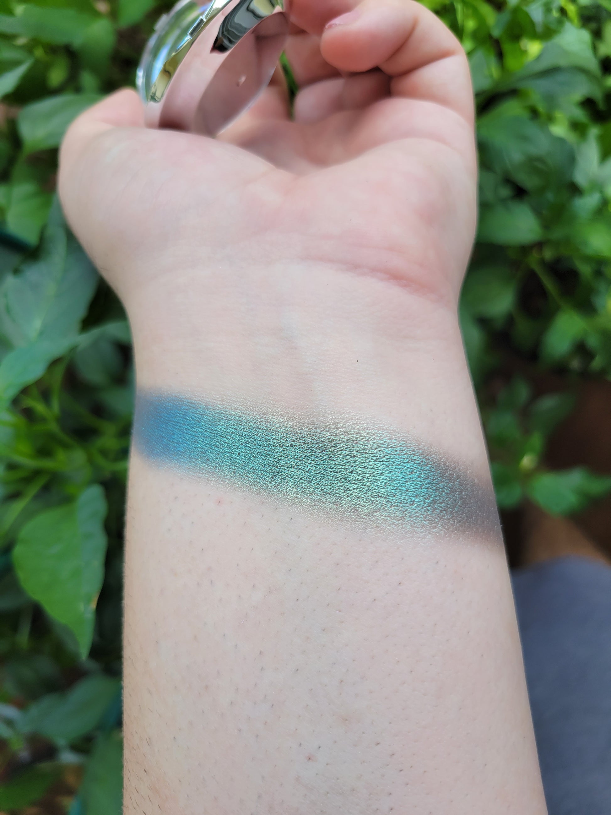 Kappa is a satin multichrome with a blackened base that shifts from gold green, silver green, and teal/blue. Each pan is magnetic and comes in 26mm size. This is a pressed product, making it easy to apply with your favorite brush or even your finger.