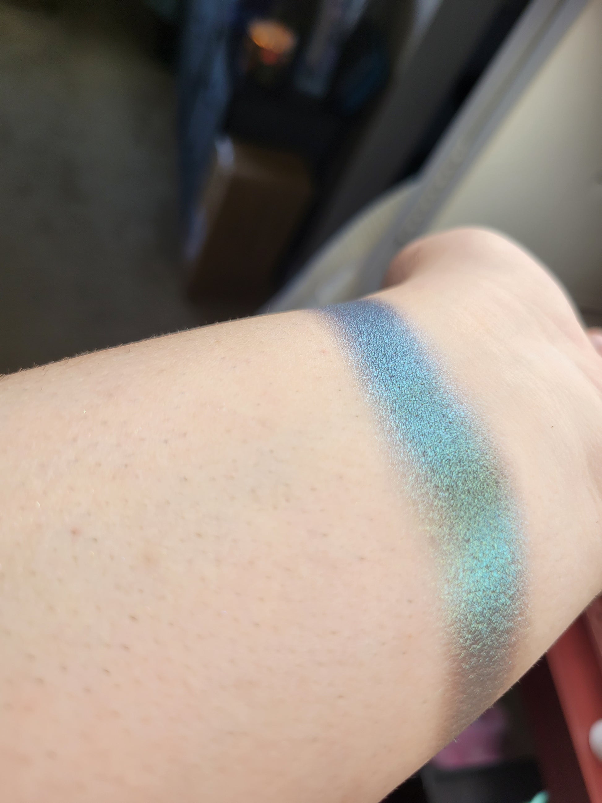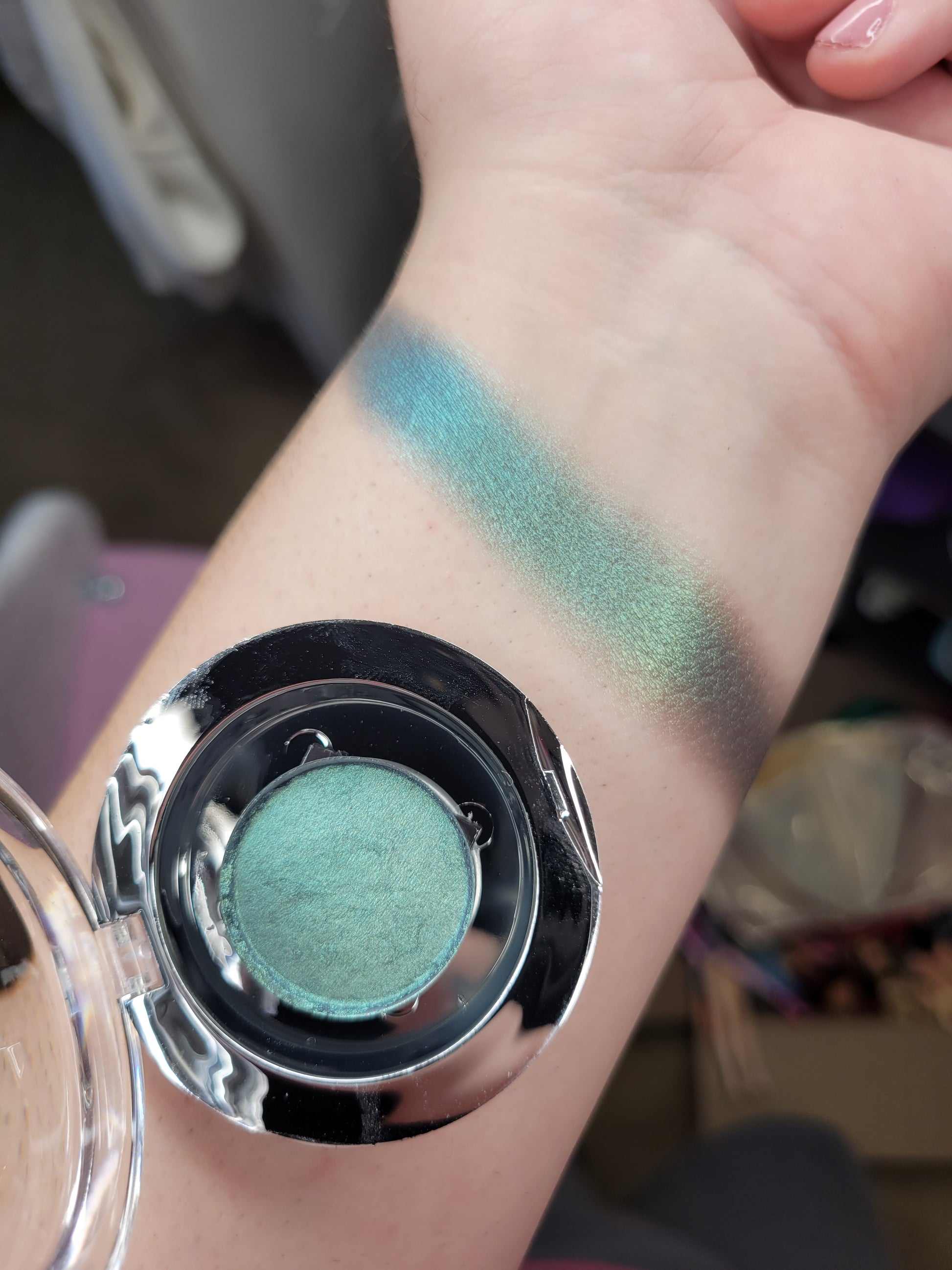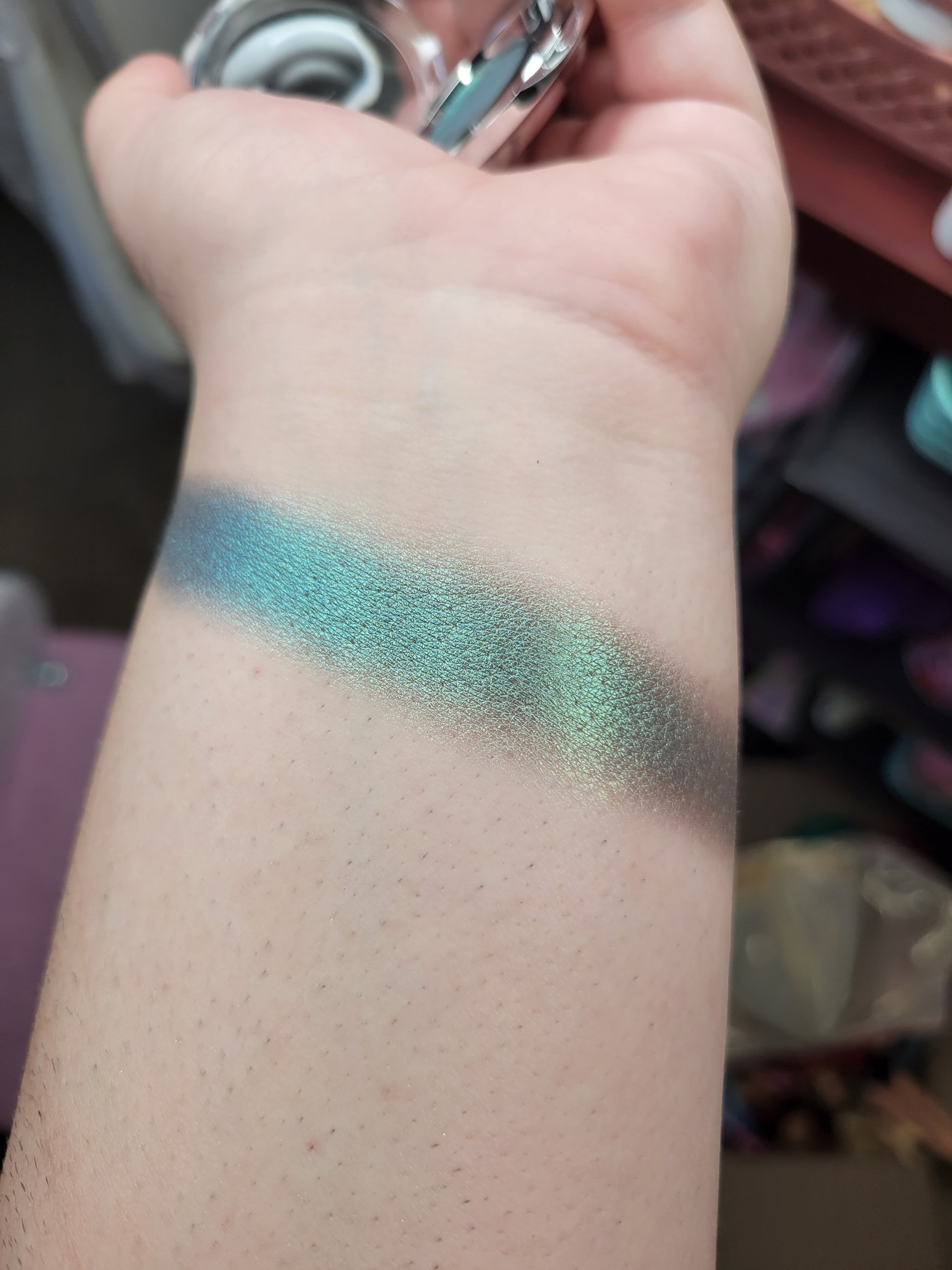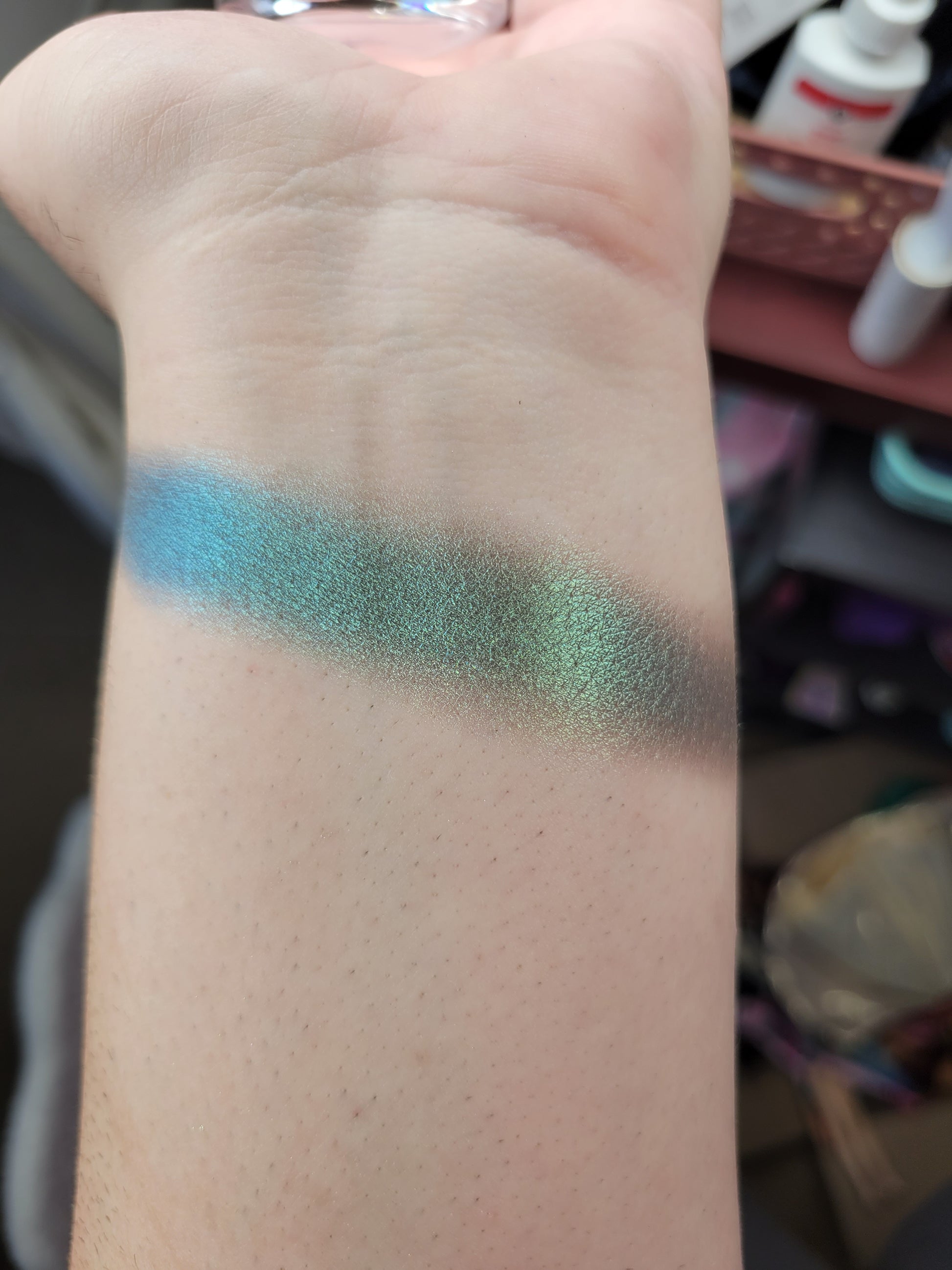 Kappa is a satin multichrome with a blackened base that shifts from gold green, silver green, and teal/blue. Each pan is magnetic and comes in 26mm size. This is a pressed product, making it easy to apply with your favorite brush or even your finger.