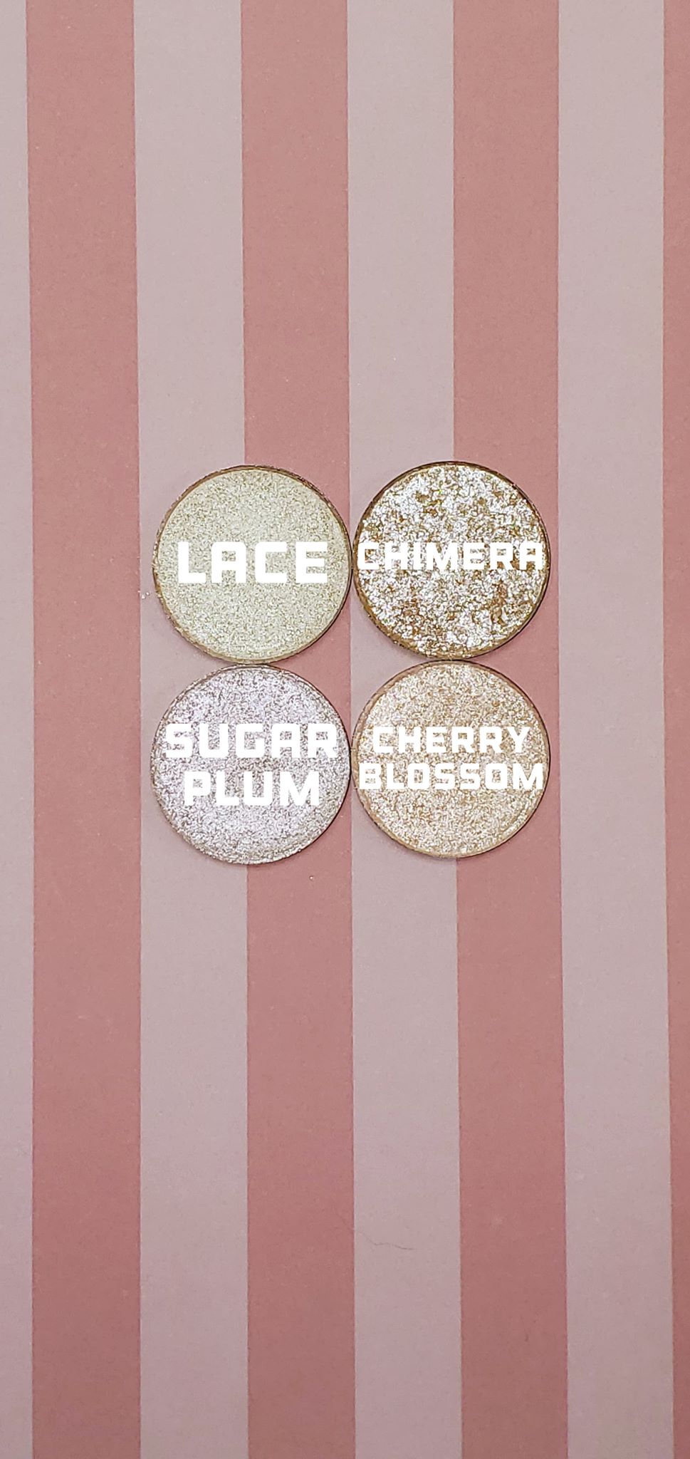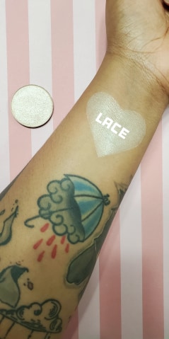 Lace is an ivory beige highlighter with pink undertones and a beautiful and soft shimmer. This shade has an extra boost of Boron Nitride making this one of my softest highlighters yet! Each pan is magnetic and comes in 36mm size. This is a pressed product, making it easy to apply with your favorite brush or even your finger.