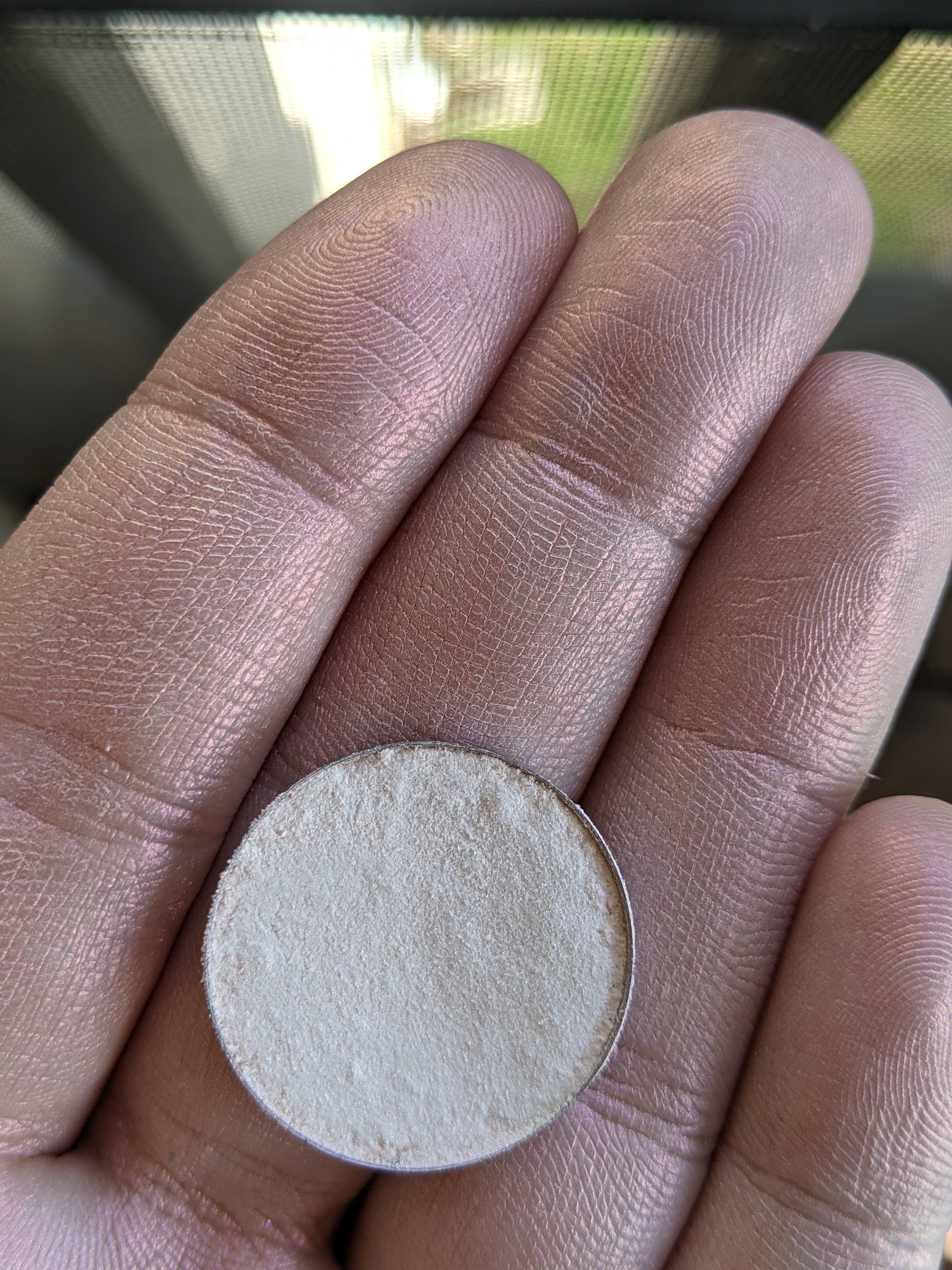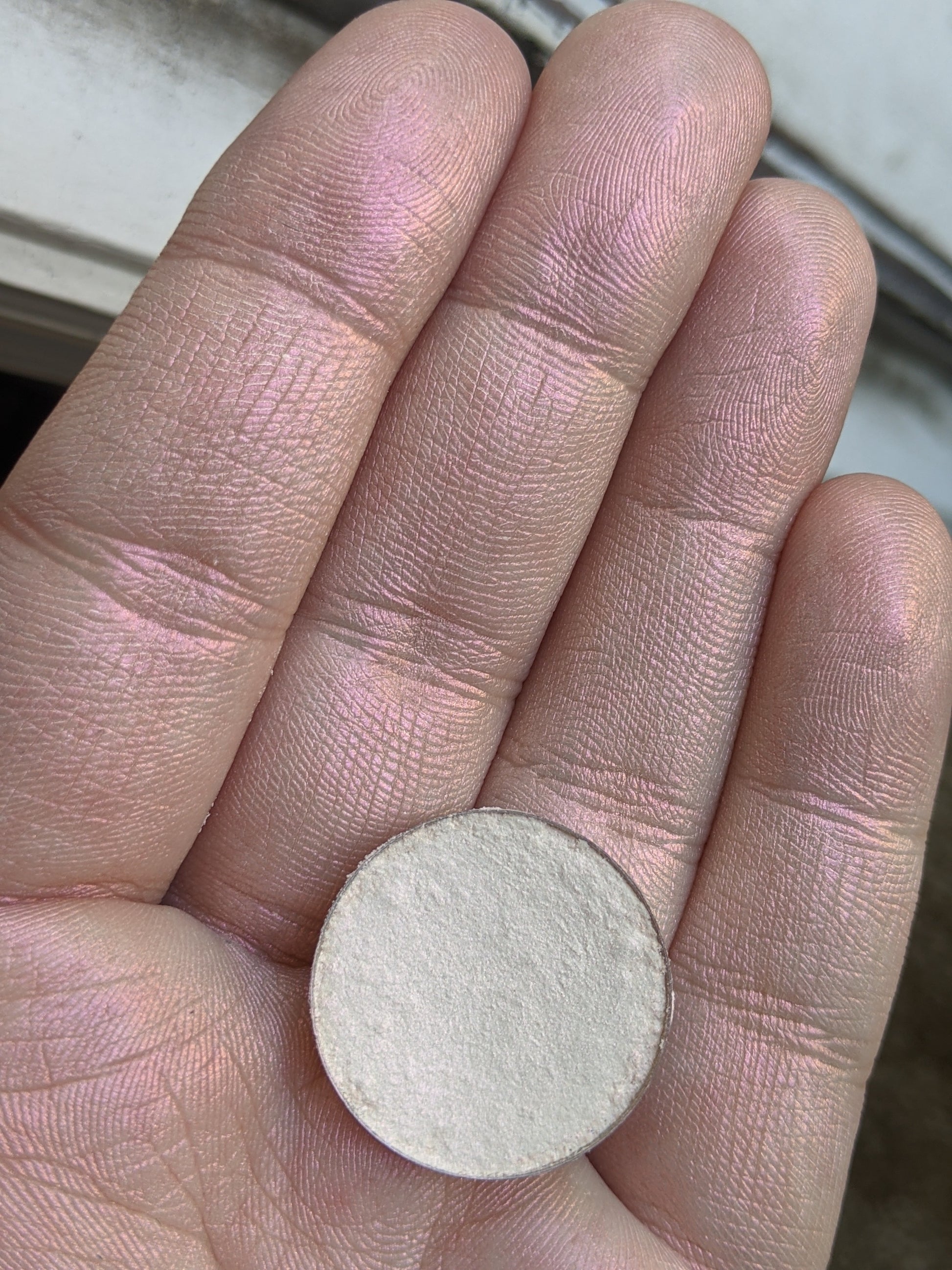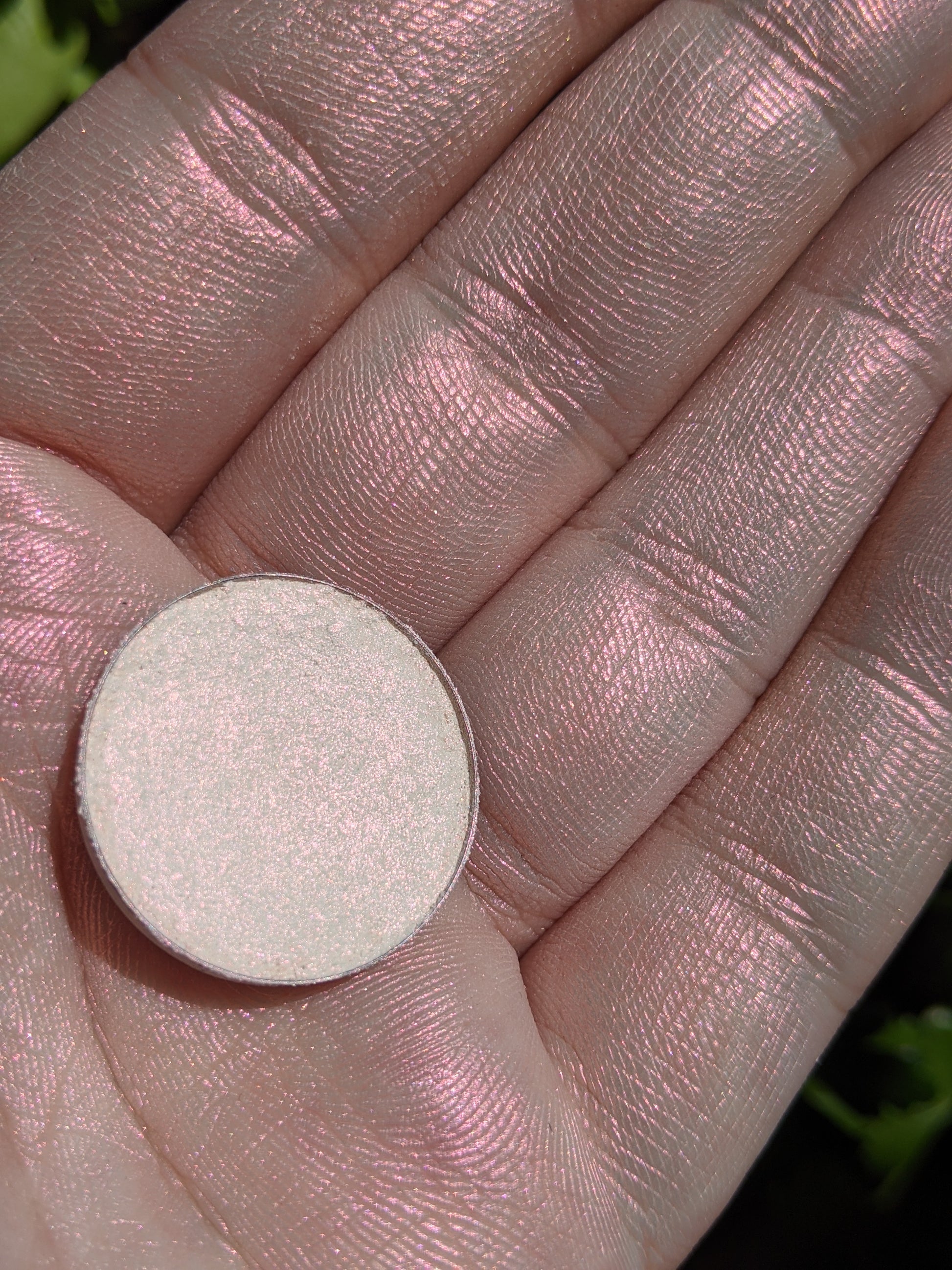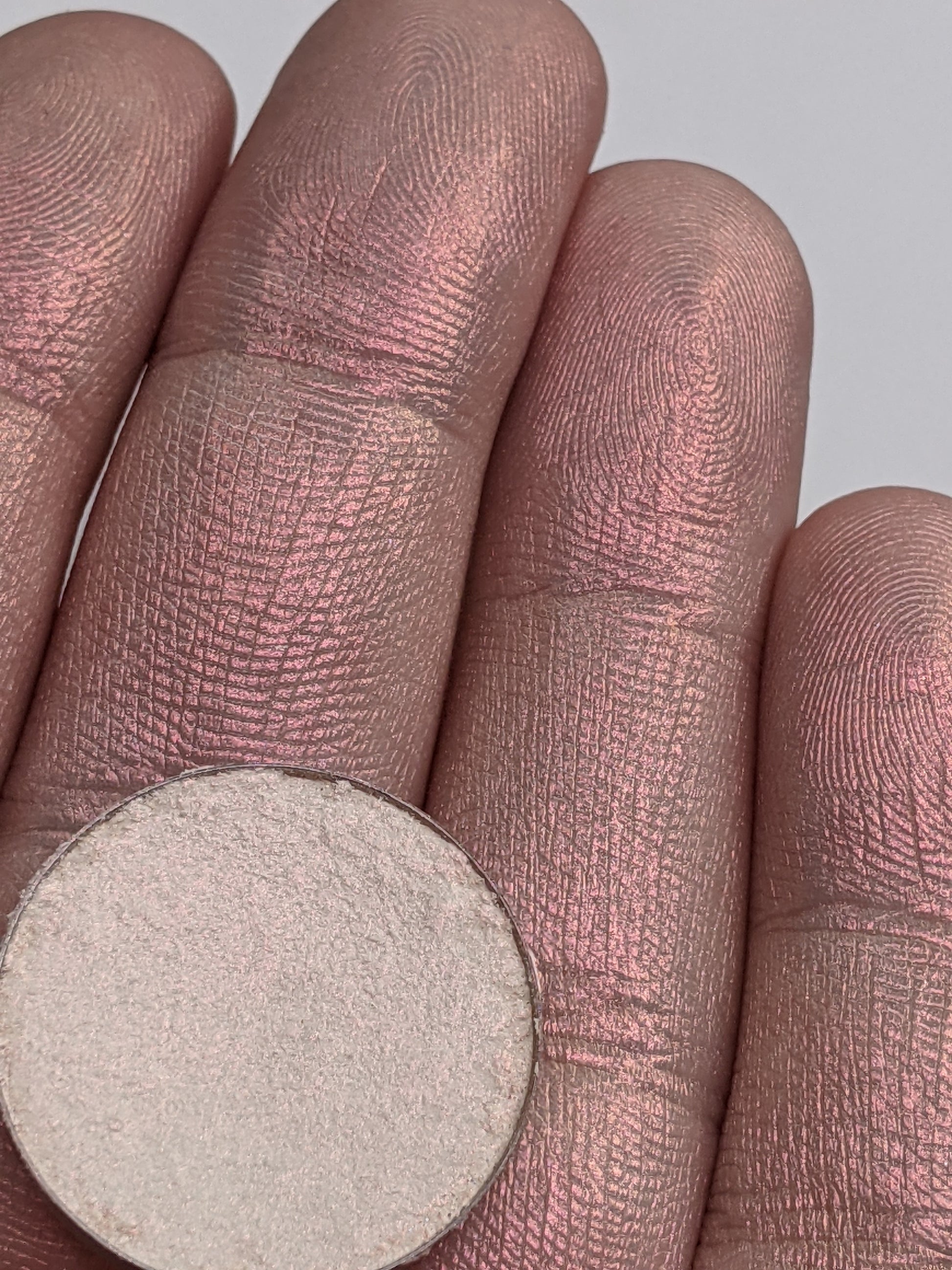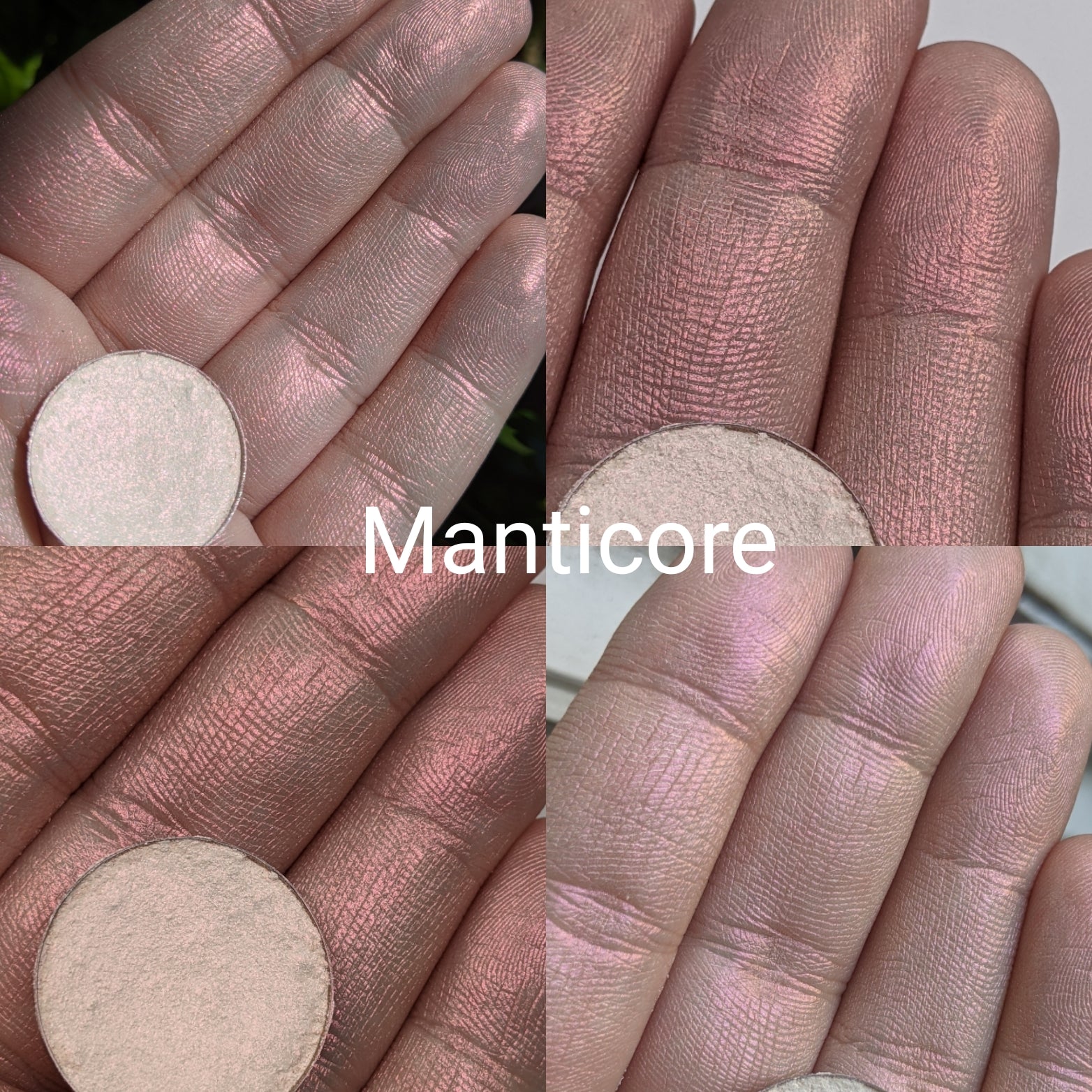 Manticore is a transparent multichrome that appears white in the pan but bursts into colors once you swipe it onto your skin. That makes this a perfect highlight for the face and eyes, or use it on top of other colors to add some dimension! Manticore has more subtle shifts that go from red then into the coppery golds. Each eyeshadow pan is magnetic and comes in 26mm, the size of a quarter. This is a pressed product, making it easy to apply with your favorite brush or even your finger.