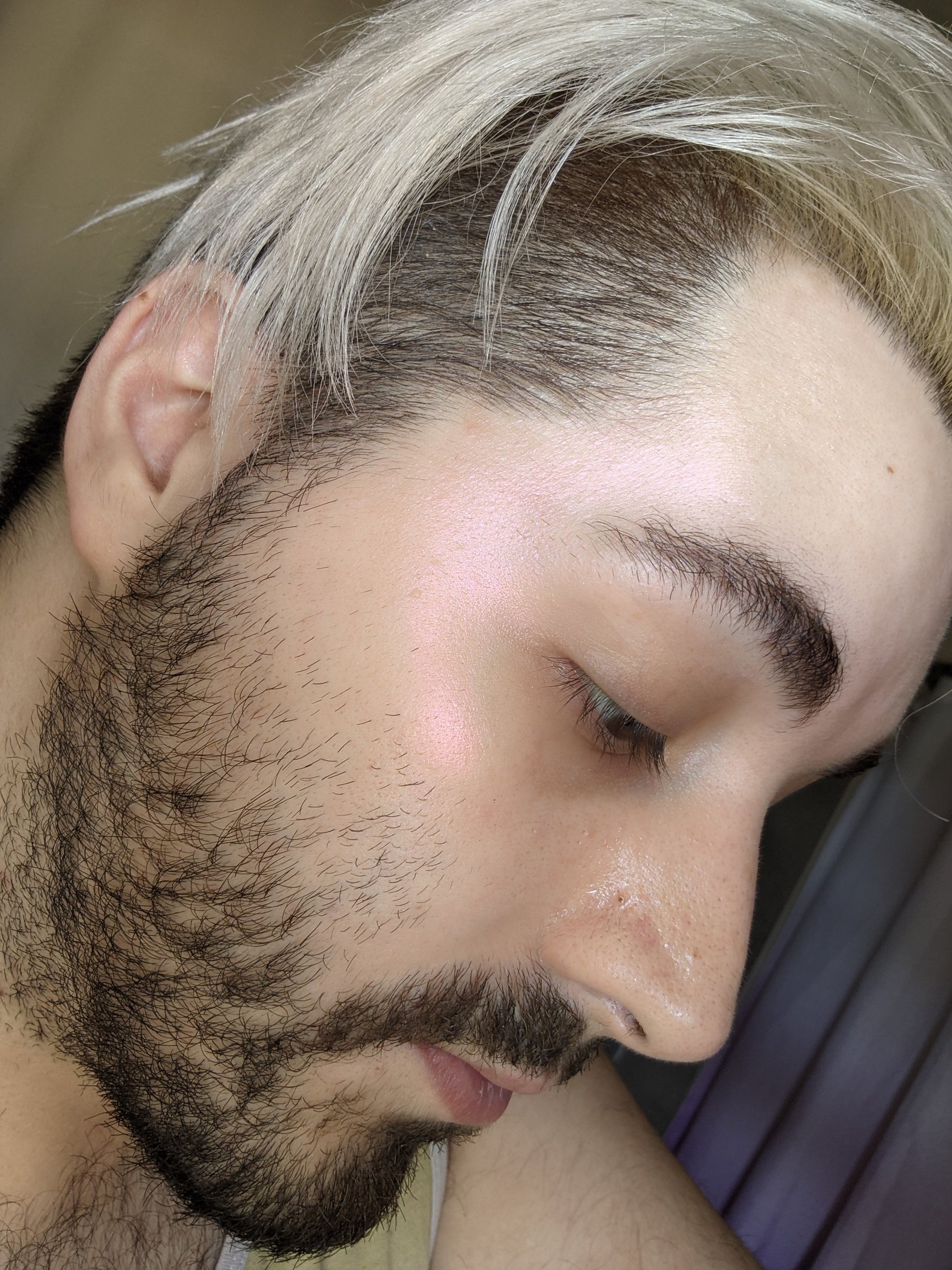 I am a Maybelline FitMe in 355. This highlighter looks amazing on my skin tone and with a fluffy brush it buffs out to look amazing on my textured skin.