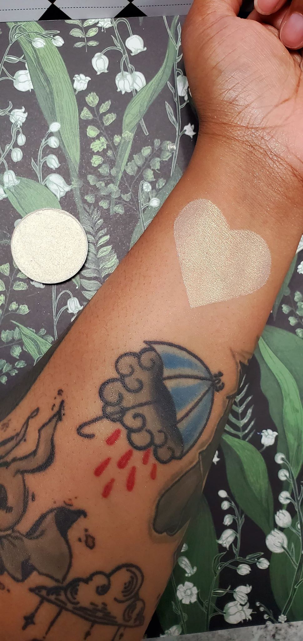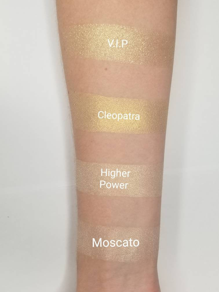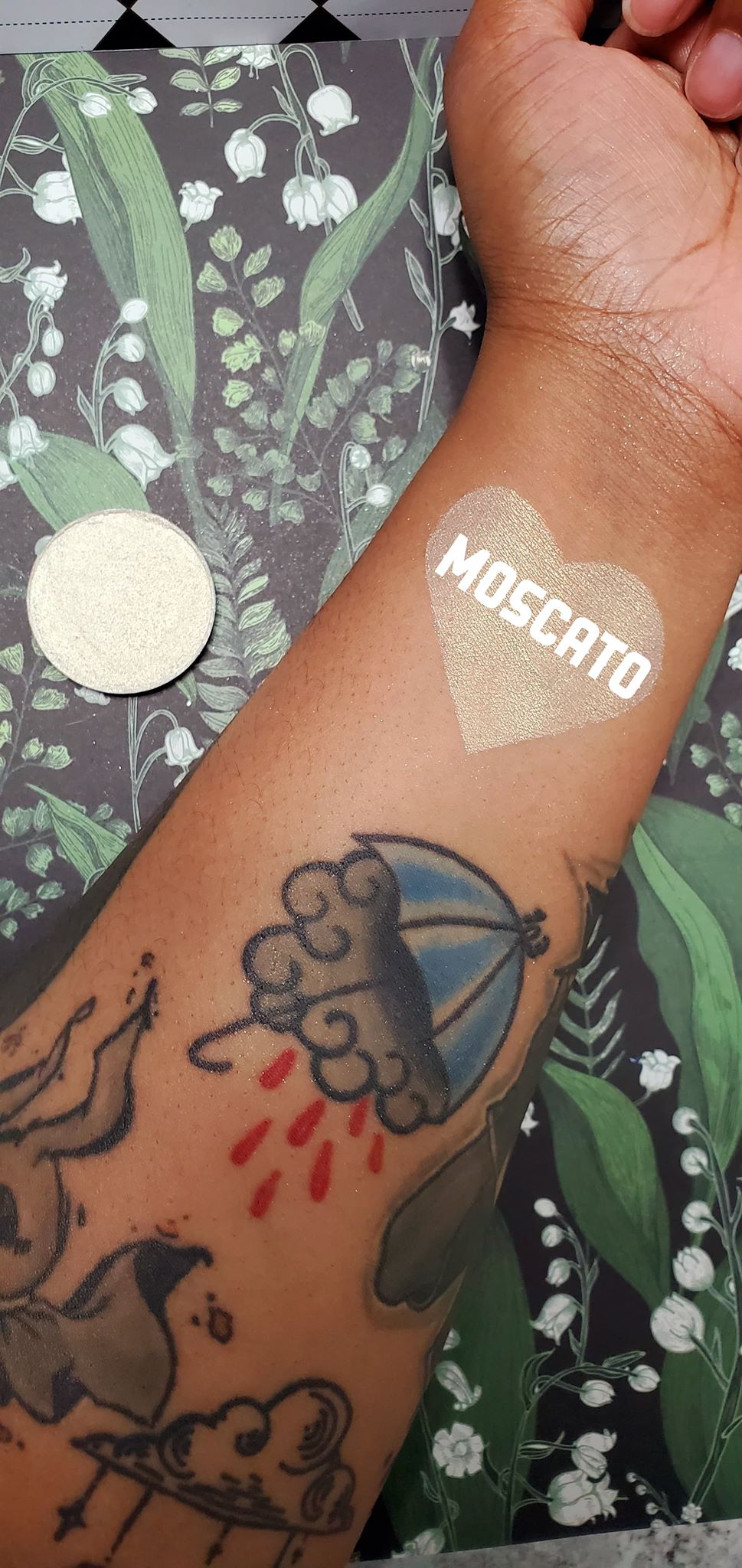 Moscato is a soft coppery gold highlighter! I find that this color also makes an amazing body highlight for whenever you're feeling super extra. Each pan is magnetic and comes in 36mm size. This is a pressed product, making it easy to apply with your favorite brush or even your finger.