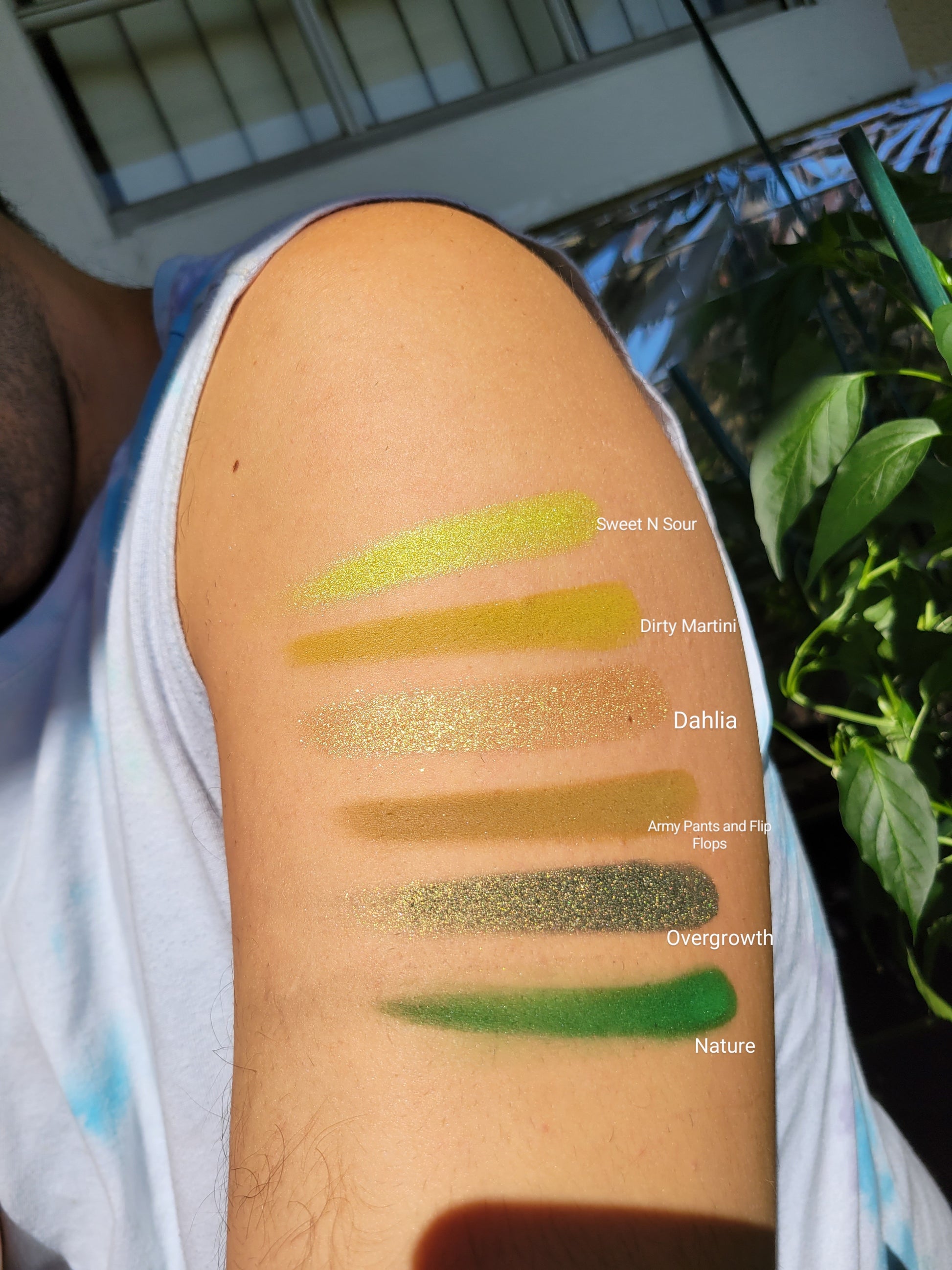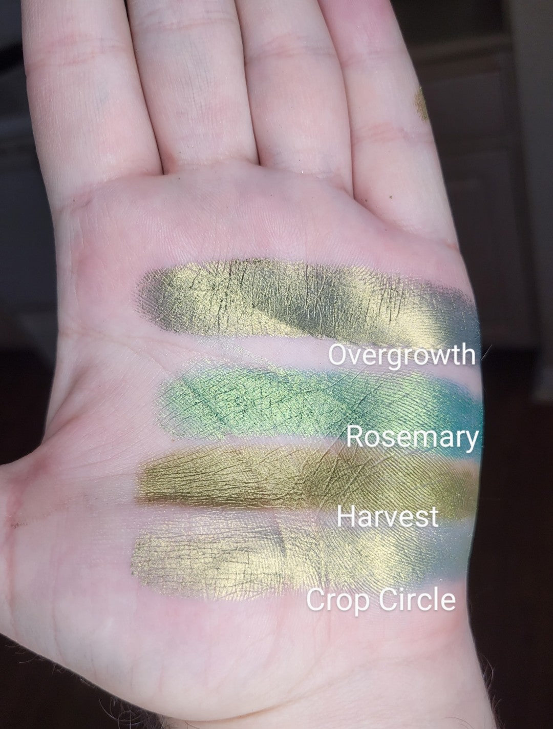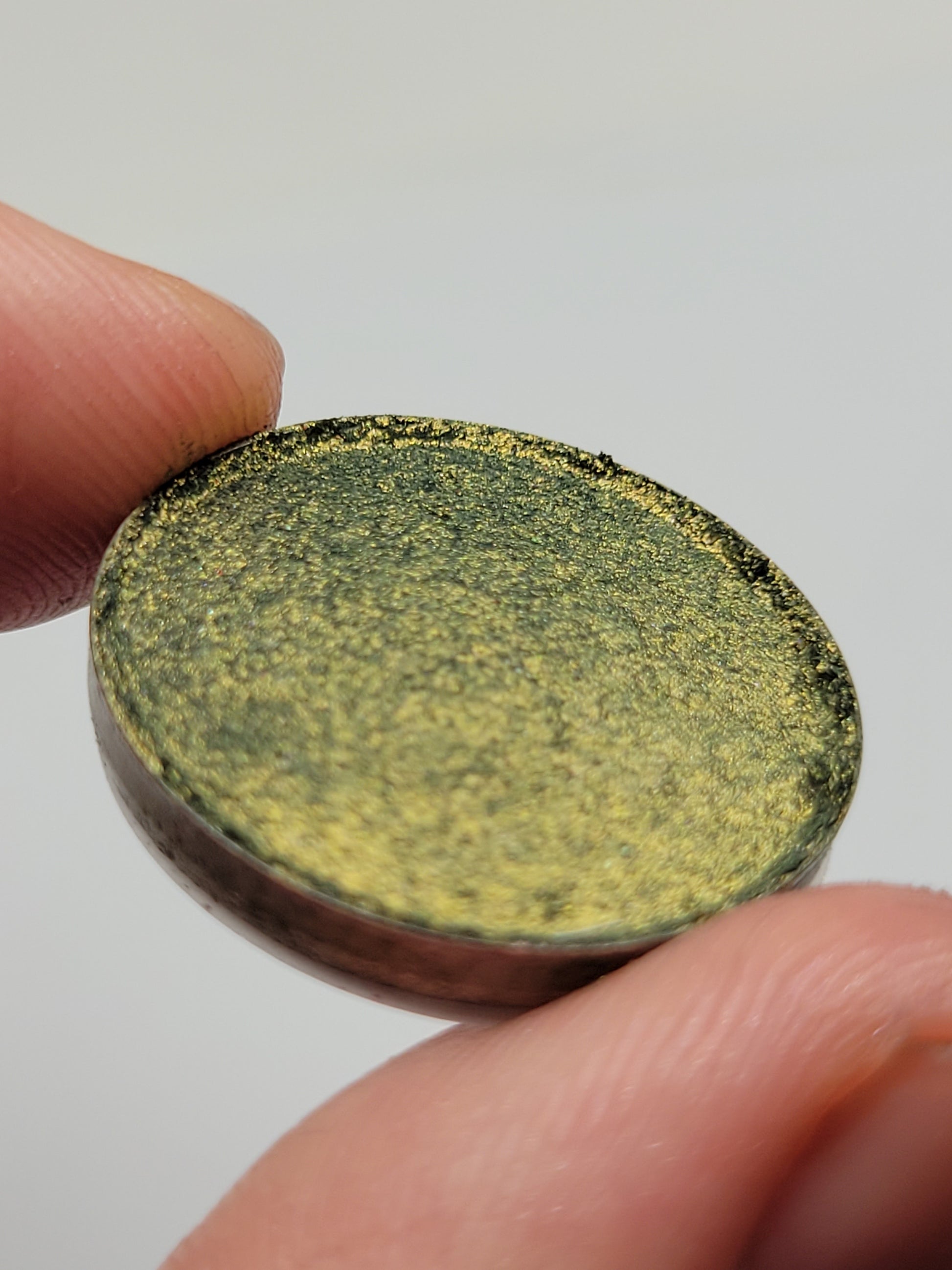 Overgrowth is a duochrome deep green eyeshadow with a bright gold shift. Each eyeshadow pan is magnetic and comes in 26mm, the size of a quarter. This is a pressed eyeshadow, making it easy to apply with your favorite brush or even your finger.