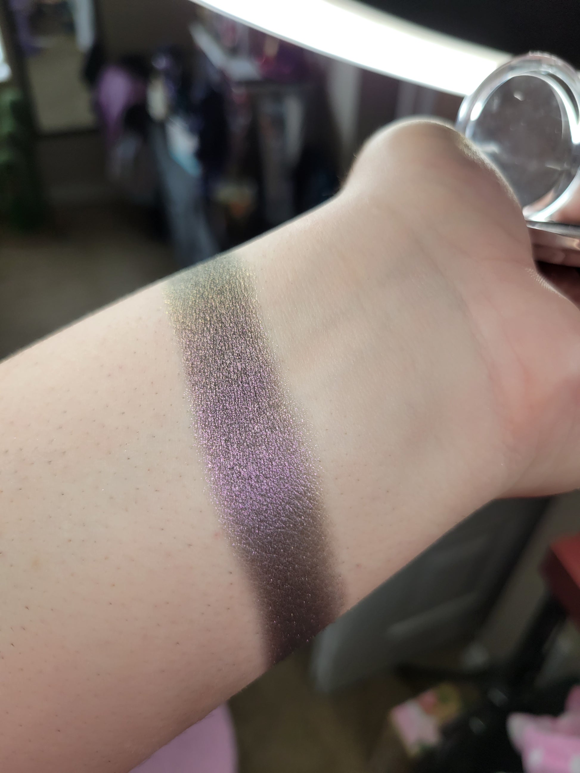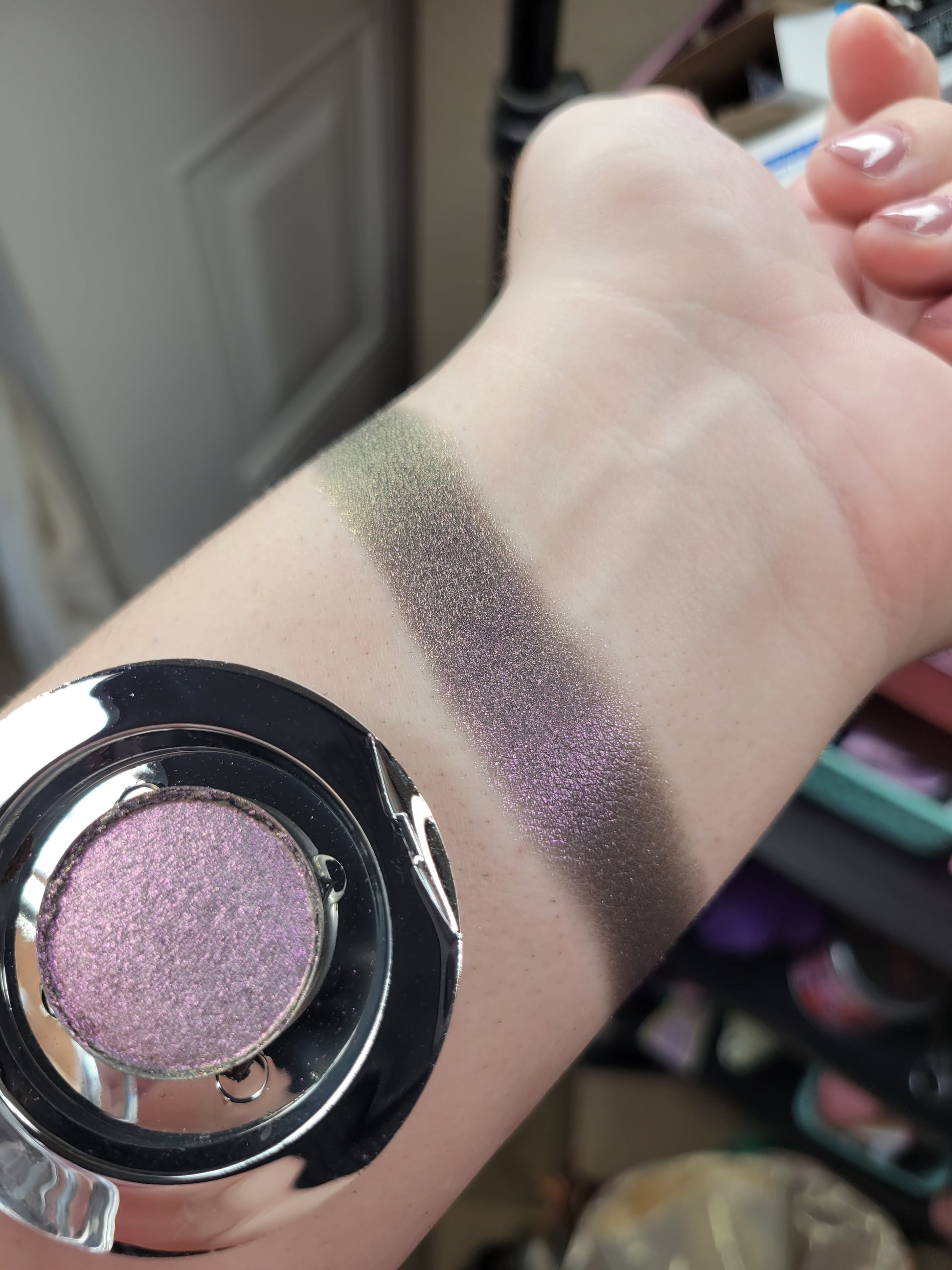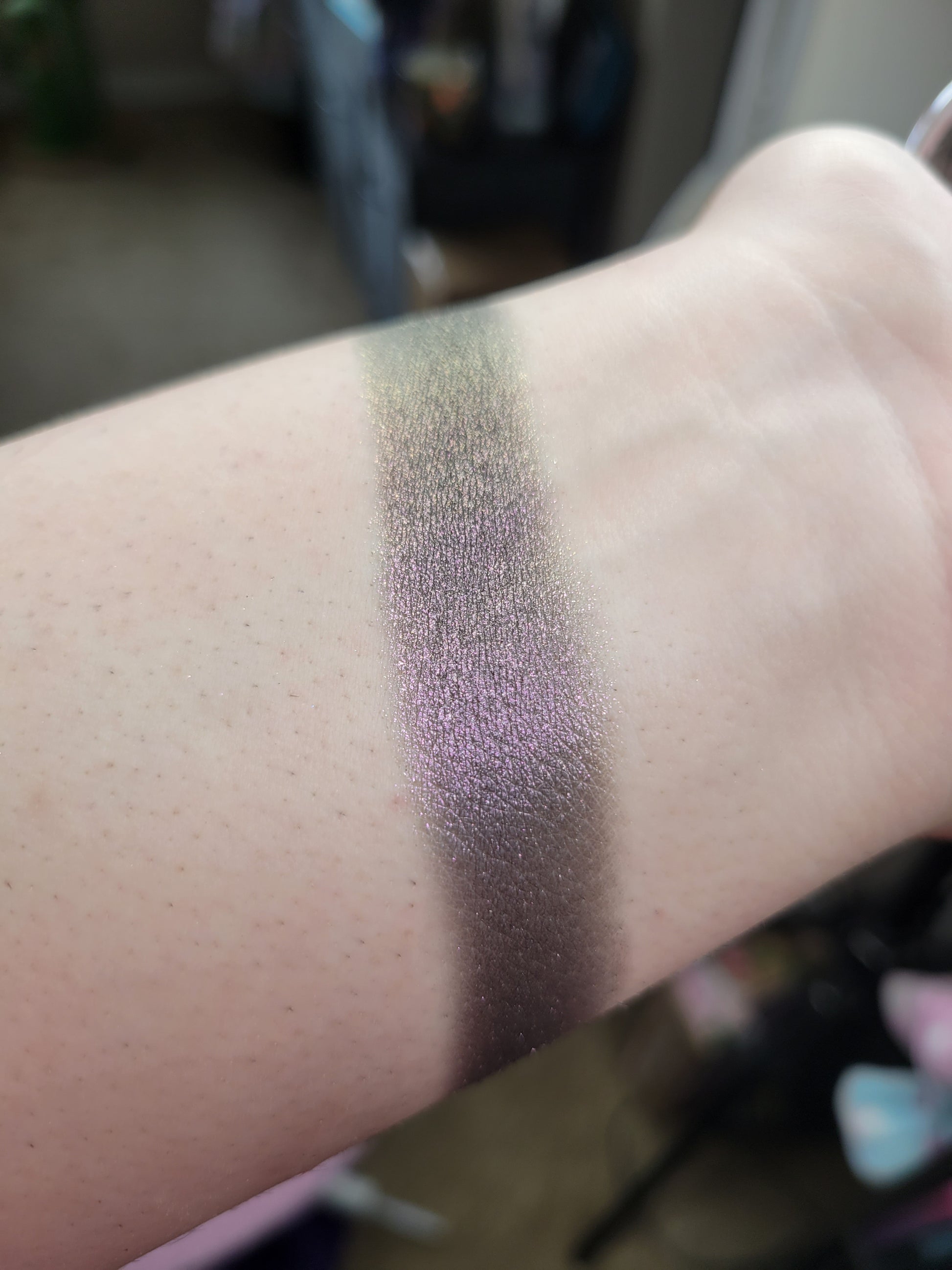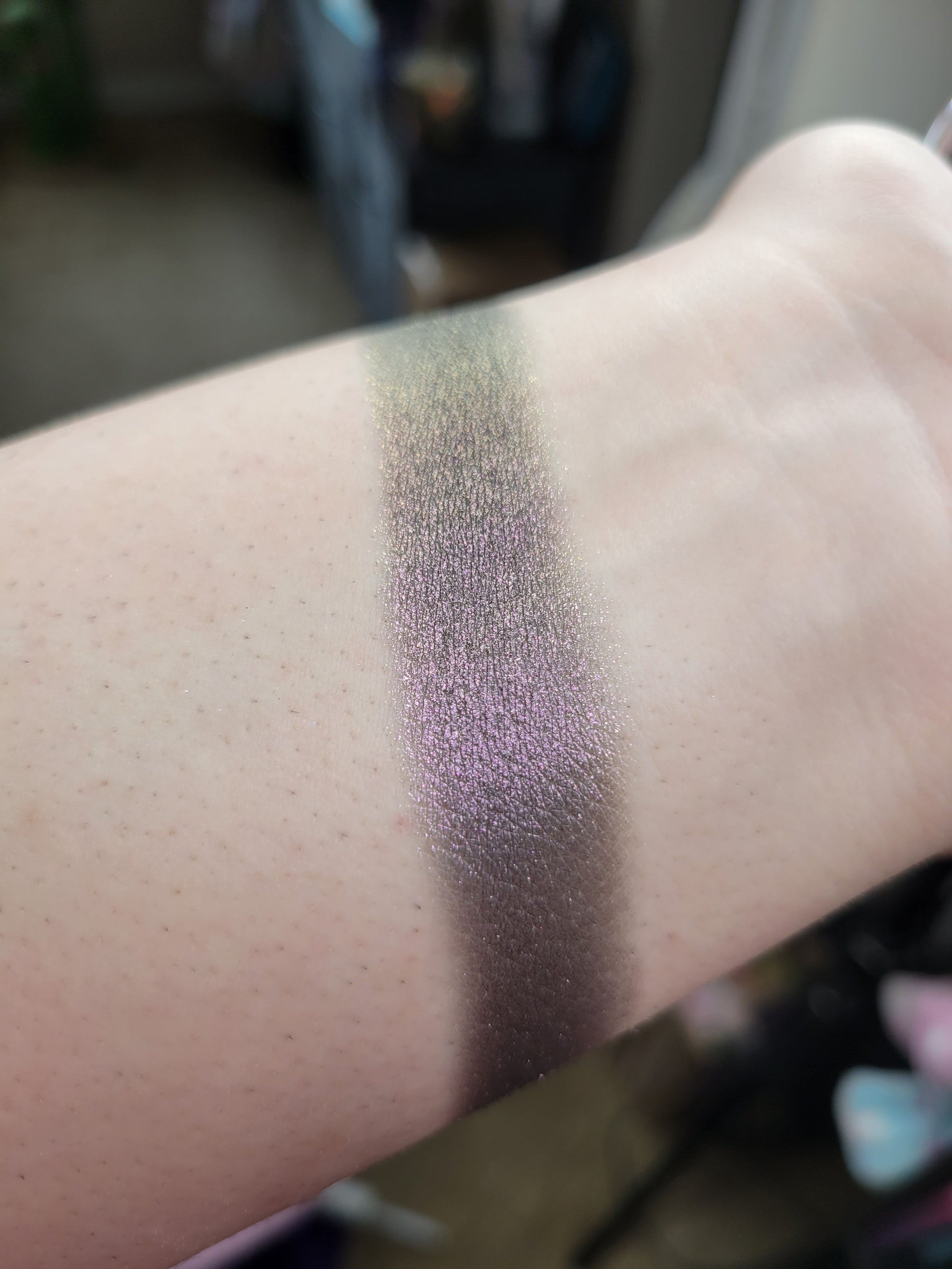 Penitent is a sparkly multichrome with a blackened base that shifts from a Red, Silvery grey to a gold green. Each pan is magnetic and comes in 26mm size. This is a pressed product, making it easy to apply with your favorite brush or even your finger.