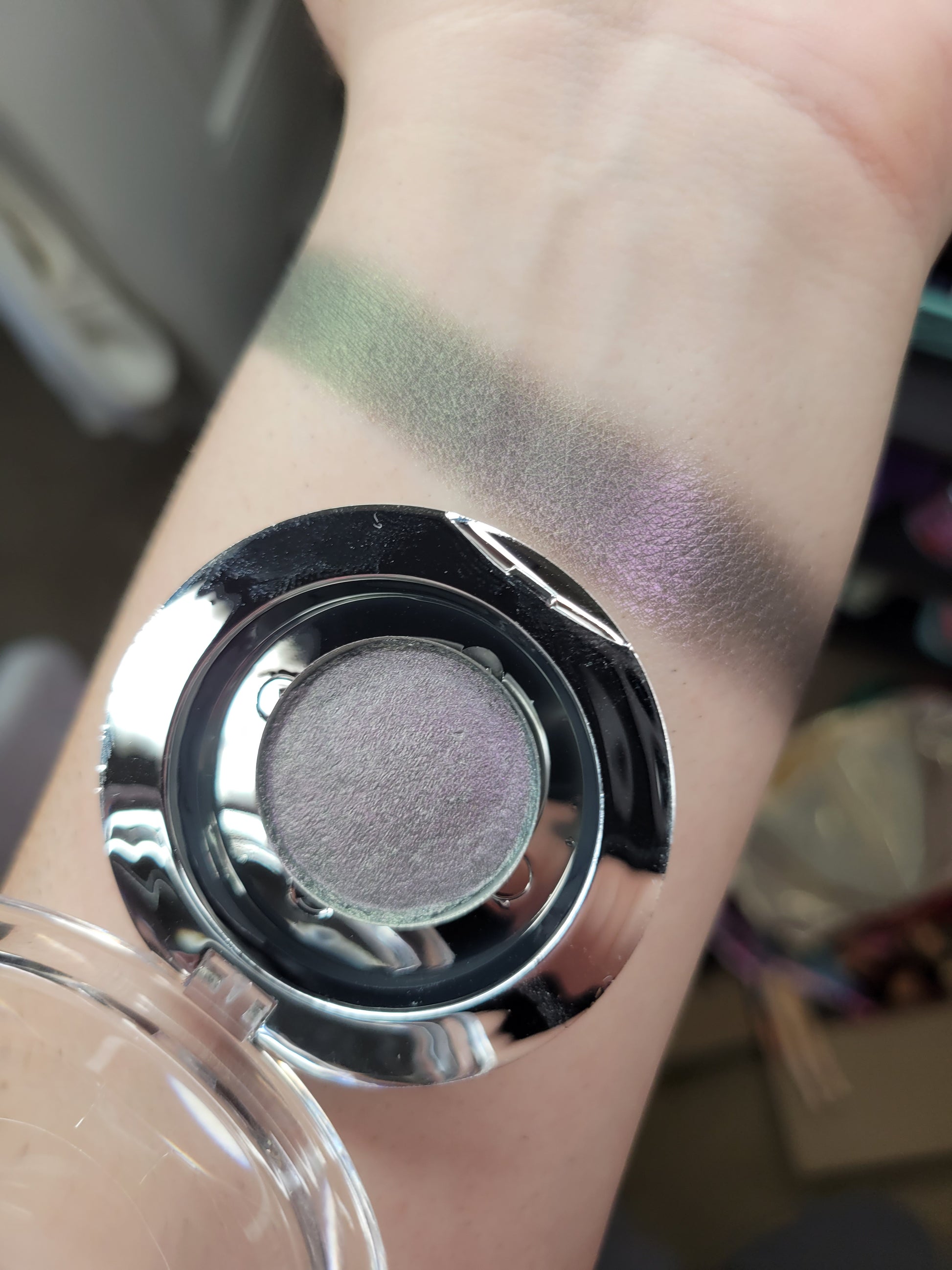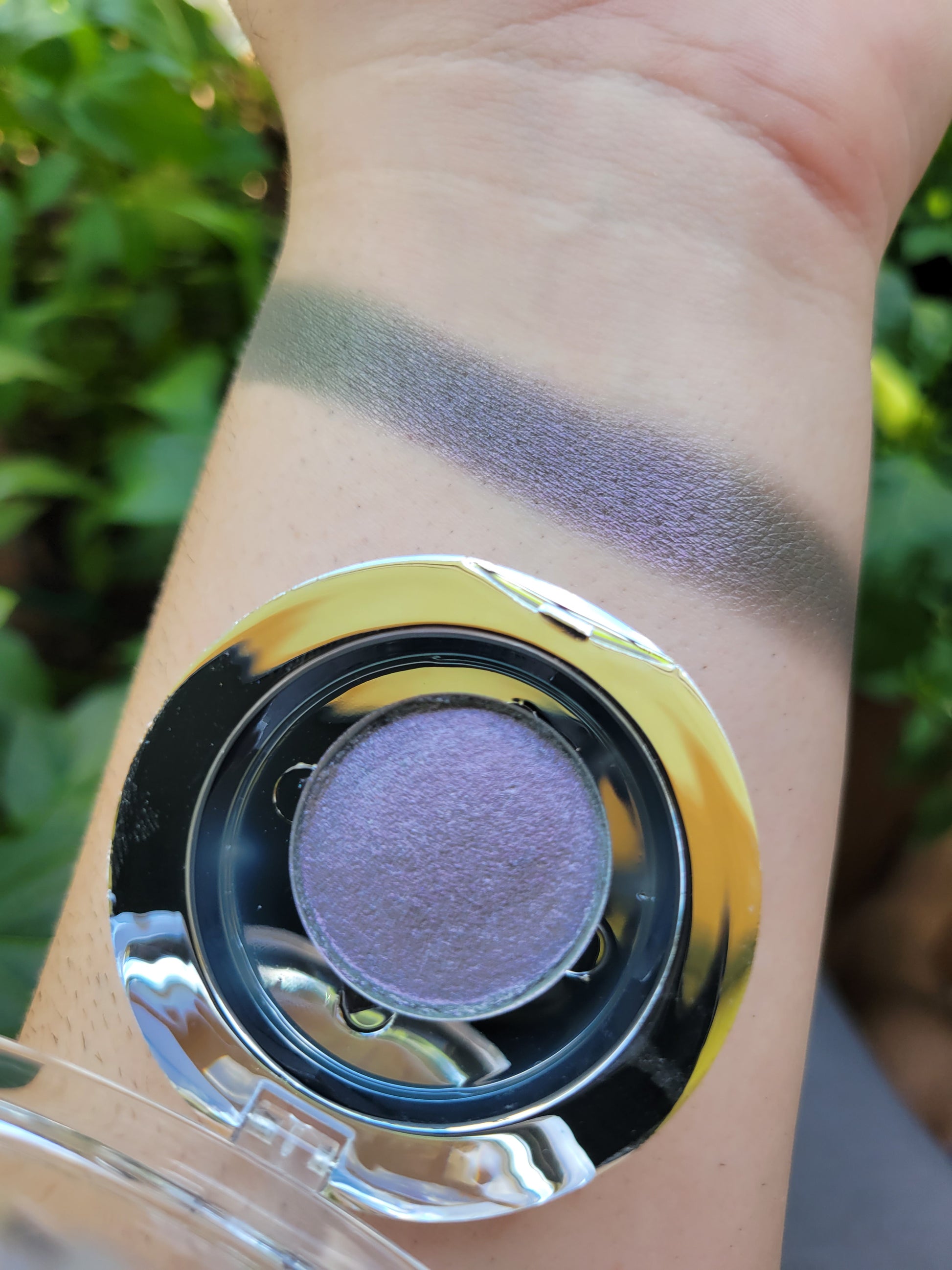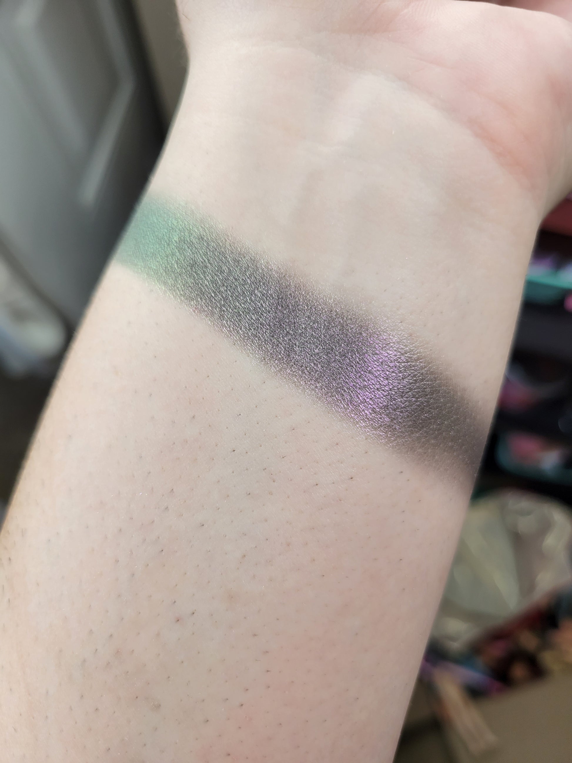 Rotfiend is a satin multichrome with a blackened base that shifts from a purplish pink, silvery grey, to green. Each pan is magnetic and comes in 26mm size. This is a pressed product, making it easy to apply with your favorite brush or even your finger.