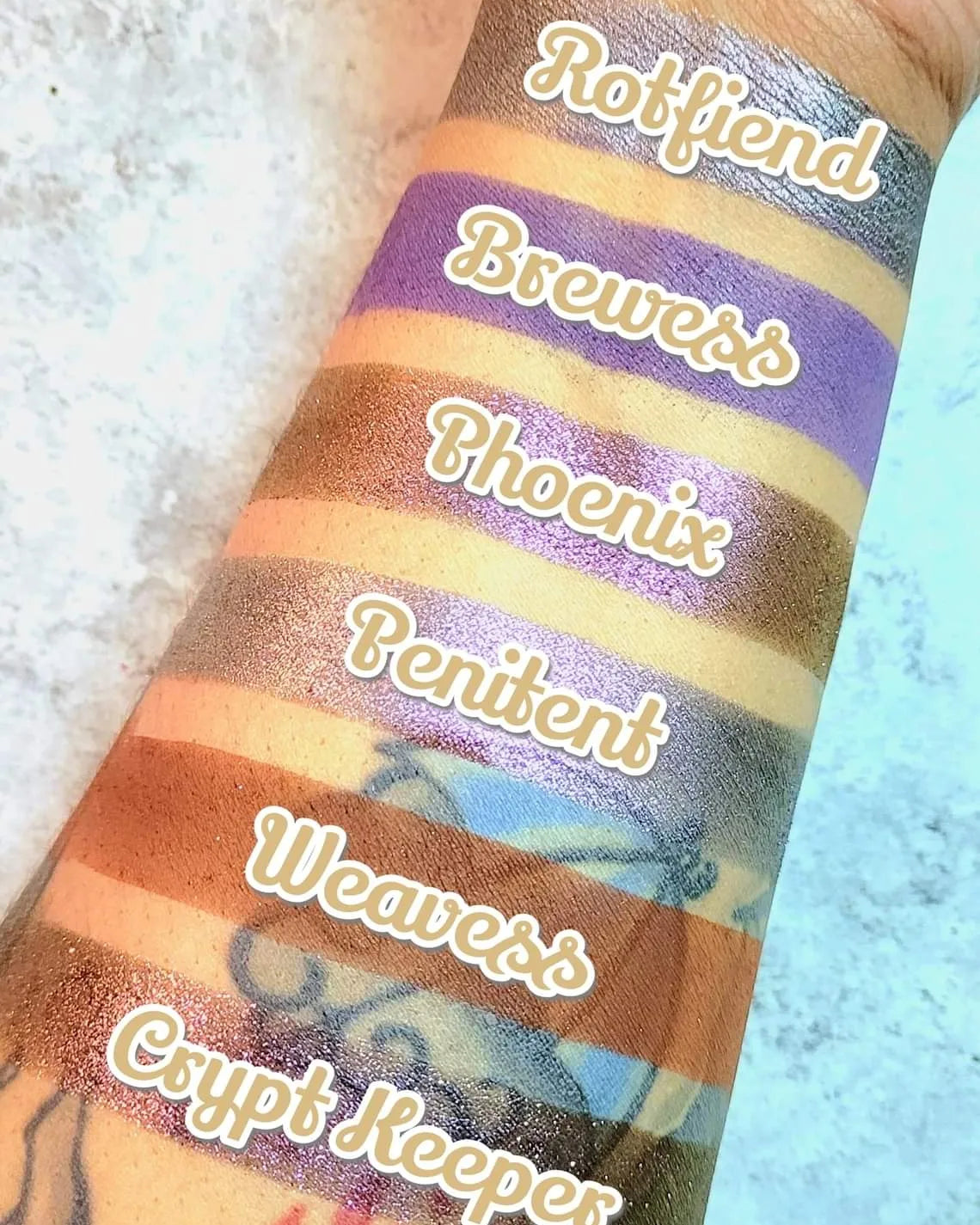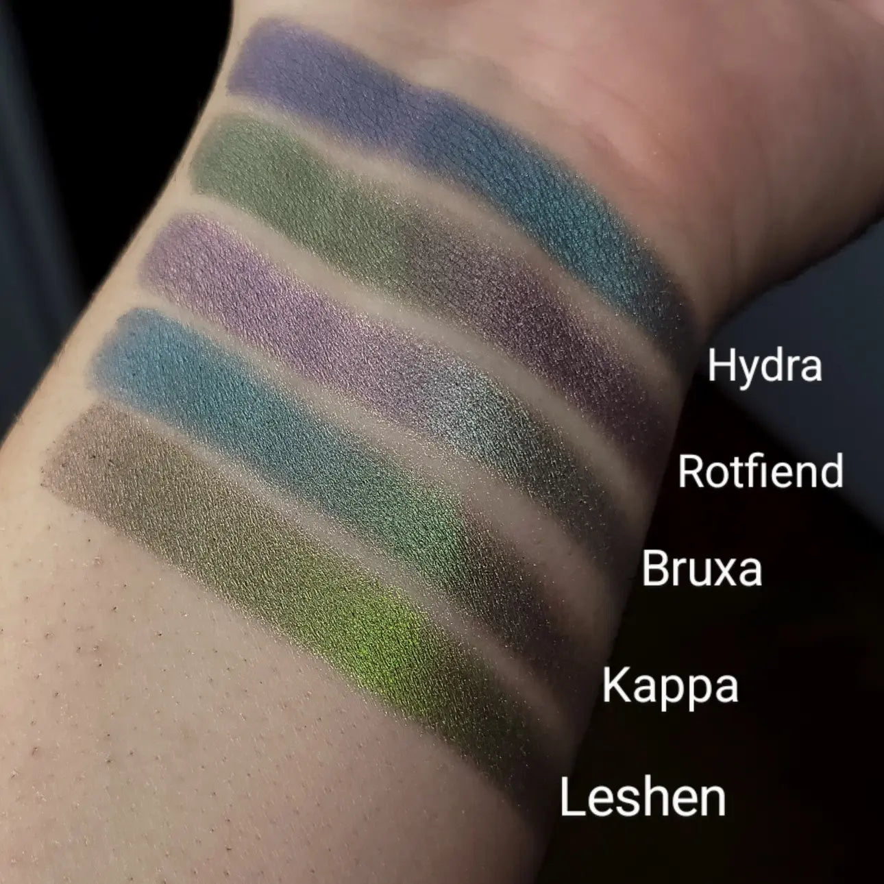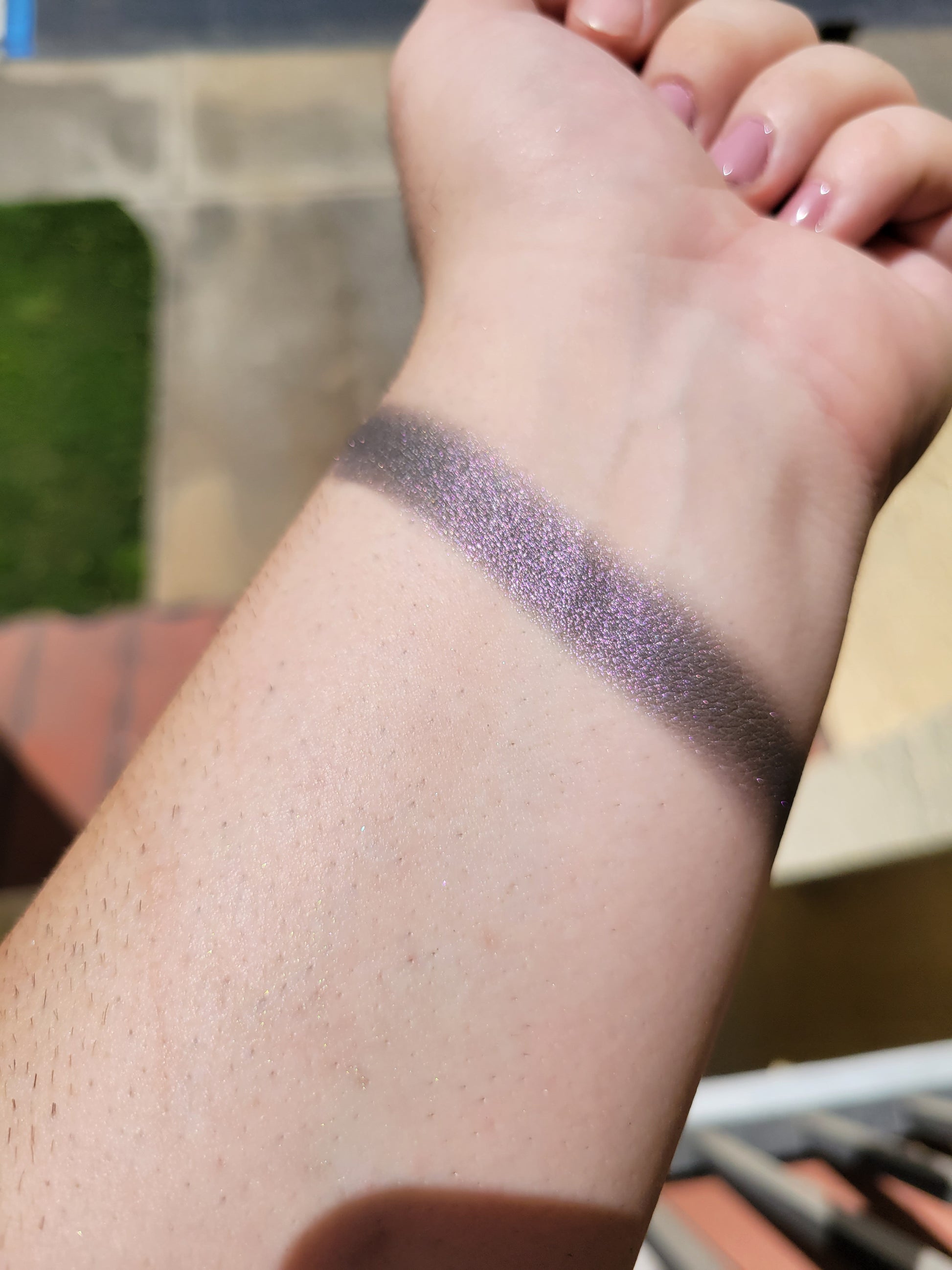 Rotfiend is a satin multichrome with a blackened base that shifts from a purplish pink, silvery grey, to green. Each pan is magnetic and comes in 26mm size. This is a pressed product, making it easy to apply with your favorite brush or even your finger.