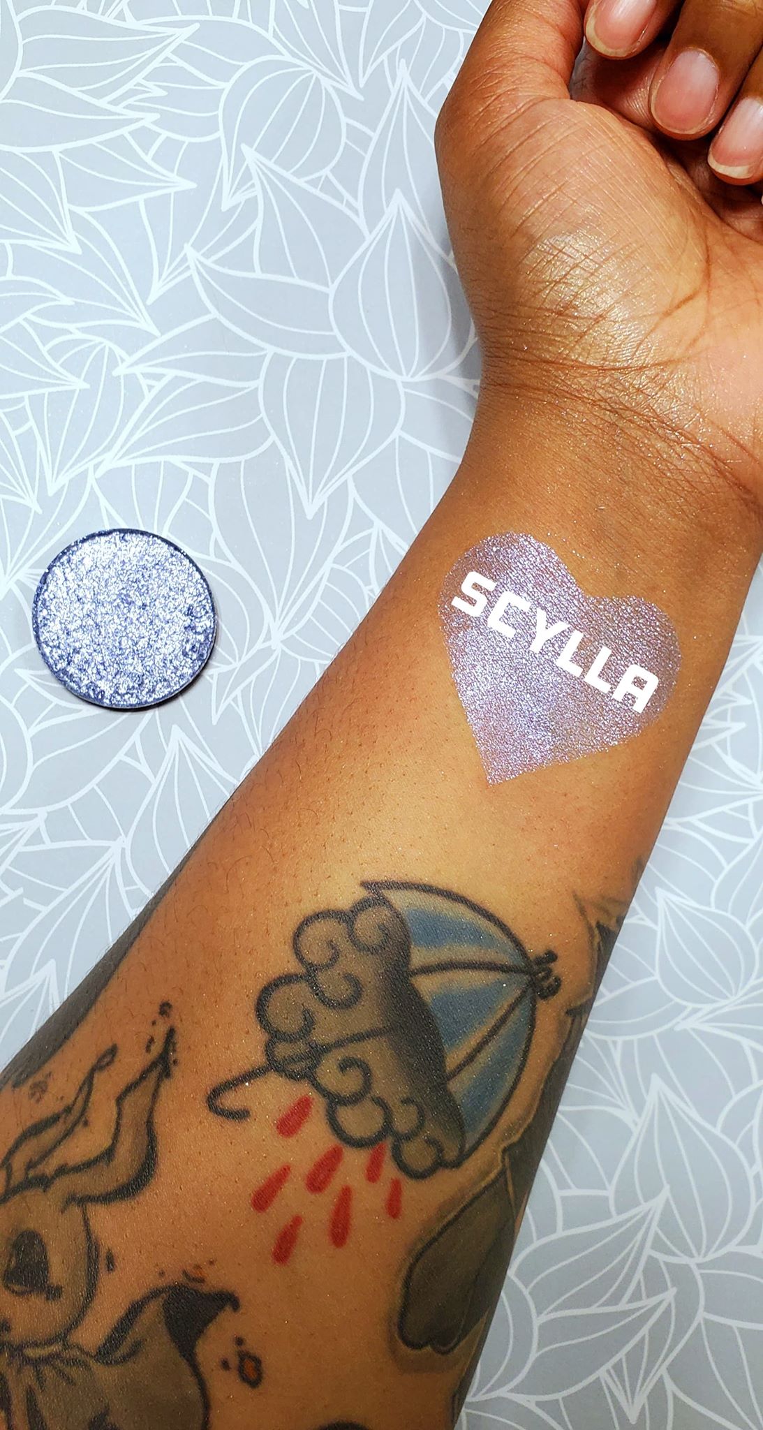 Scylla is a super sparkly blue highlighter with plenty of pigment and glow to double as an eye shadow! These highlighters have the look and feel of a flakey type glitter, but without the plastic and much softer! Because of how sparkly these are, I recommend using your finger to apply however a brush will still work fine! Each pan is magnetic and comes in 36mm size. This is a pressed product.