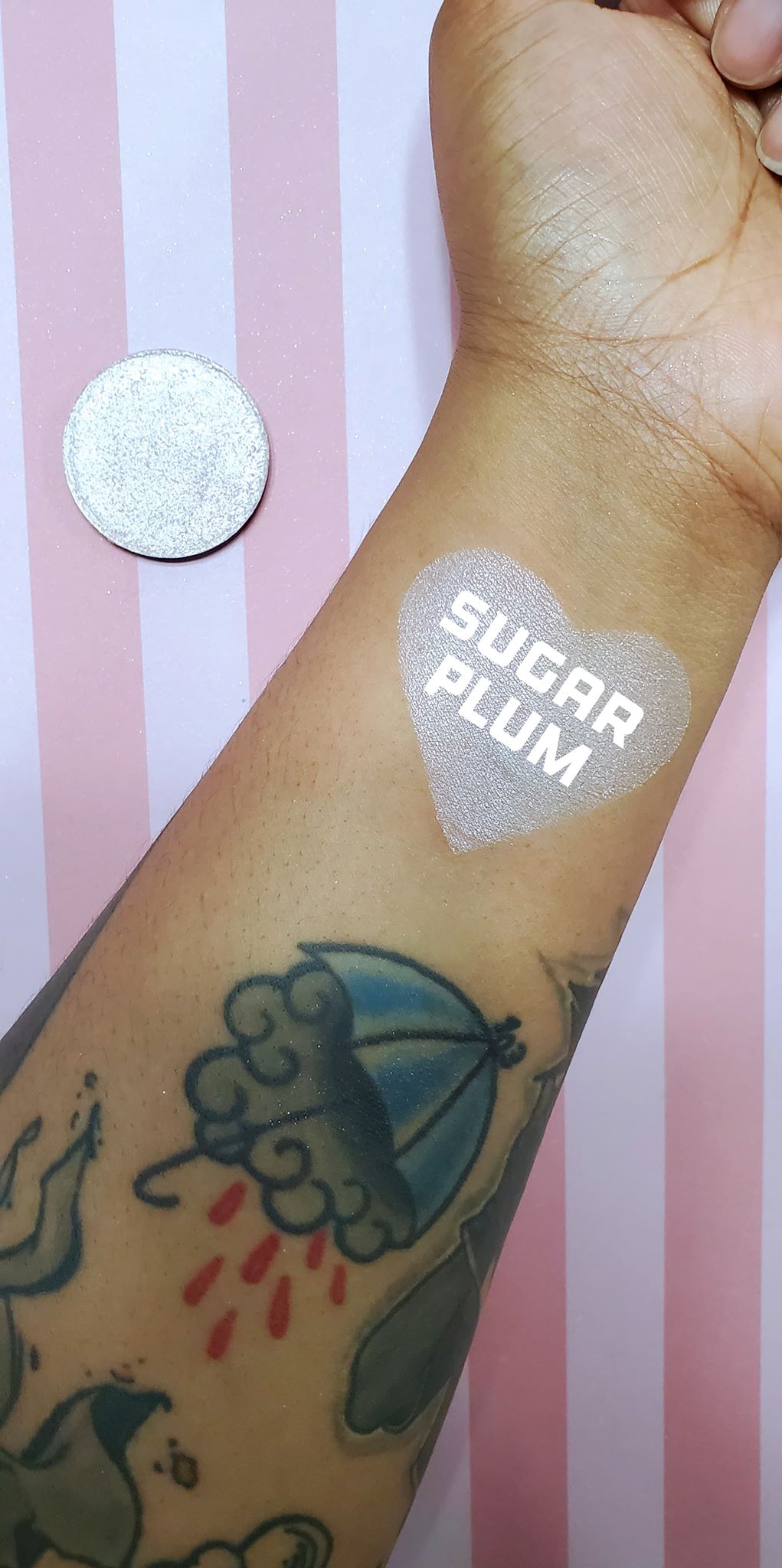 Sugar Plum is a pink highlight with hues of purple sparkles that shine in the light, making it look just like a sweet candied sugar plum. Each pan is magnetic and comes in 36mm size. This is a pressed product, making it easy to apply with your favorite brush or even your finger.
