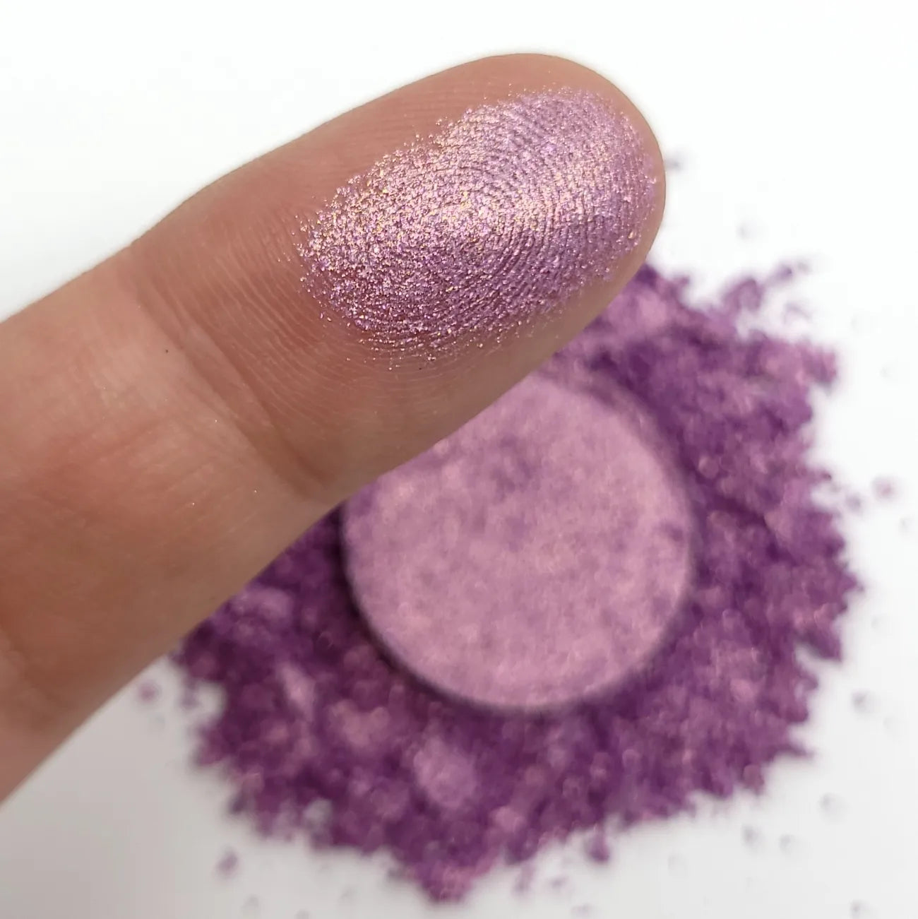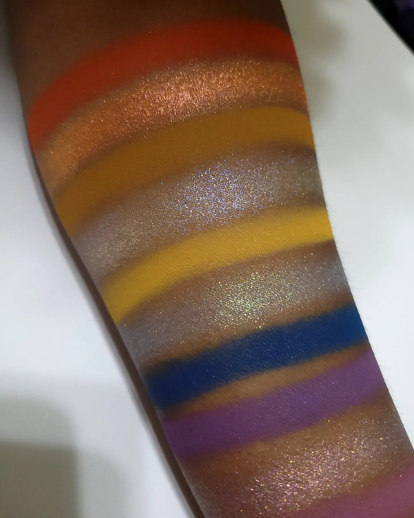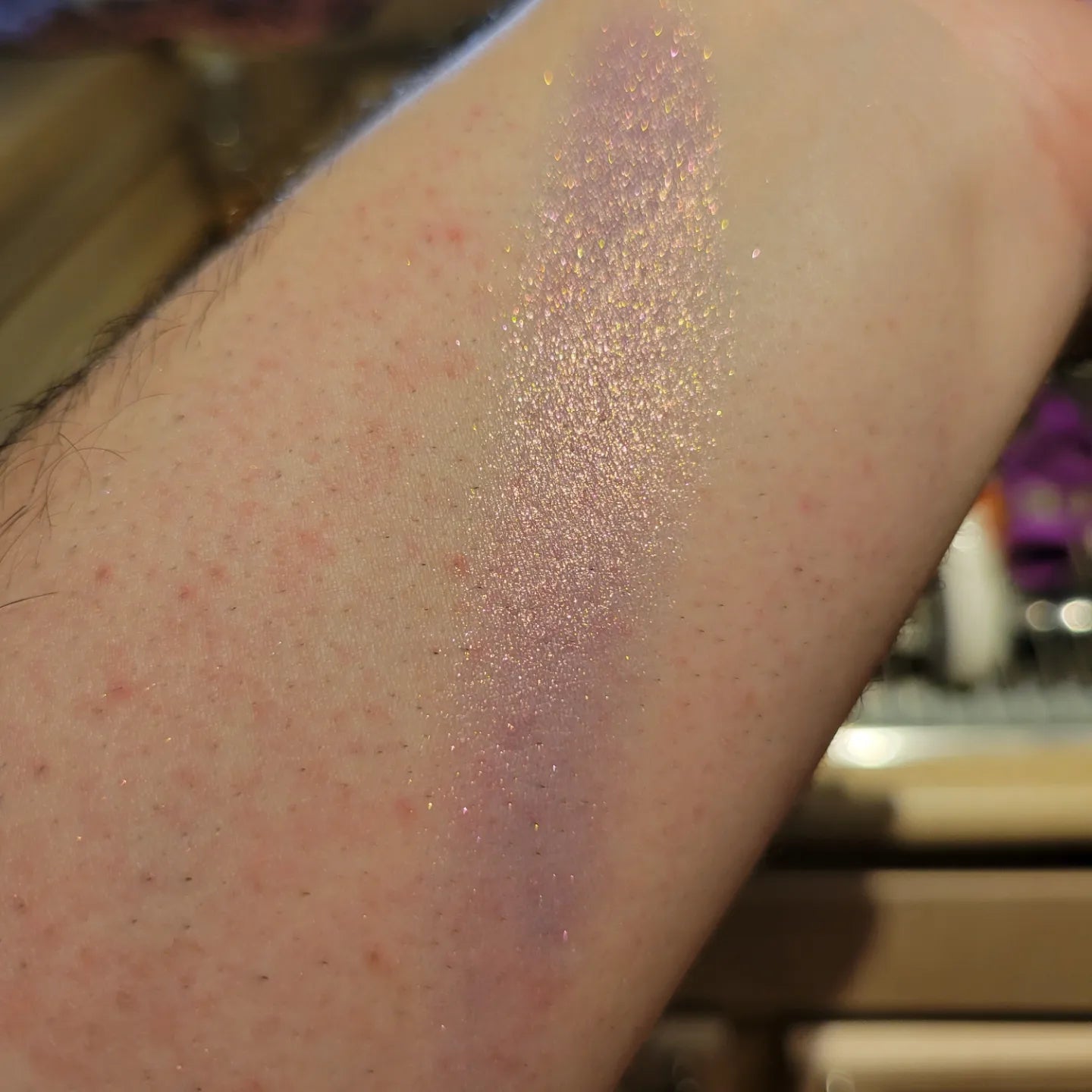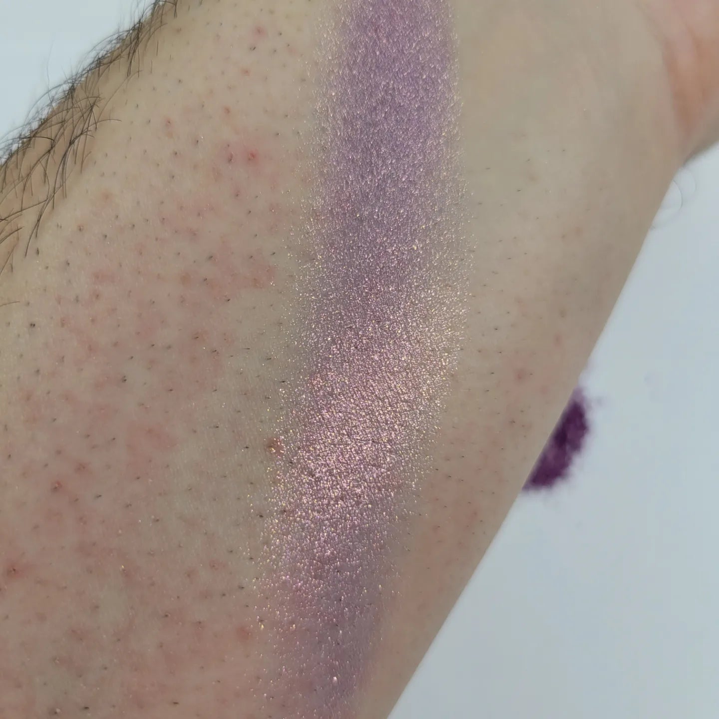The swatch photos on the website are pretty accurate. The violet base on this shadow is in between sheer & opaque, and the micro sparkles add a pretty sheen. I really like this shade because I've seen a lot of purples that have a gold flip from various brands, but this is the first one I've seen that includes a red flip, too. The formula is a bit dry & flaky/dusty; I recommend using a gripping primer or setting spray.