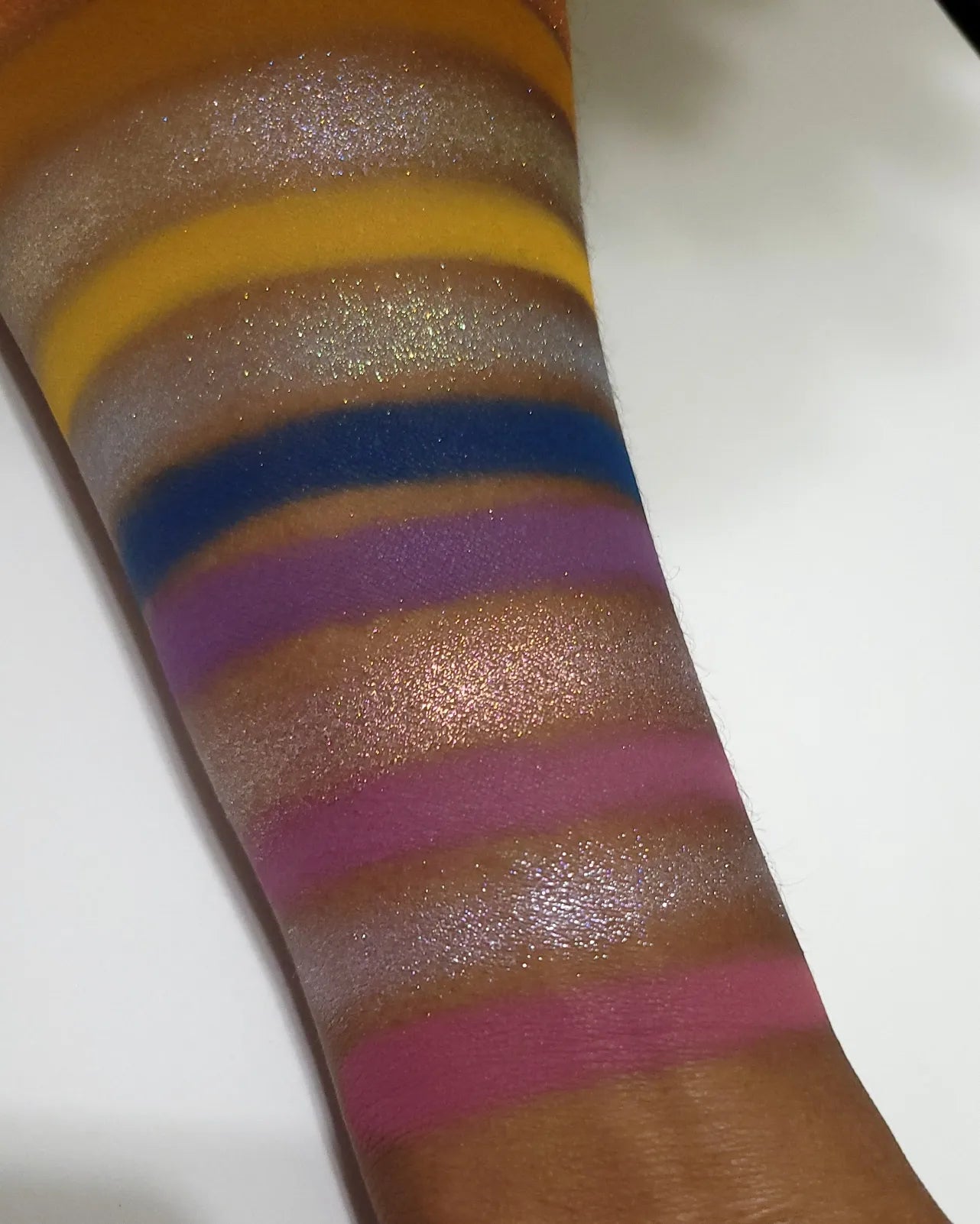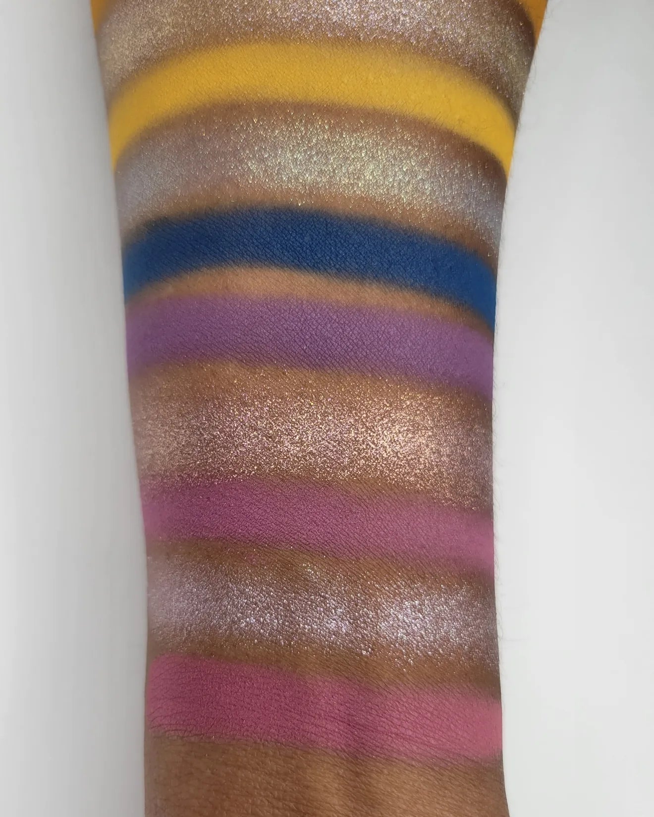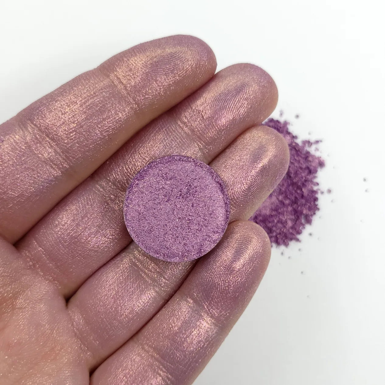 These are formulated with pure sparkle pigments with some added iron oxides to give them a base tone. The base is softer and lighter, making these very versatile for a topper, or foiled/layered for a more intense look. I recommend applying these with your finger, or a stiff brush.