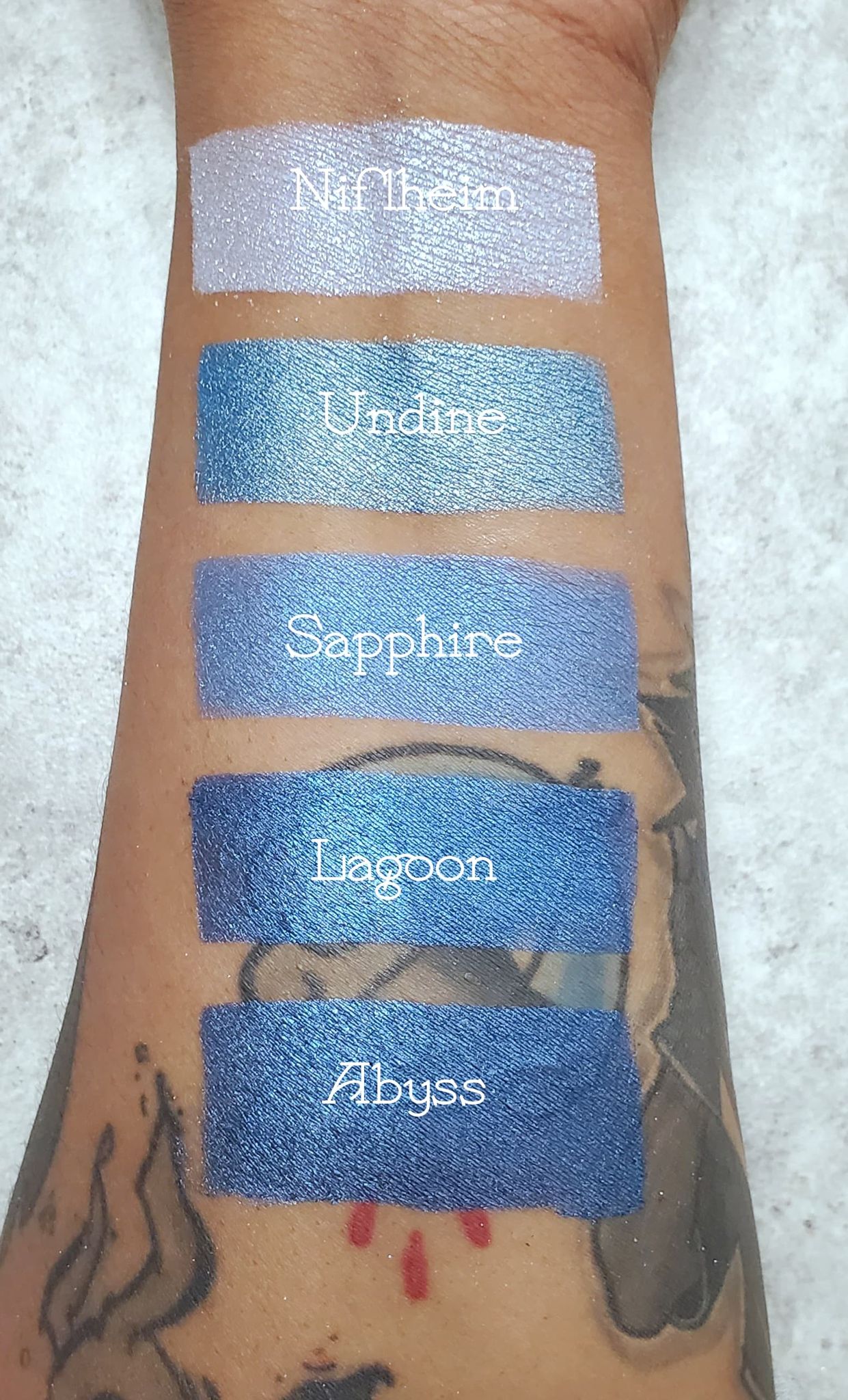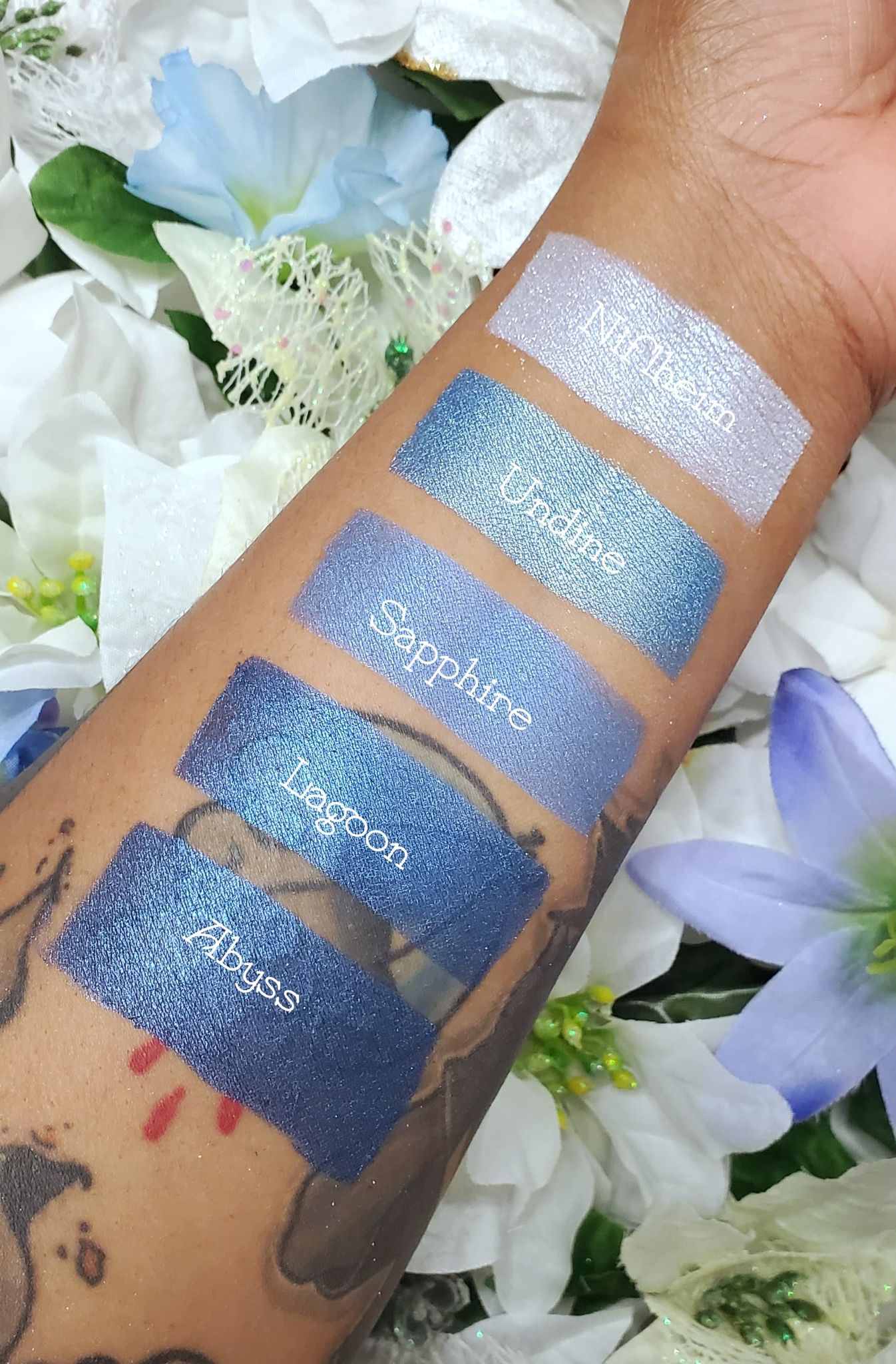 Abyss is a deep blue eye shadow with a black undertone. Blue sparkles against the black really give this color a deep dark underwater vibe. Each eyeshadow pan is magnetic and comes in 26mm, the size of a quarter. This is a pressed product, making it easy to apply with your favorite brush or even your finger.