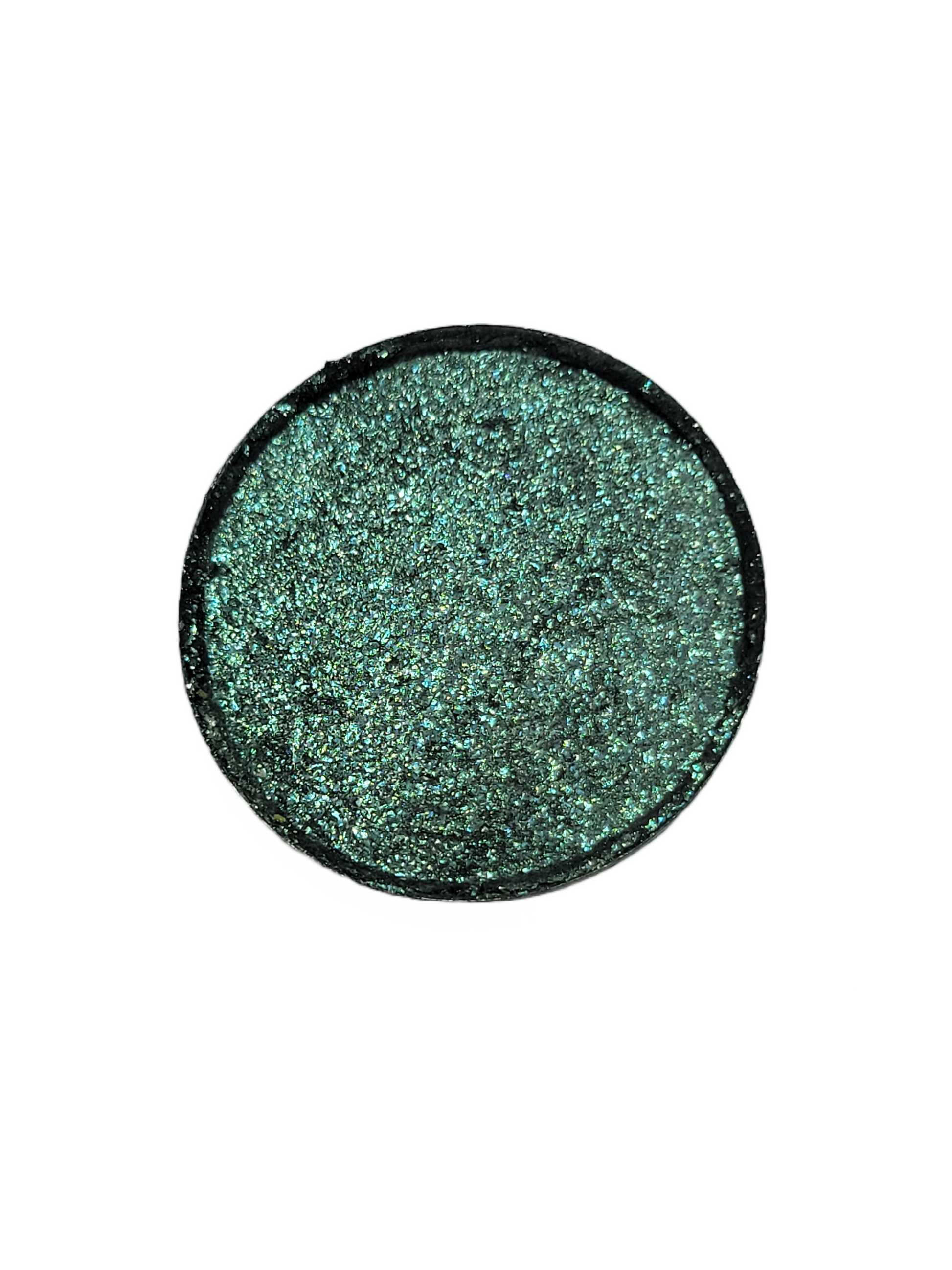 Buzzing Buffet - grey green based shimmer loaded with mint green teal flakey shimmer. medium textured with lots of different particle sizes.