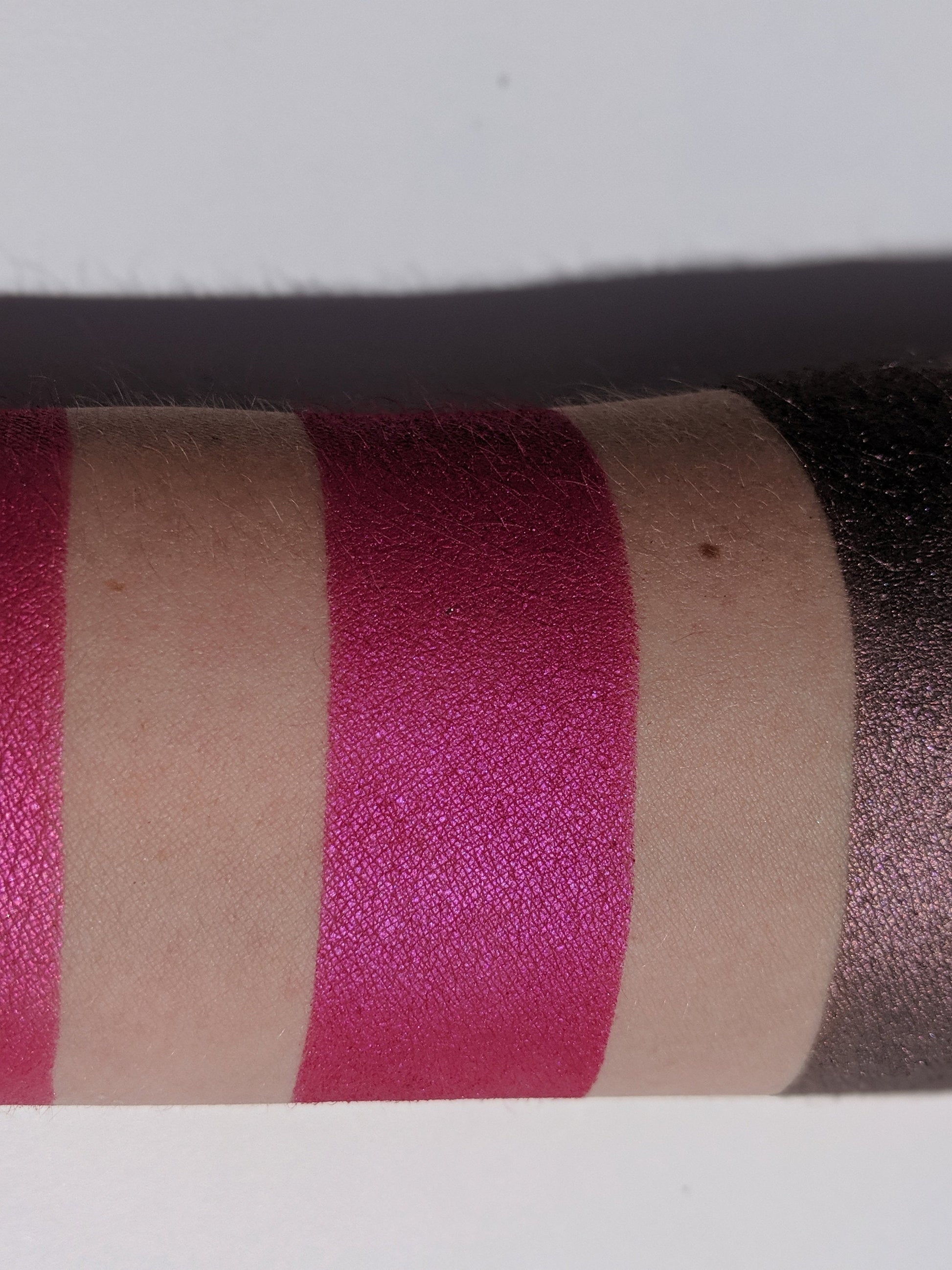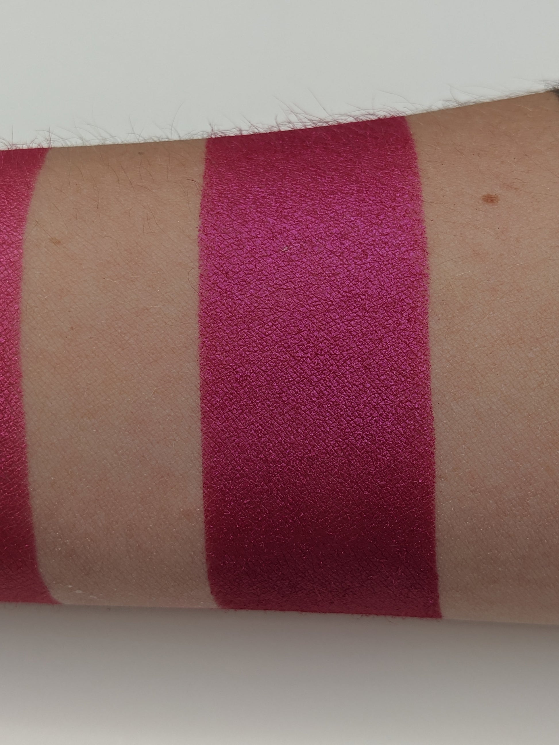 Harlot is a beautiful mix between a pink and purple creating a lovely magenta with a satin finish! You can even notice some blue undertones in some lighting. Each eyeshadow pan is magnetic and comes in 26mm, the size of a quarter. This is a pressed product, making it easy to apply with your favorite brush or even your finger.
