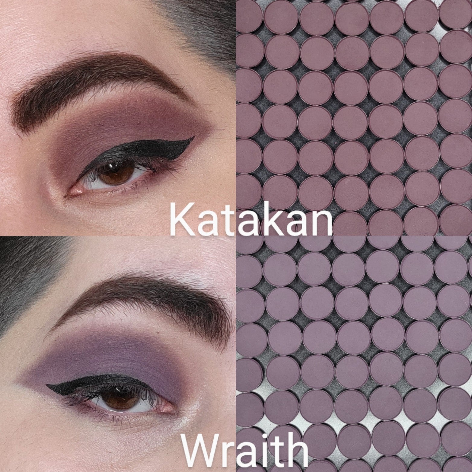 Katakan is a grey taupe matte eyeshadow with violet/pink undertones. Use your favorite primer to make these mattes POP! Each eyeshadow pan is magnetic and comes in 26mm, the size of a quarter. This is a pressed eyeshadow, making it easy to apply with your favorite brush or even your finger. My mattes are formulated to have a bit of kickup but are very pigmented, a little goes a long way!