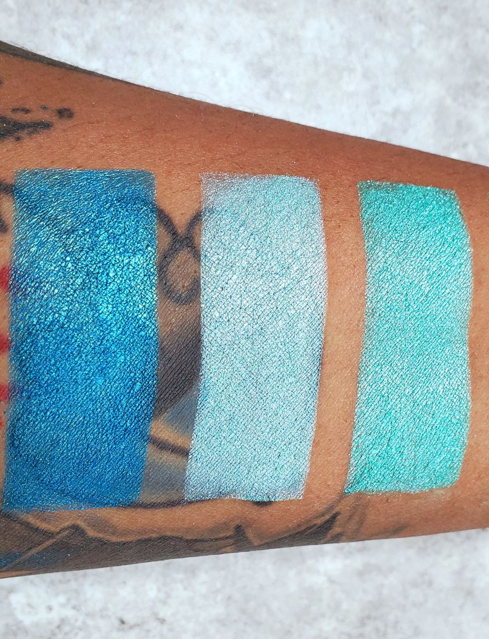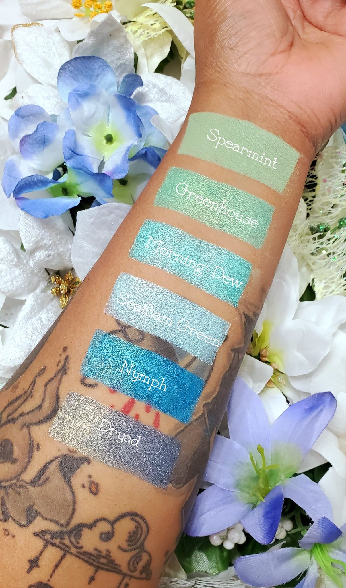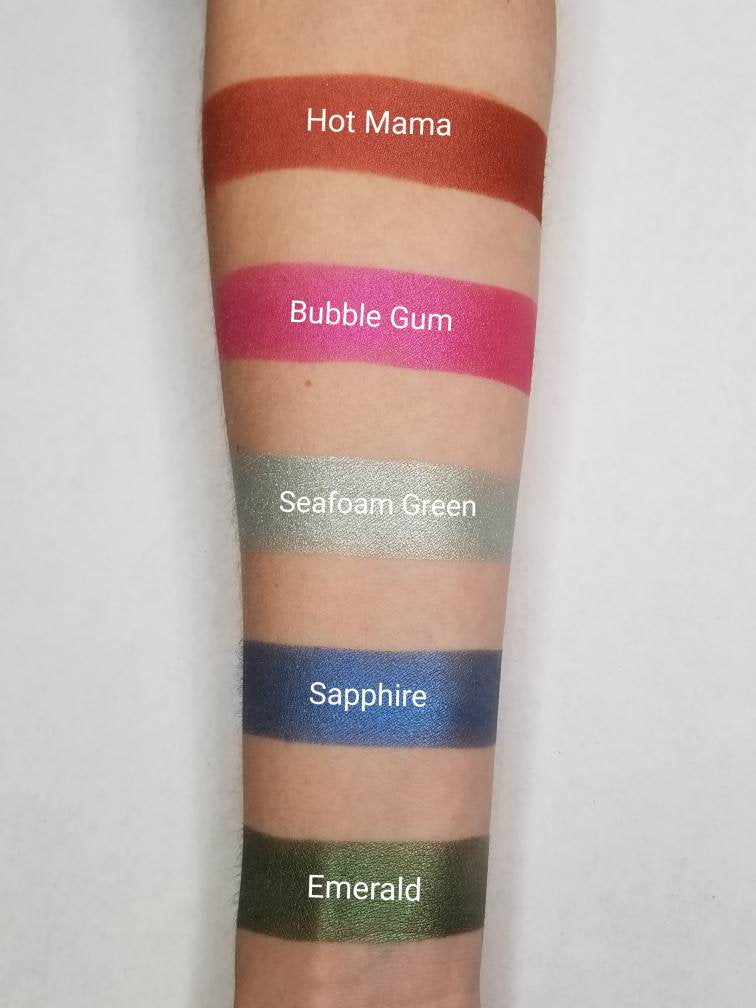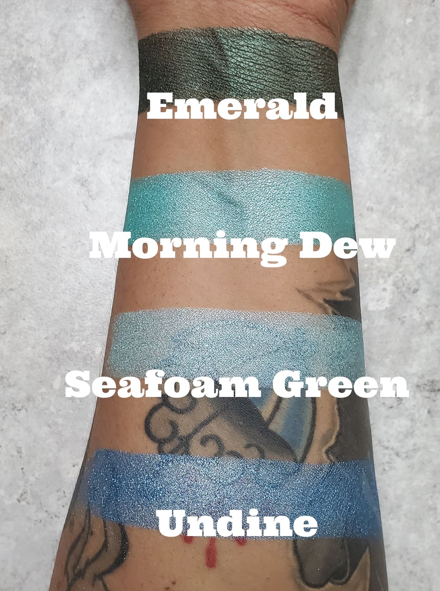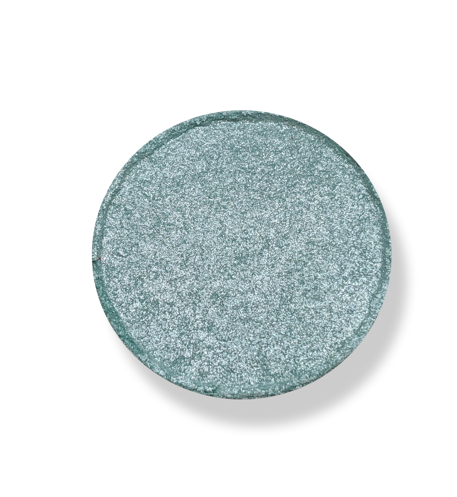 Sea-foam green is a soft pearlescent green with a low shimmer. Each pan is magnetic and comes in 26mm size, which also includes the case in the picture to keep your product safe. This is a pressed product, making it easy to apply with your favorite brush or even your finger.